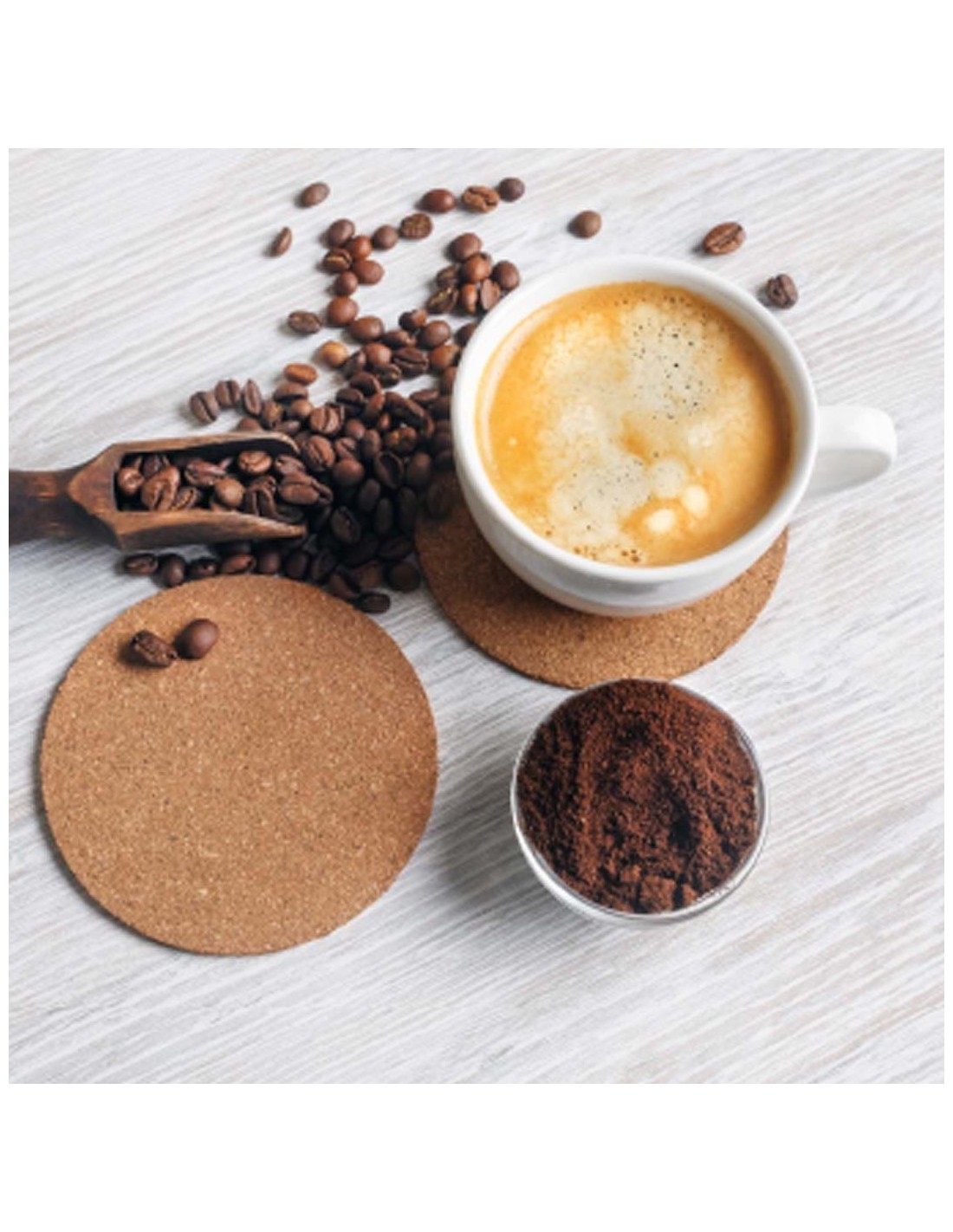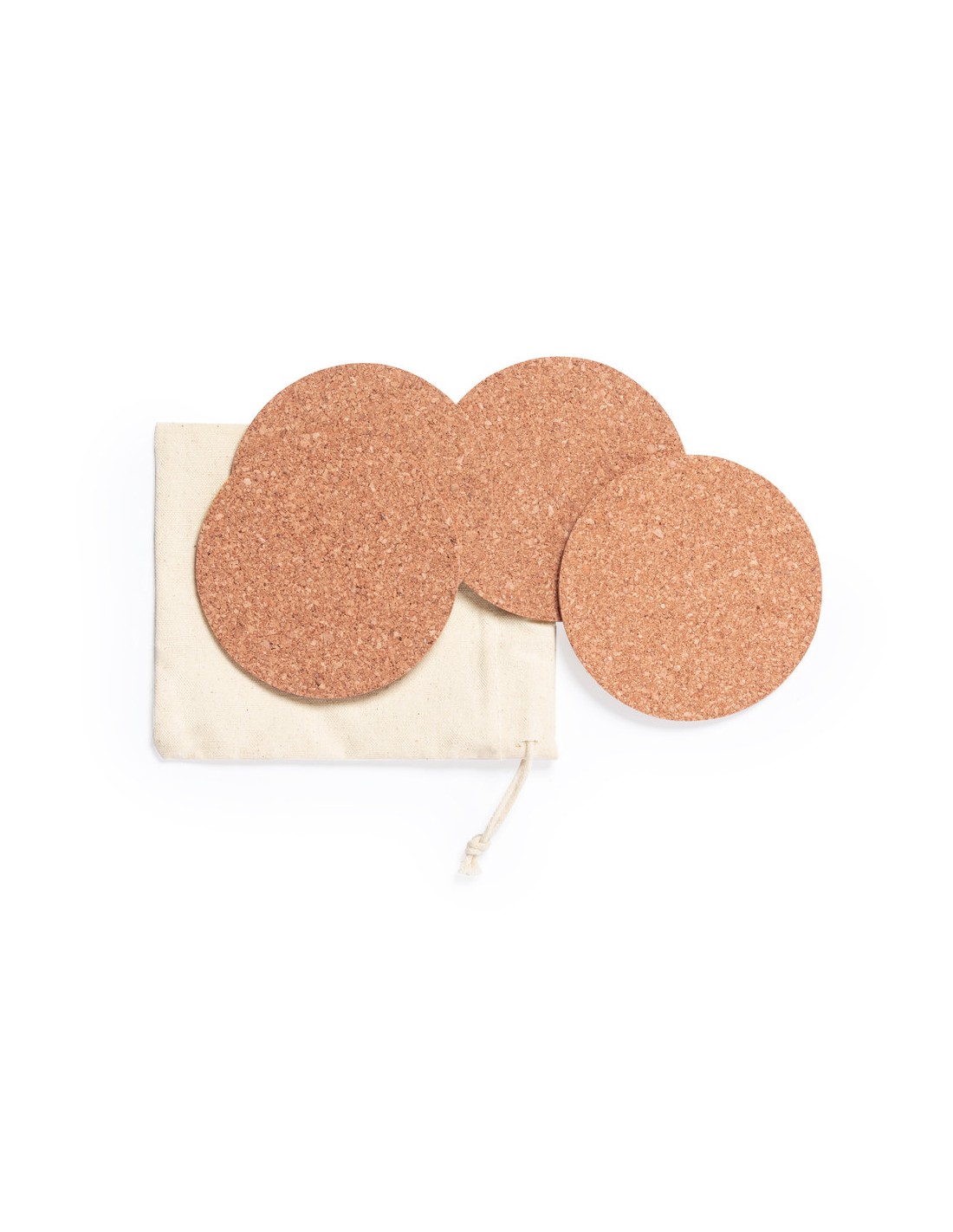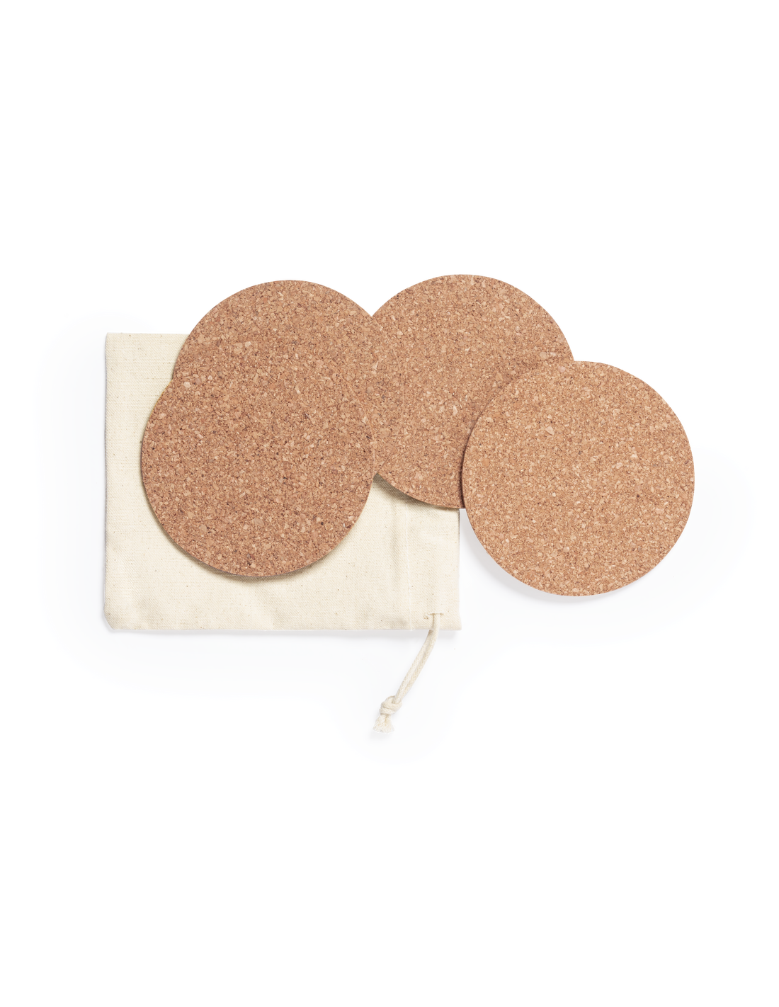 Set de 4 posavasos de línea nature, fabricados en corcho natural. Presentación en bolsa de algodón 100% con cierre de cordón.