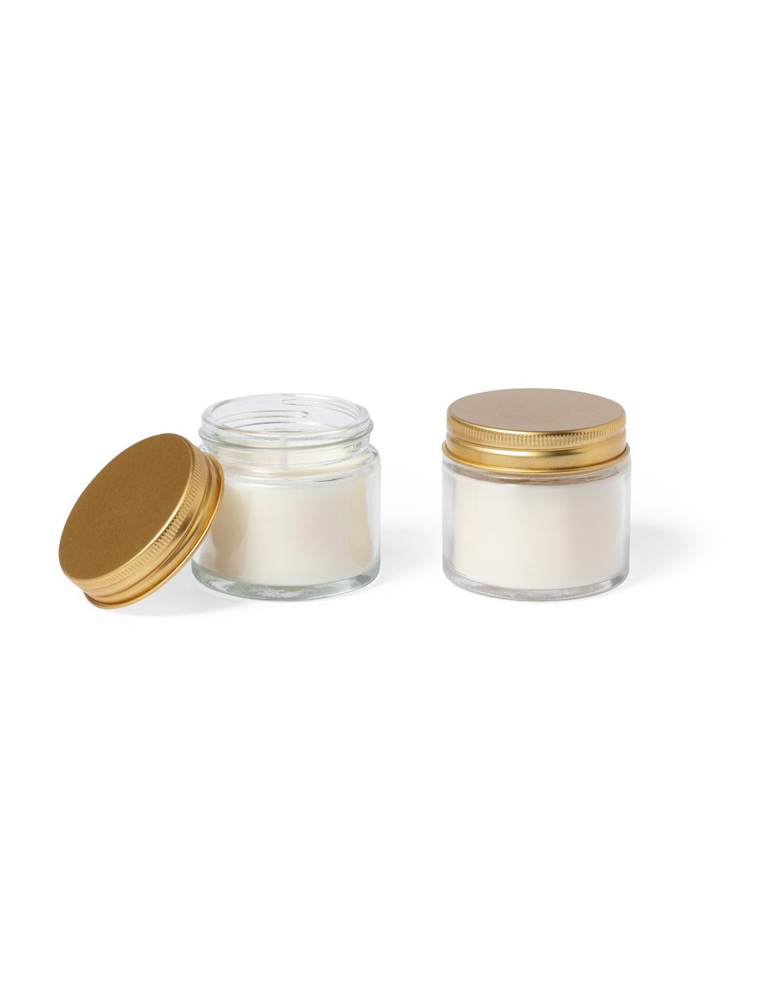 Set de velas aromáticas, con cera vegetal y aroma de flor Fresia. En tarrito de cristal con tapón a rosca metálico y acabado dorado. Presentadas en caja individual kraft.