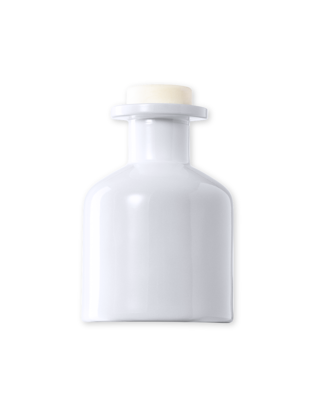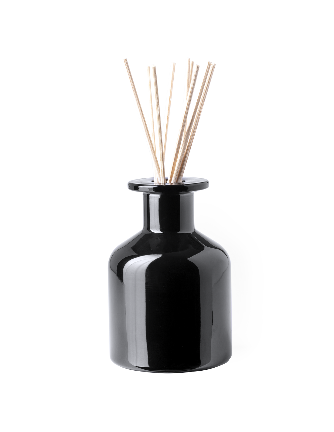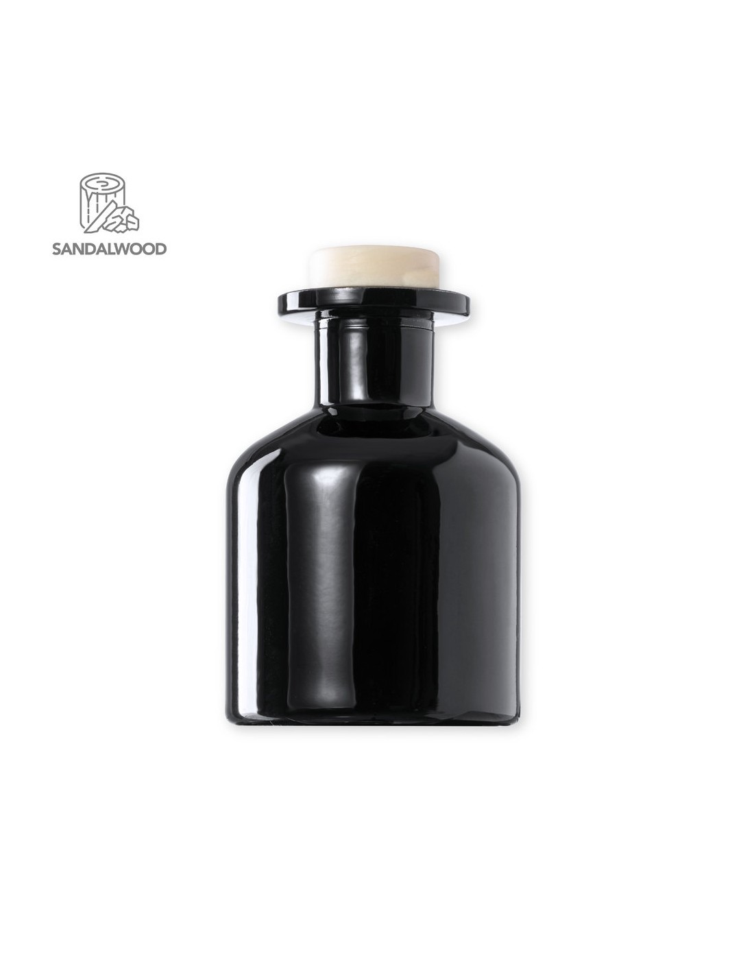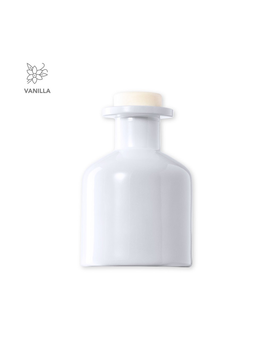 Difusor aromático 100 ml, fabricado en cristal de acabado sólido. Con 8 varillas de ratán y tapón antiderrame. Blanco aroma vainilla y negro aroma sándalo. Presentado en caja individual blanca con ventana.