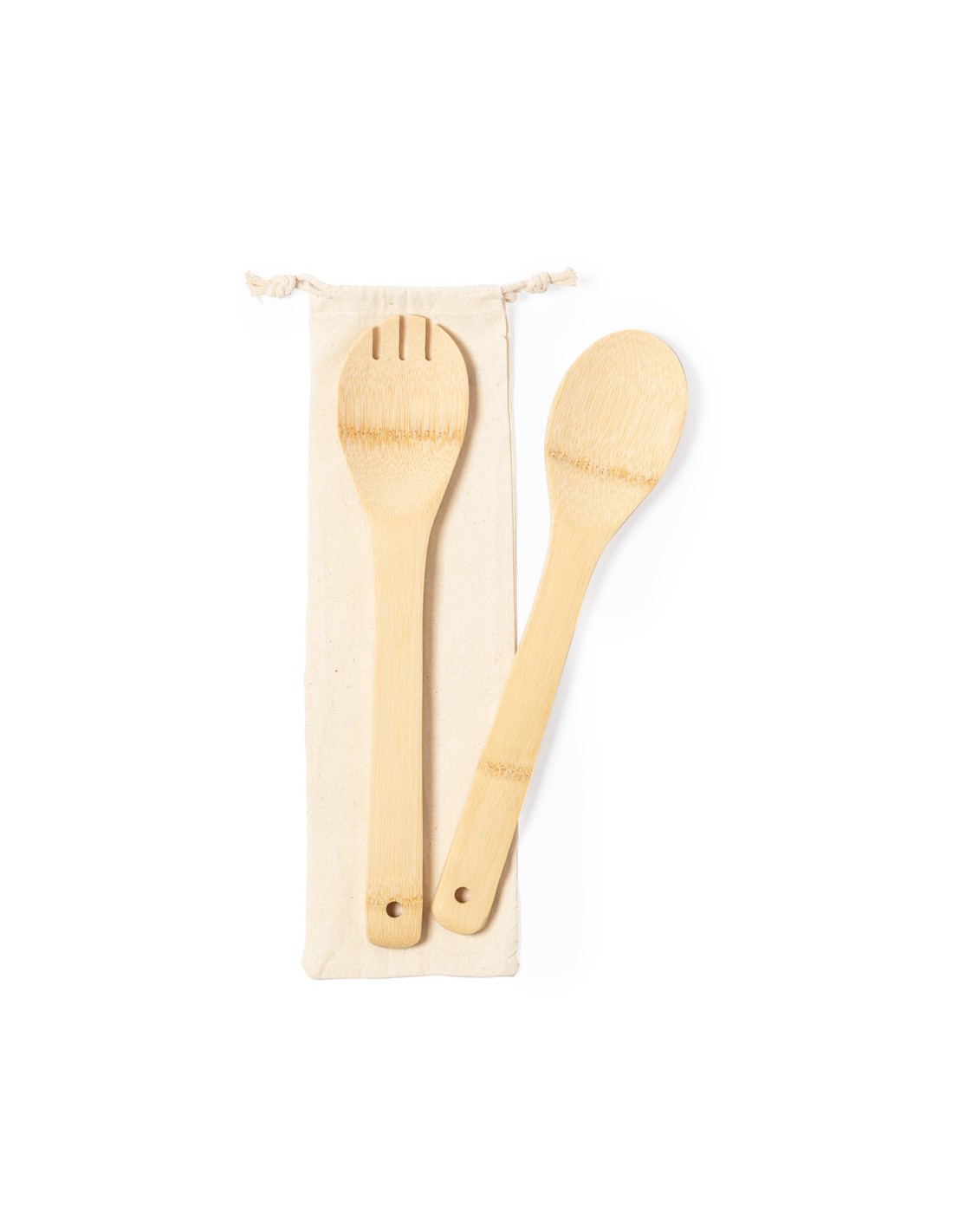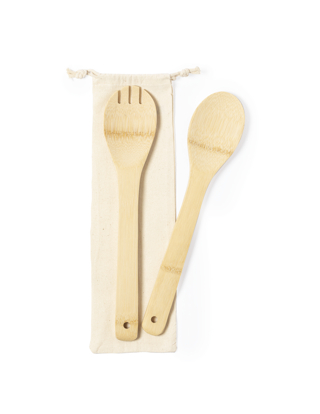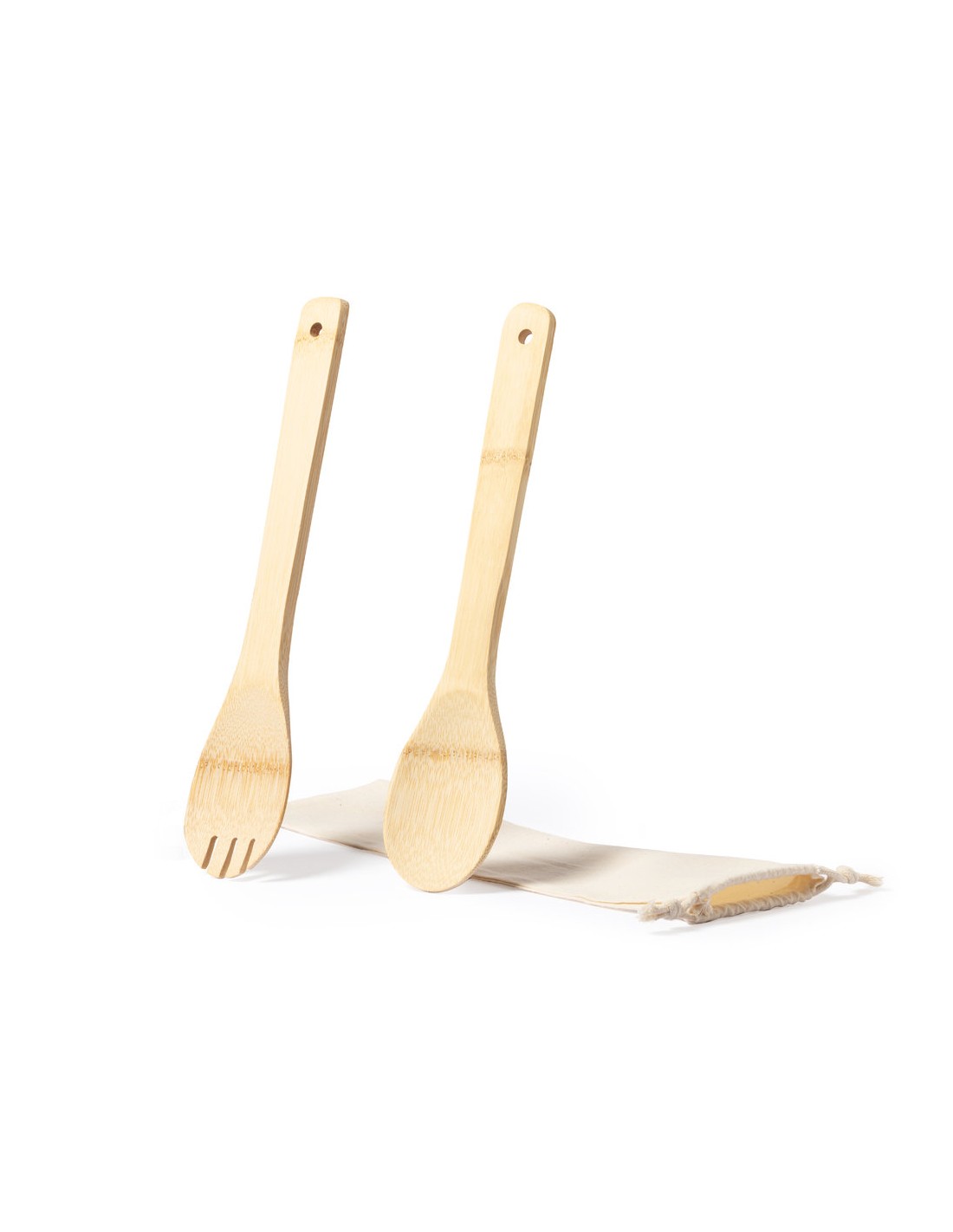Set para ensalada con 2 utensilios fabricados en resistente bambú. Presentación en funda de algodón natural con cordón de cierre.