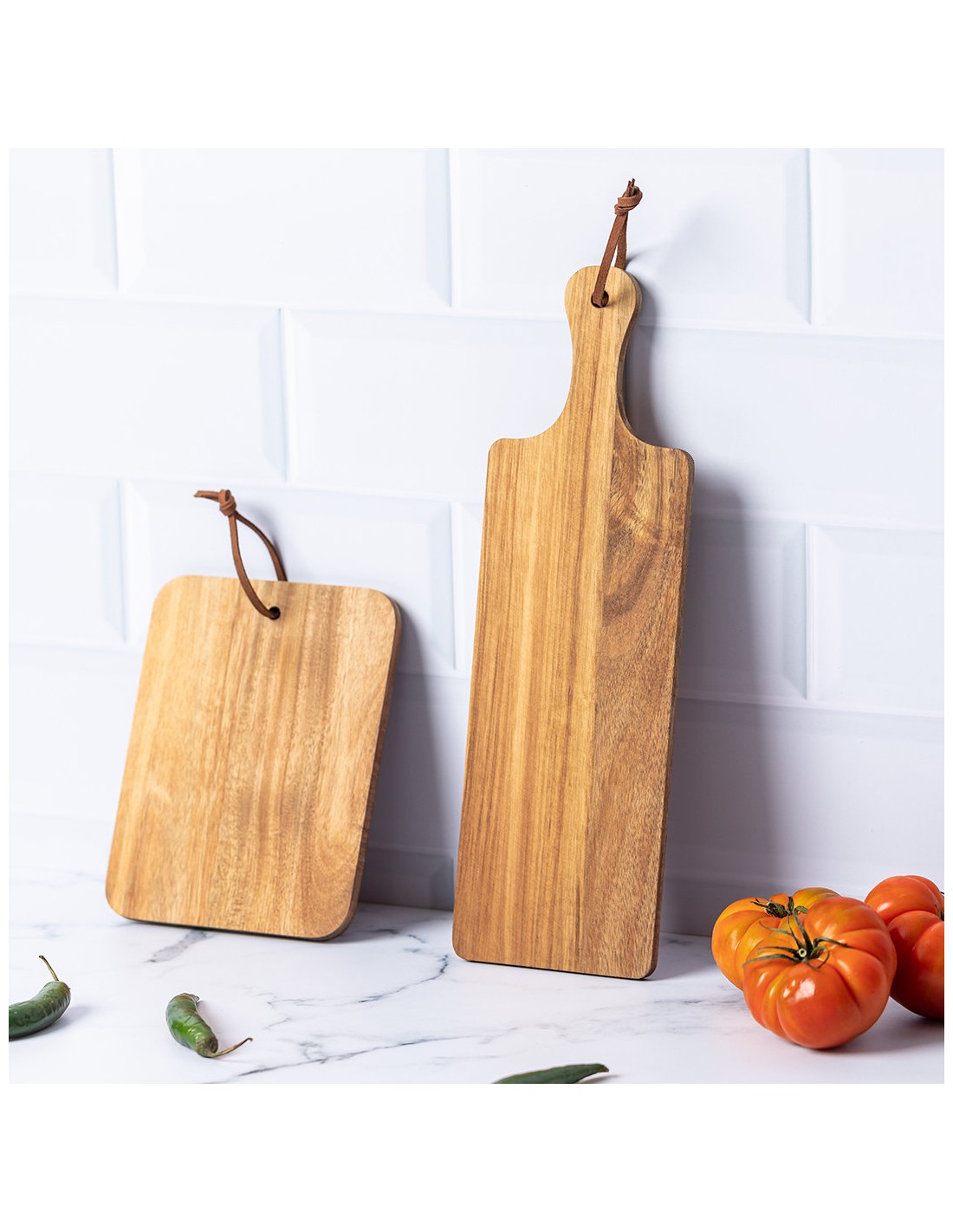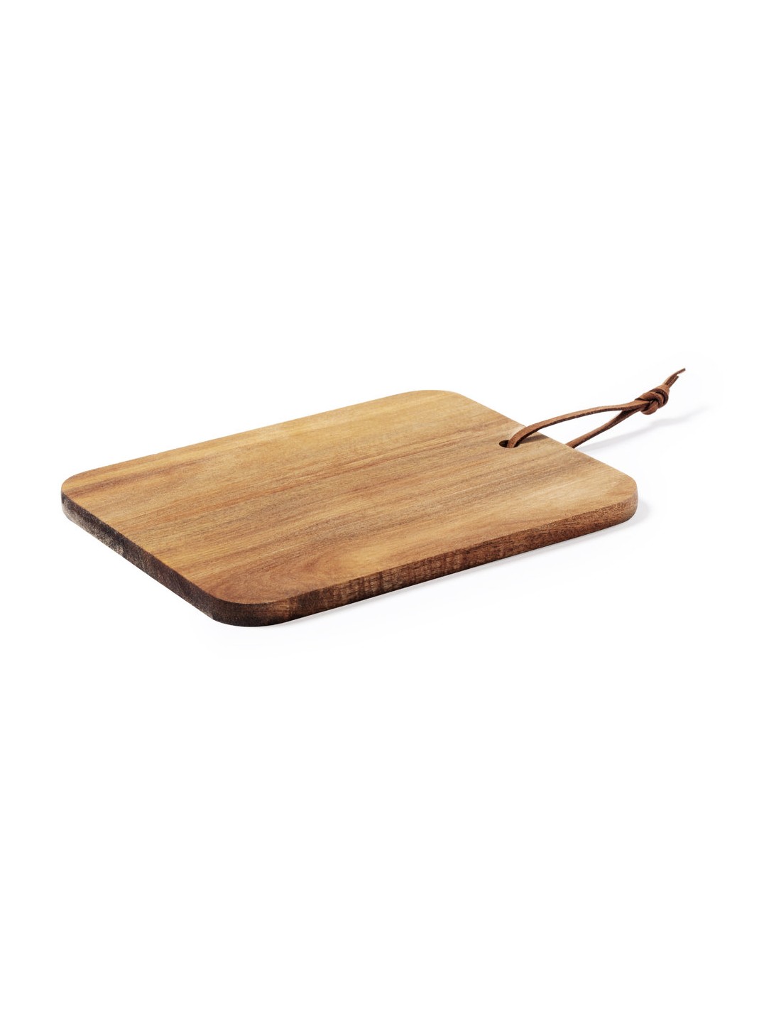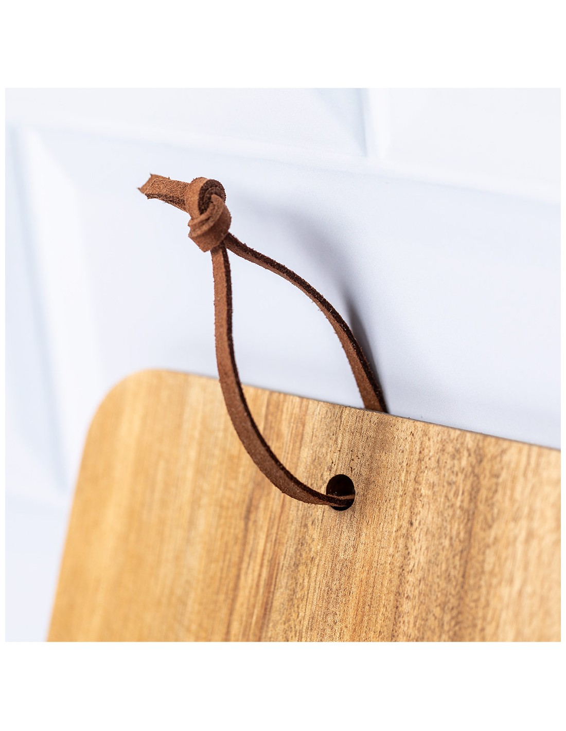 Tabla de corte y presentación fabricada en madera natural. En formato rectangular, con cordón en resistente polipiel a juego.