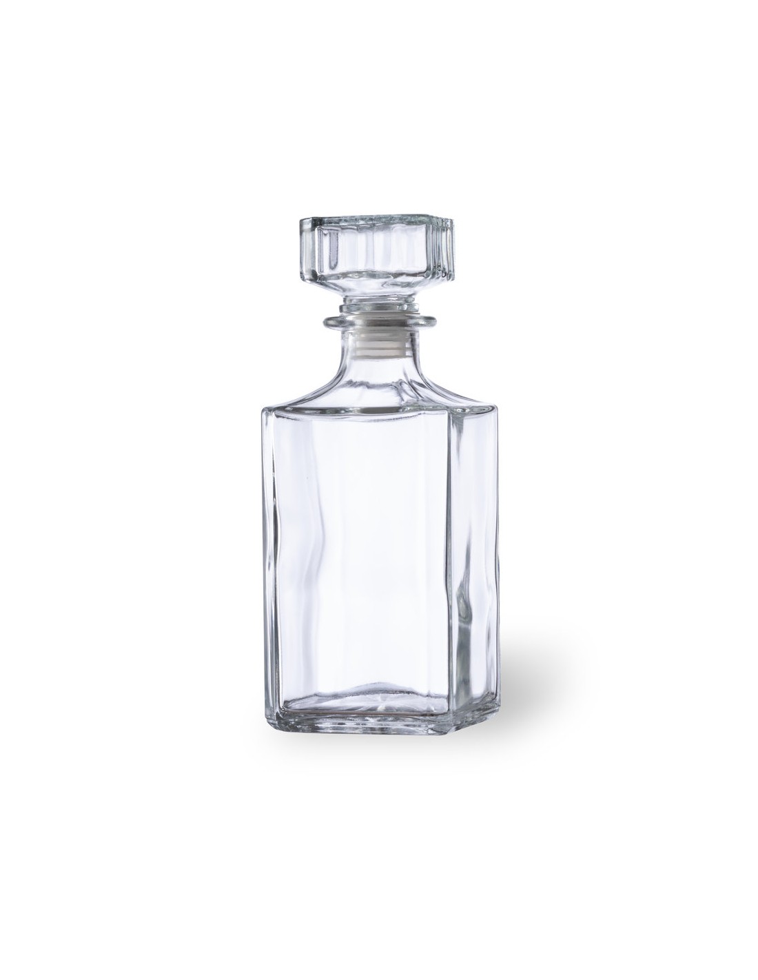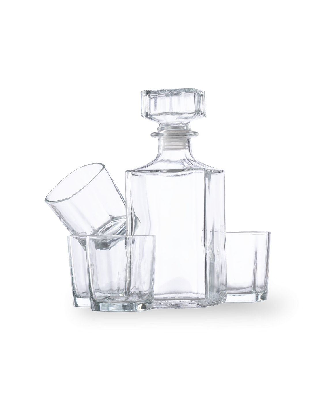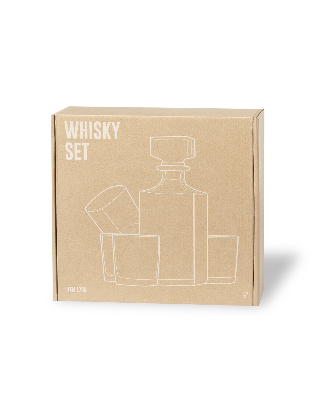 Set de whisky de sobrio diseño y fabricado en cristal. Incluye 4 vasos de 200 ml y decantador de 1 l, con tapón en cristal. Presentación en caja individual de diseño kraft.