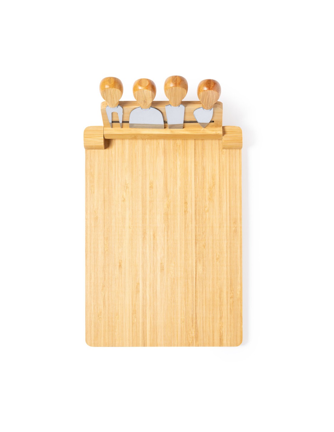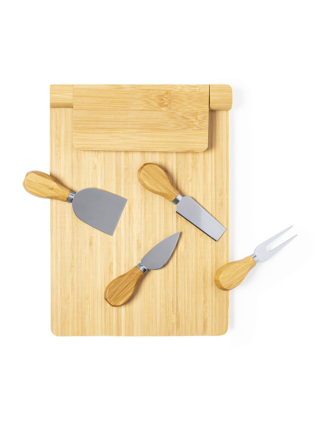Original set de quesos, con soporte para accesorios magnético y plegable. Tabla de corte y presentación fabricada en bambú y en formato rectangular. Accesorios en acero inox con mango en bambú. Presentado en caja individual de diseño kraft.