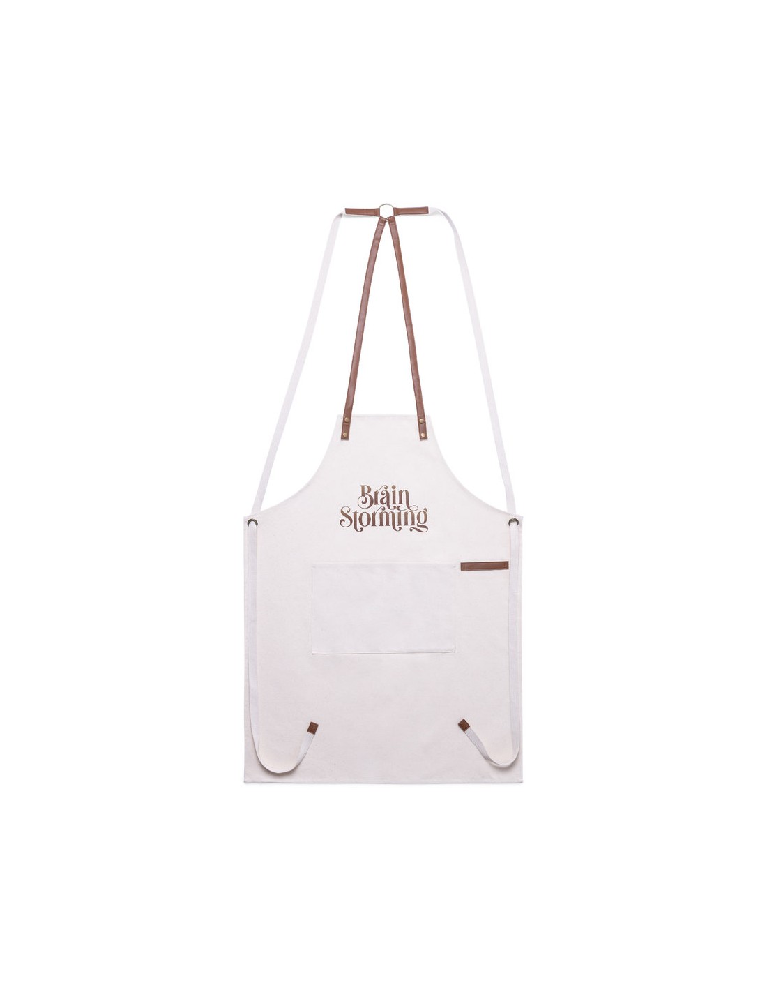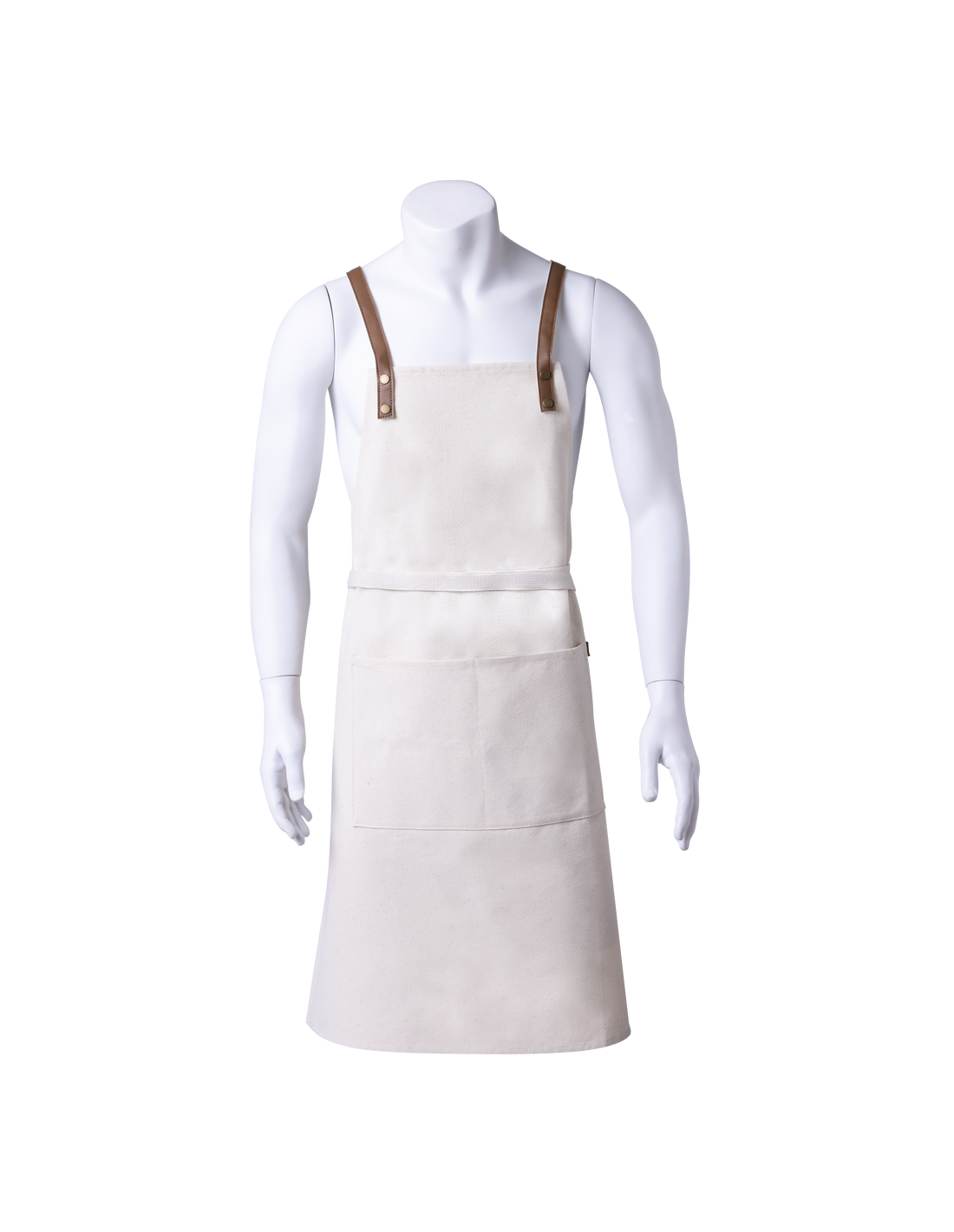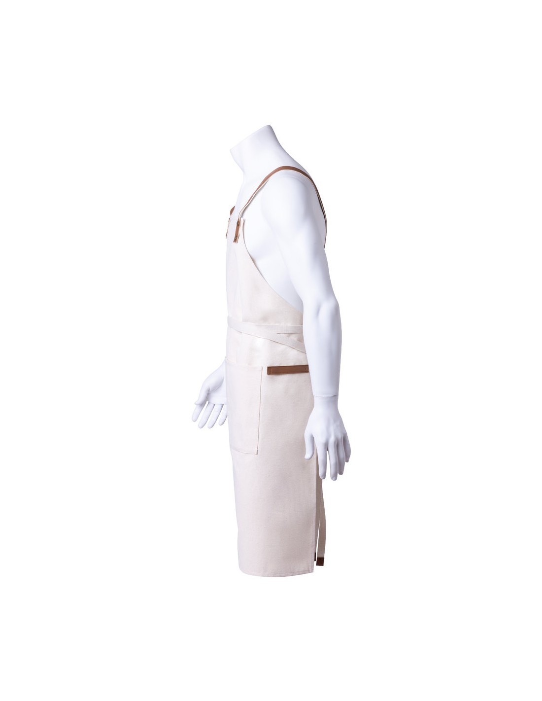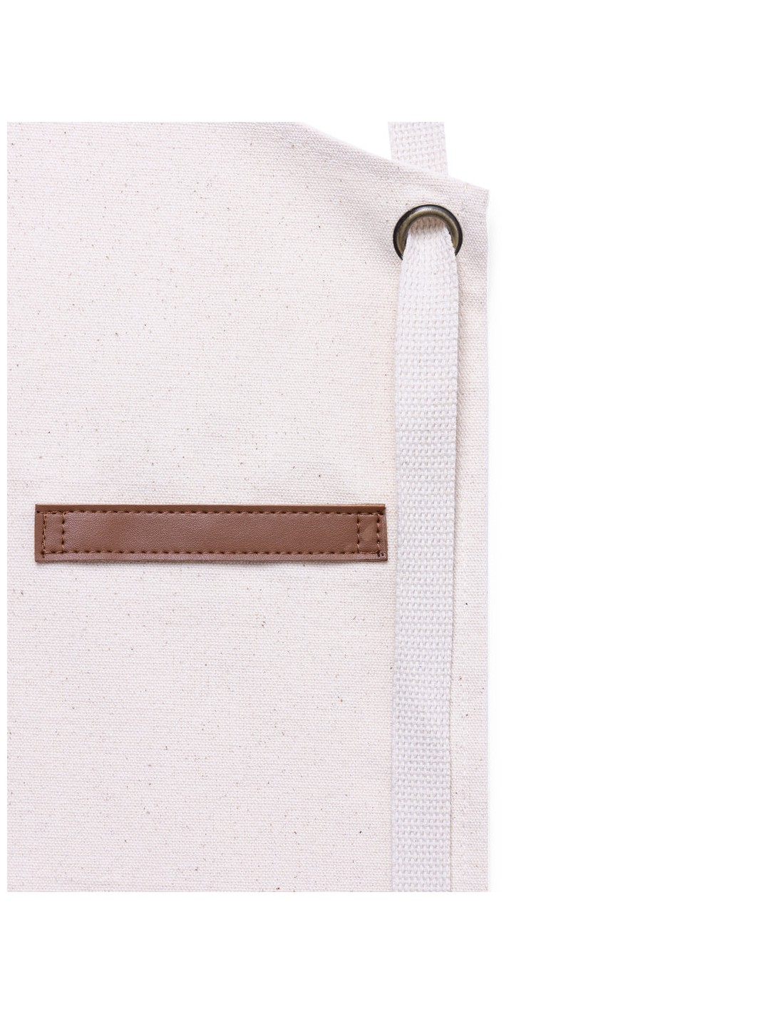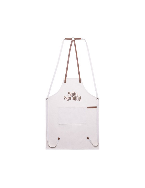 Delantal de alta calidad en resistente material 100% algodón canvas de 340g/m2, con costuras reforzadas. De corte por debajo de la rodilla, con cintas en resistente polipiel y triple ajuste: cuello, espalda y cintura. Con bolsillo frontal, accesorio en polipiel y remaches metálicos de refuerzo.