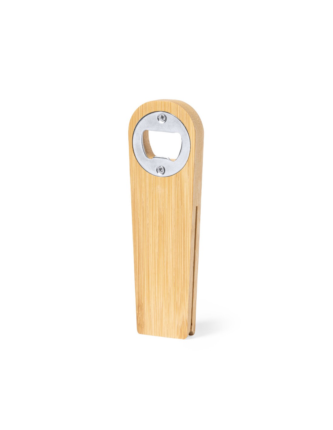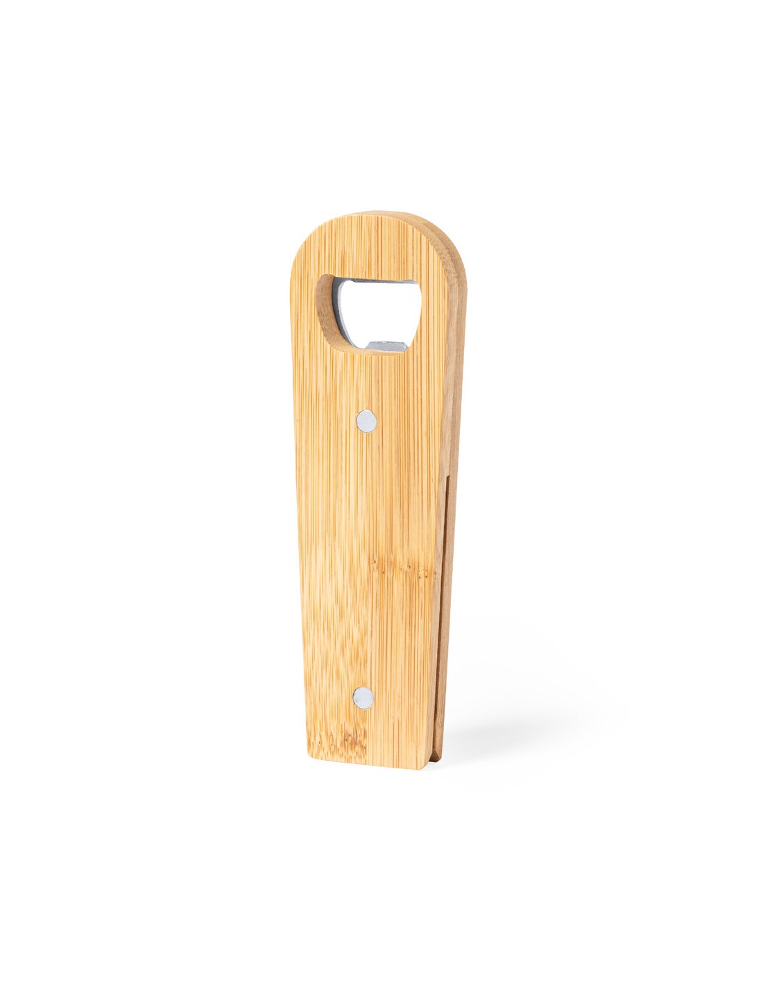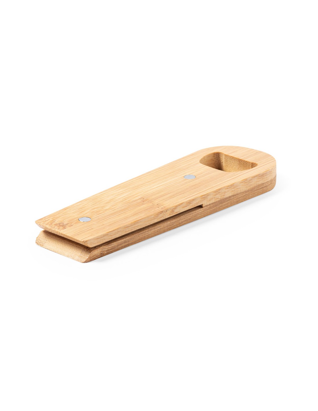 Original abridor magnético de línea nature, fabricado en resistente bambú. Con pinza integrada en cuerpo y sistema de apertura metálico.