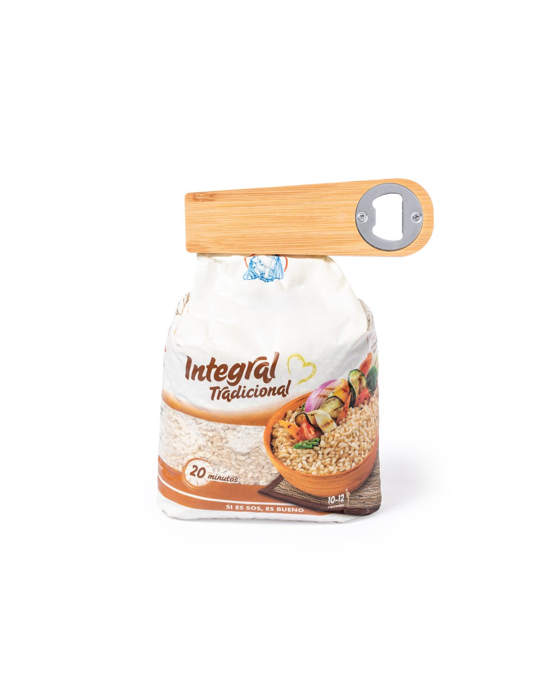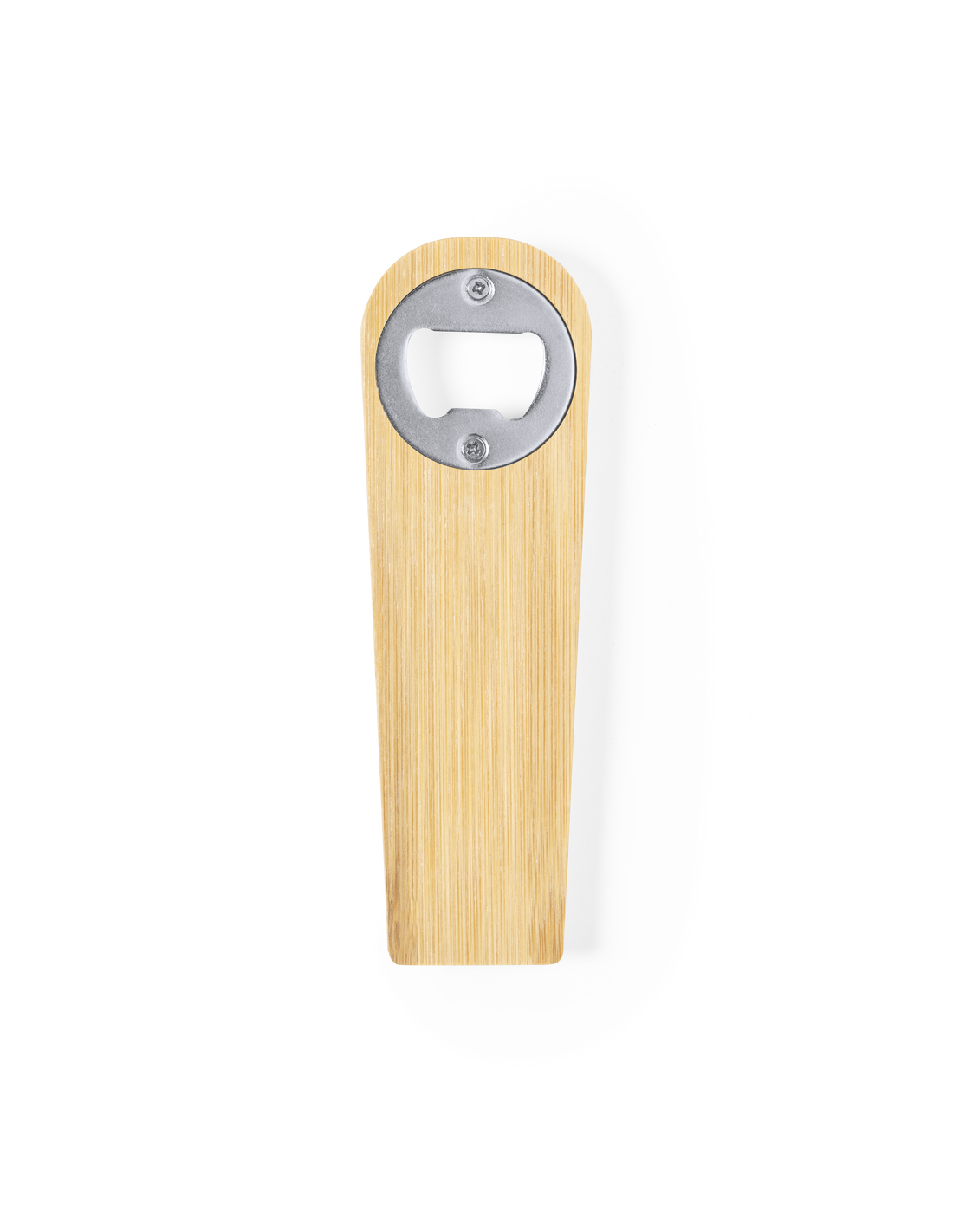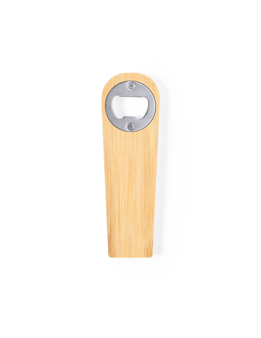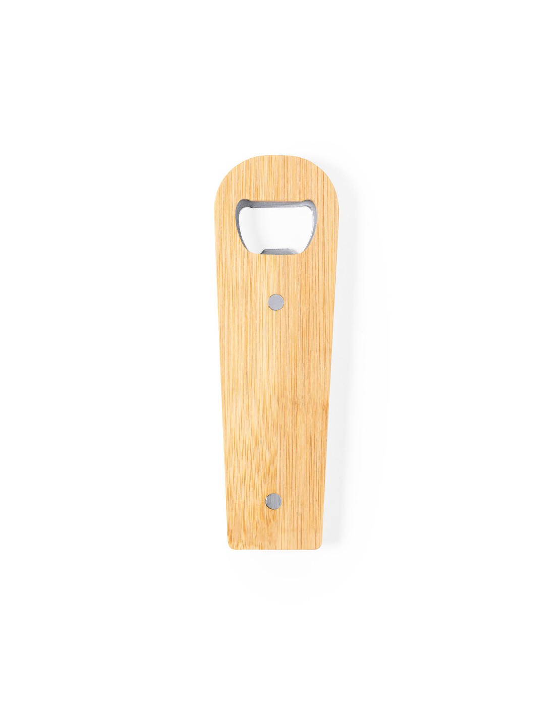 Original abridor magnético de línea nature, fabricado en resistente bambú. Con pinza integrada en cuerpo y sistema de apertura metálico.