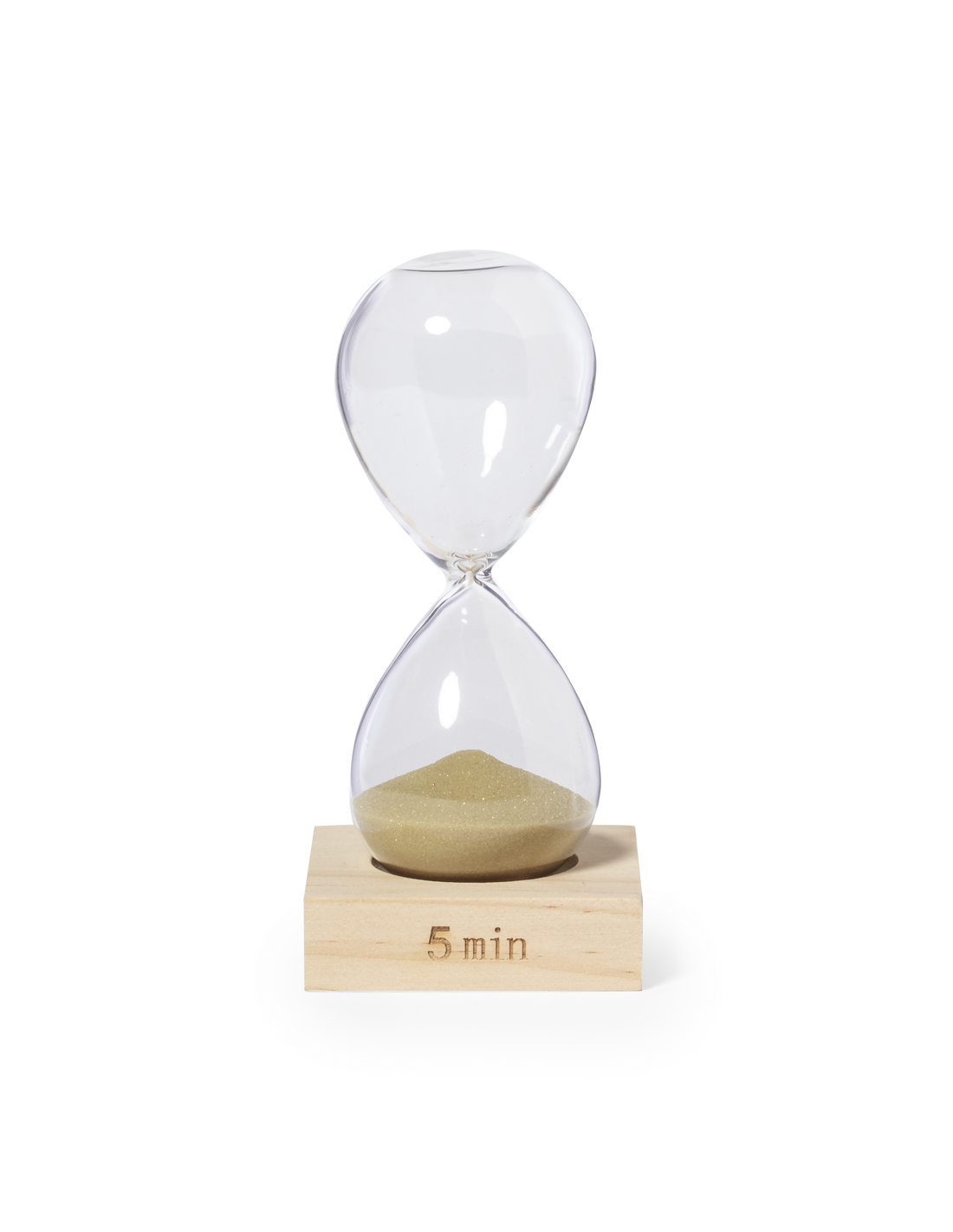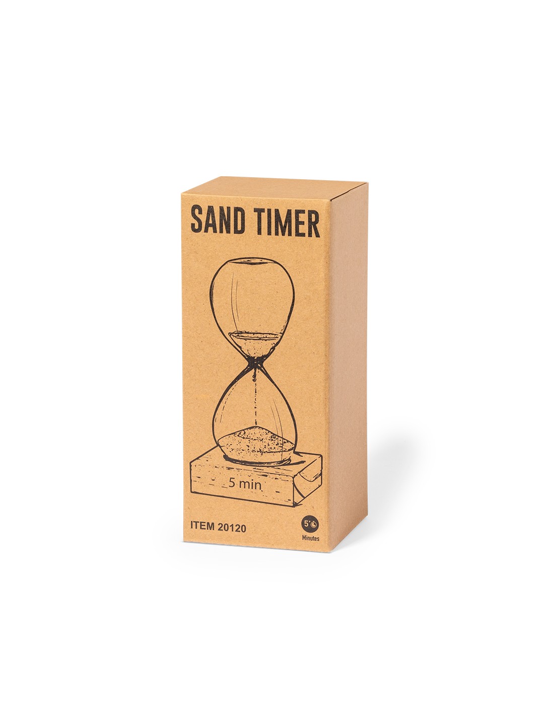 Reloj de arena de 5 minutos de duración. Fabricado en cristal de borosilicato, que ofrece una resistencia y durabilidad excepcionales, con base en madera de pino natural. Su elegante diseño y la arena en color natural lo convierten en un gadget decorativo y funcional, ideal para medir el tiempo. Presentado en una caja individual de diseño kraft.