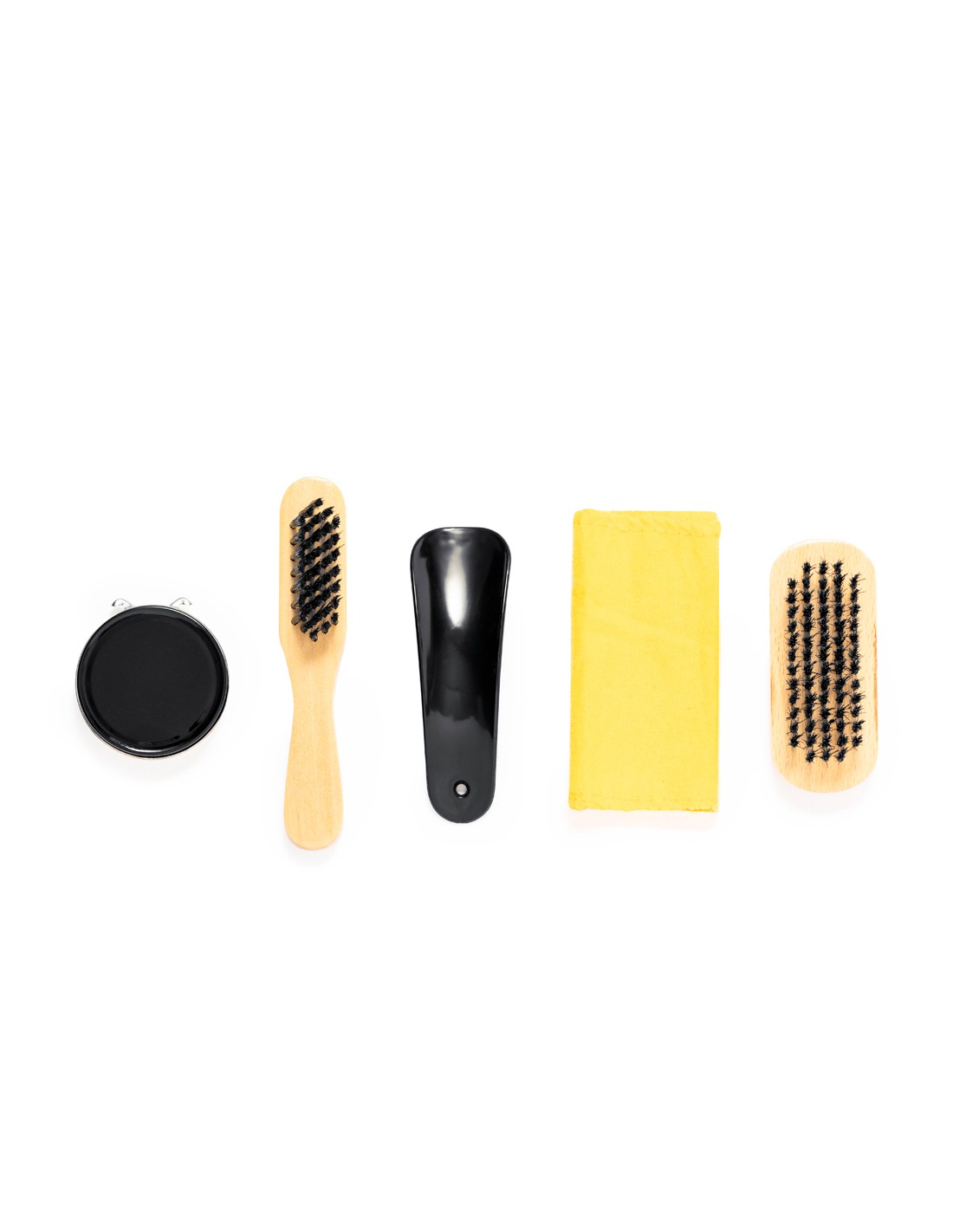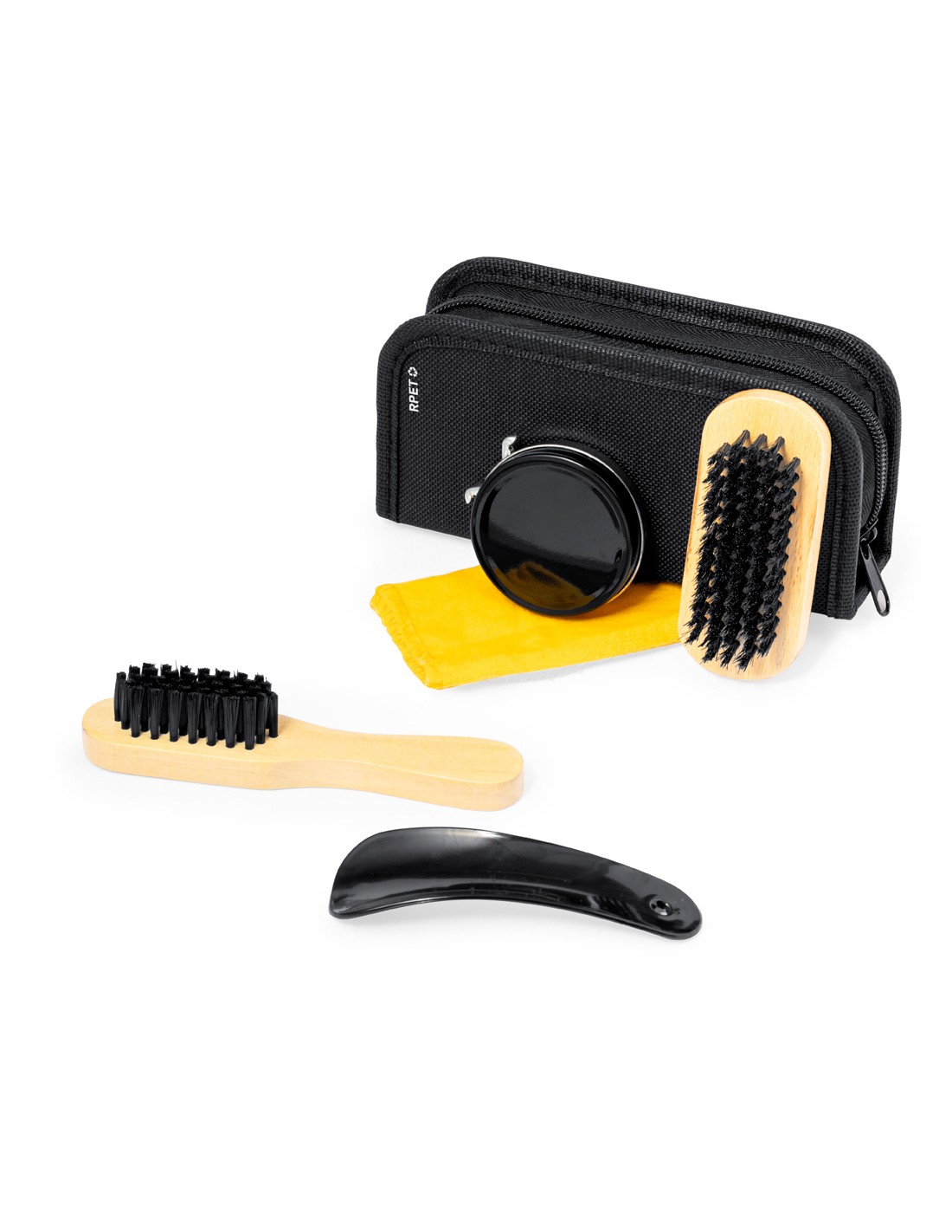 Práctico set para limpiar calzado en estuche de RPET. Completo paquete para limpiar calzado con dos cepillos de suaves cerdas, calzador, lata con cera y paño para que brille todo el calzado. Presentado en un práctico estuche con cierre de cremallera y elásticos para tener organizados todos los utensilios. Con logotipo RPET en la funda. El material RPET se elabora a partir de plástico reciclado, para así fomentar la reutilización de residuos plásticos y ayudar a la sostenibilidad del planeta.