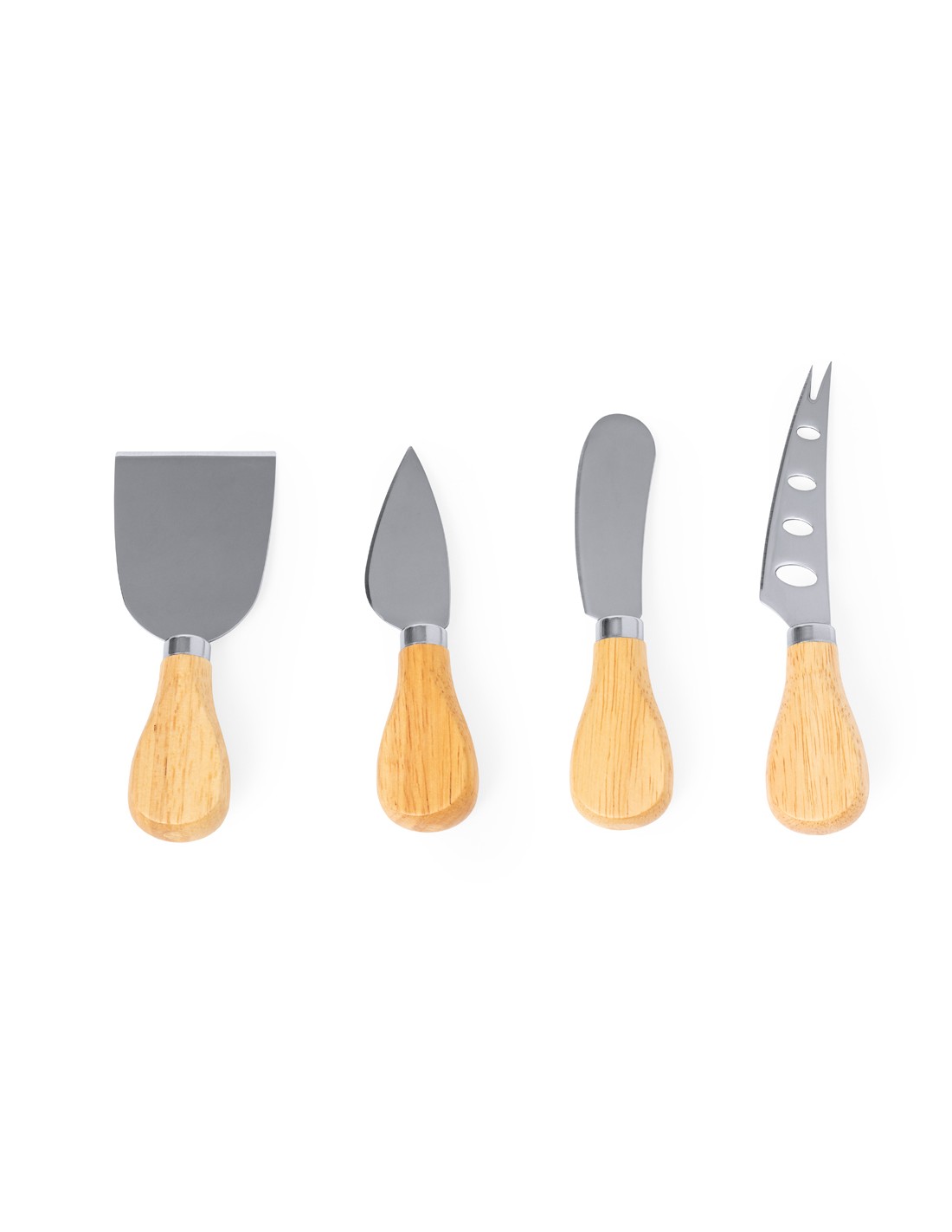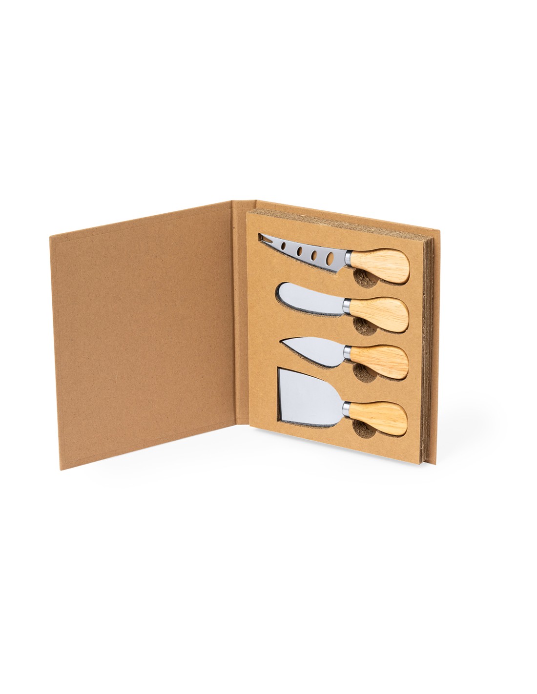 Set de quesos fabricado en madera. Utensilios fabricados en acero inox y mango de madera, con cuatro modelos diferentes: para quesos duros, quesos blandos, quesos semiduros y quesos en trozos. Presentados en original estuche de cartón reciclado, con interior troquelado para cada accesorio.