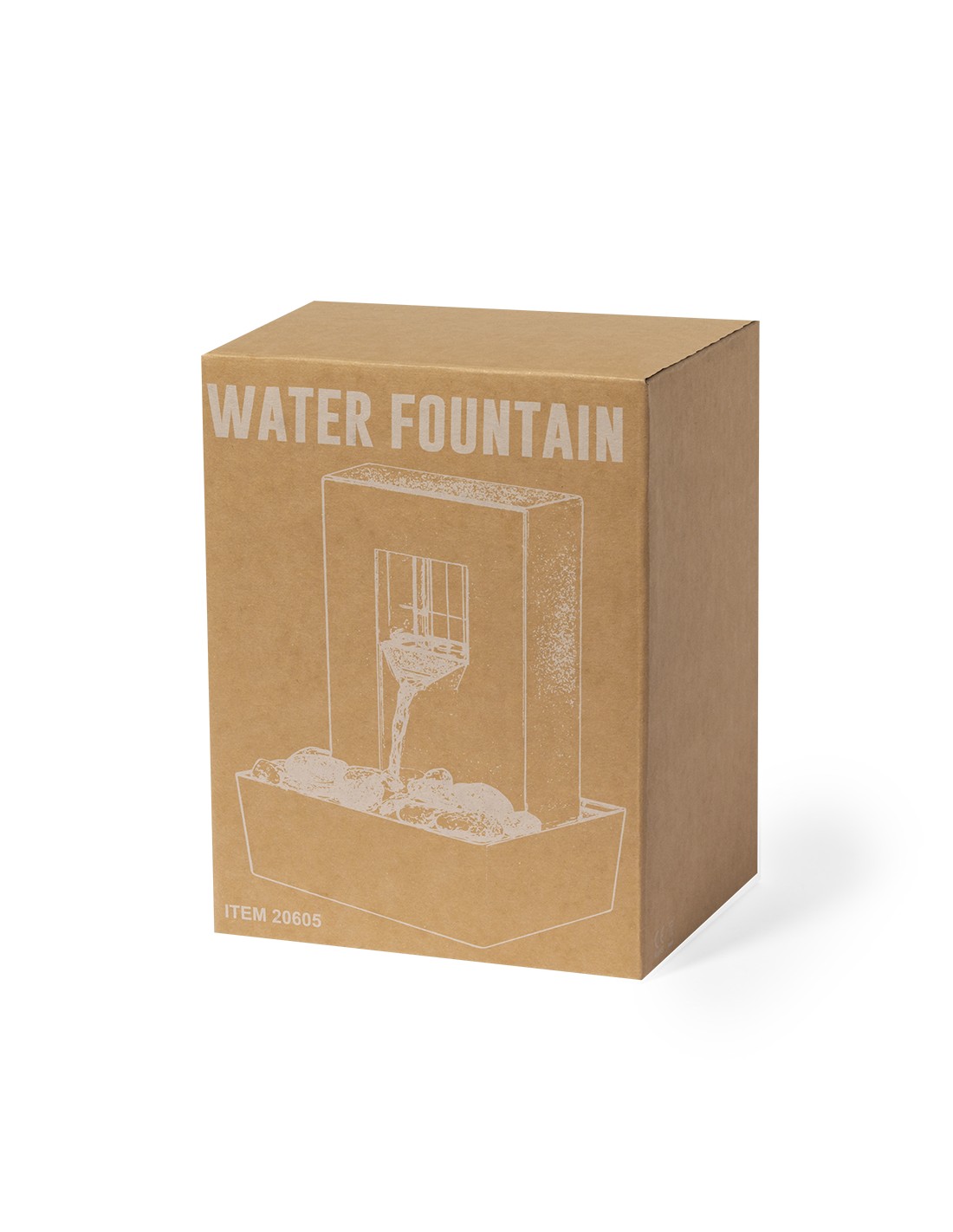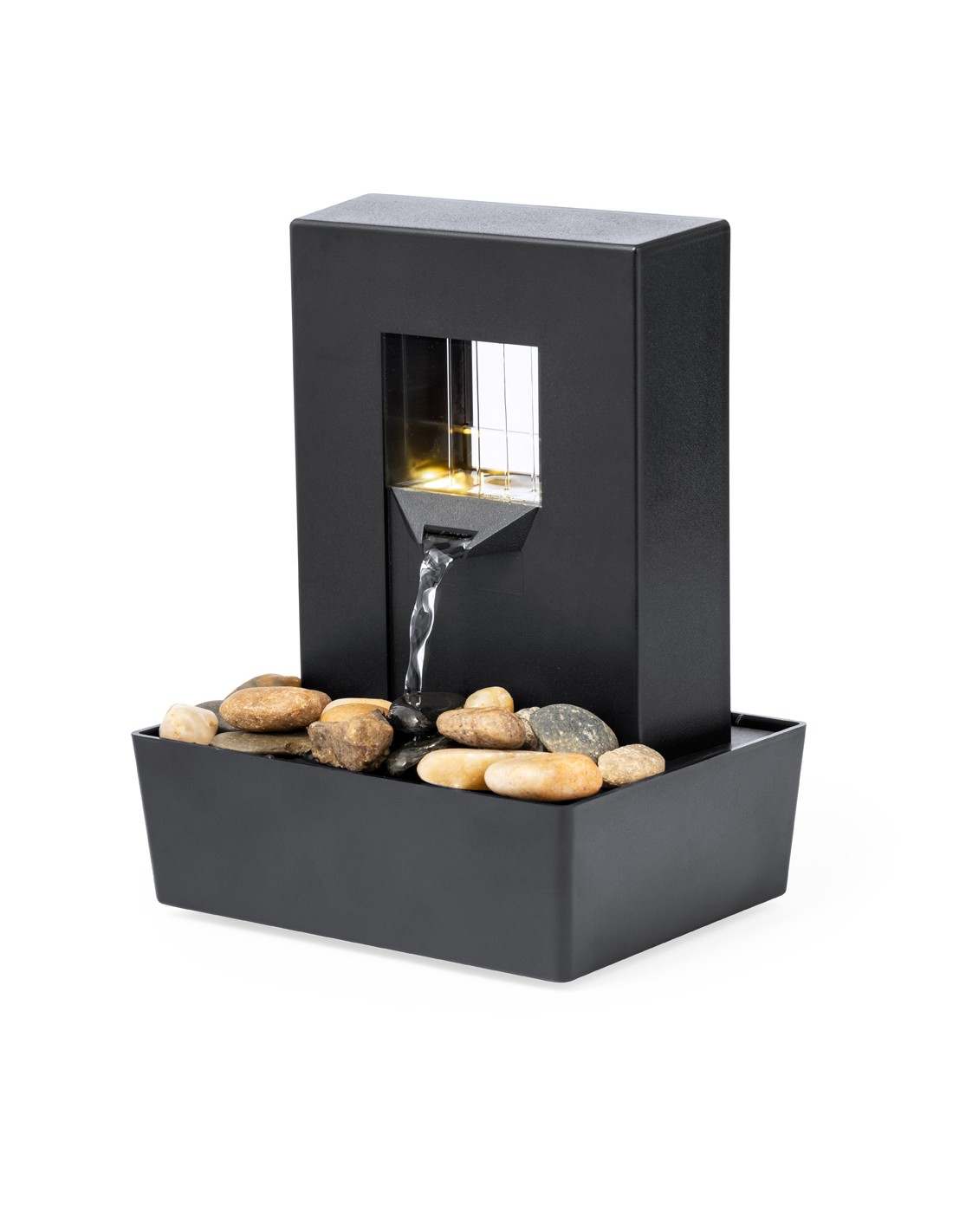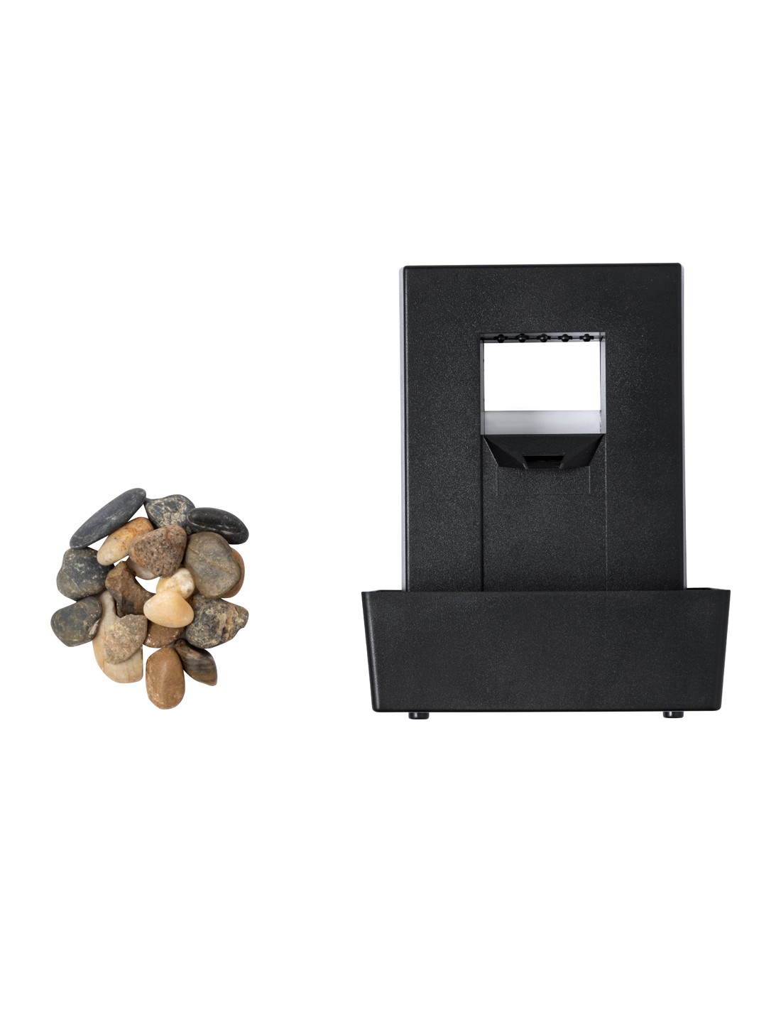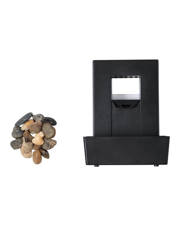 Fuente portátil de agua infinita con luces LED. Cascada de agua sobre piedras naturales, ideal para decoración o momentos de relajación. Incluye un depósito para el agua y una estructura iluminada por LEDs de tonos naturales, a través de la que fluye el agua. Alimentada por 3 pilas AA (no incluidas). Presentada en caja de diseño kraft.