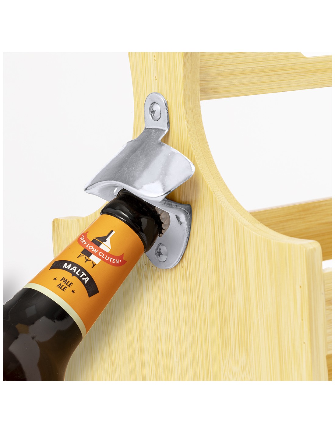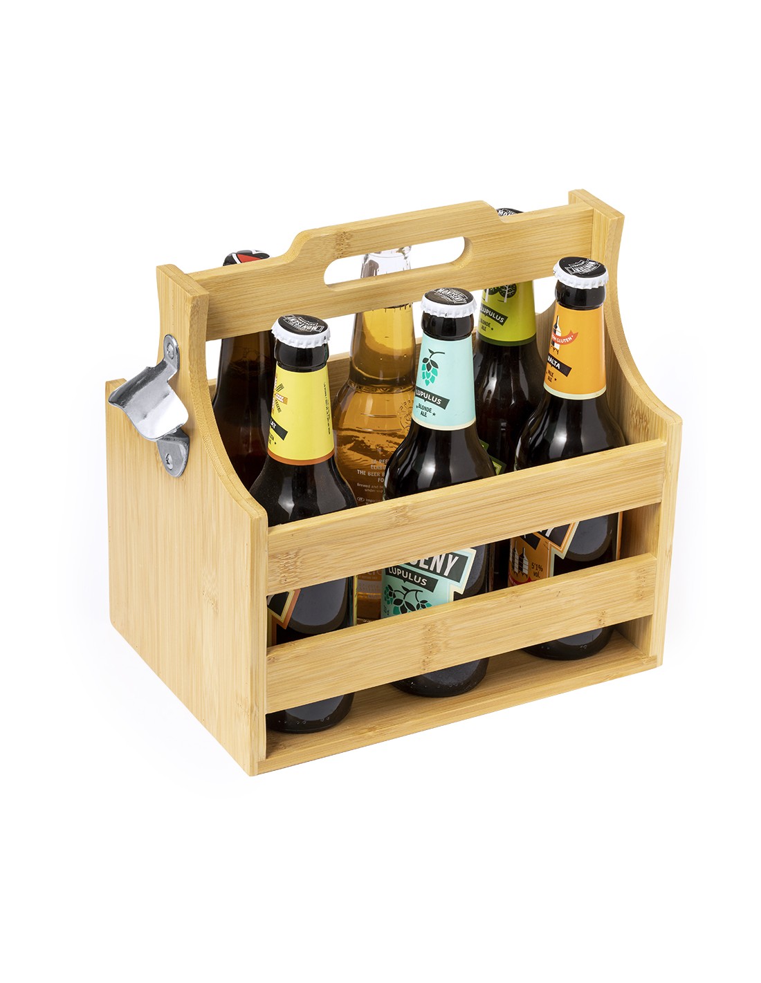 Práctico soporte para botellas hecho en bambú. Original caja de transporte de bebidas con asa troquelada en la parte superior y un abridor de botellas metálico en un lateral, con capacidad para 6 botellines. Presentado en caja de diseño kraft.
