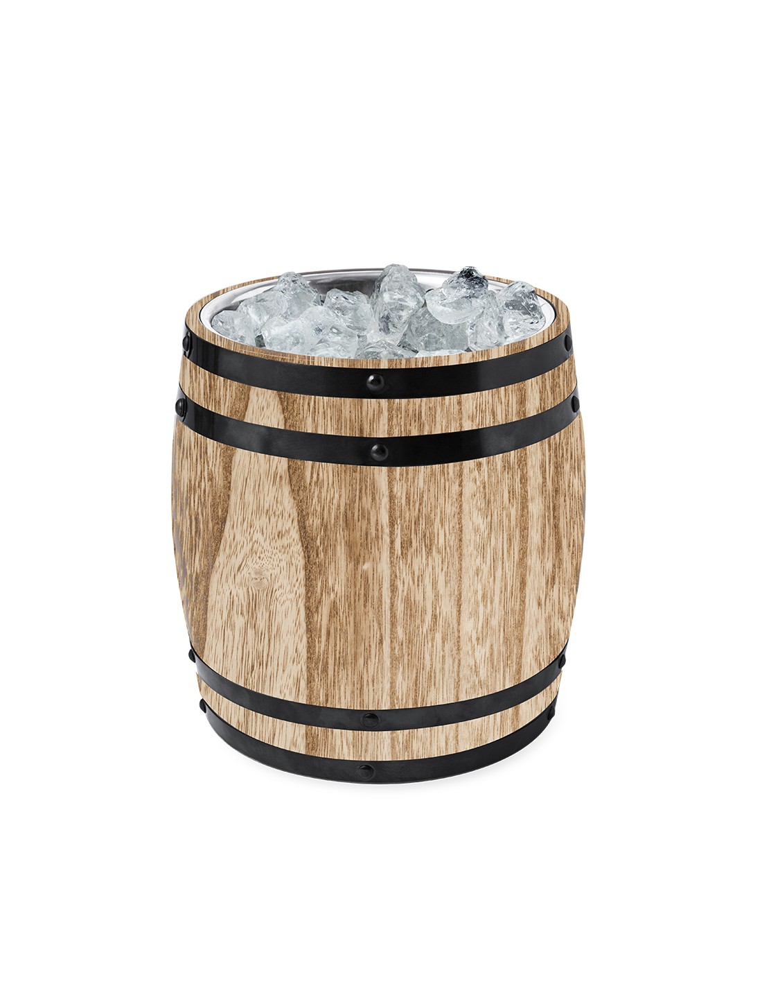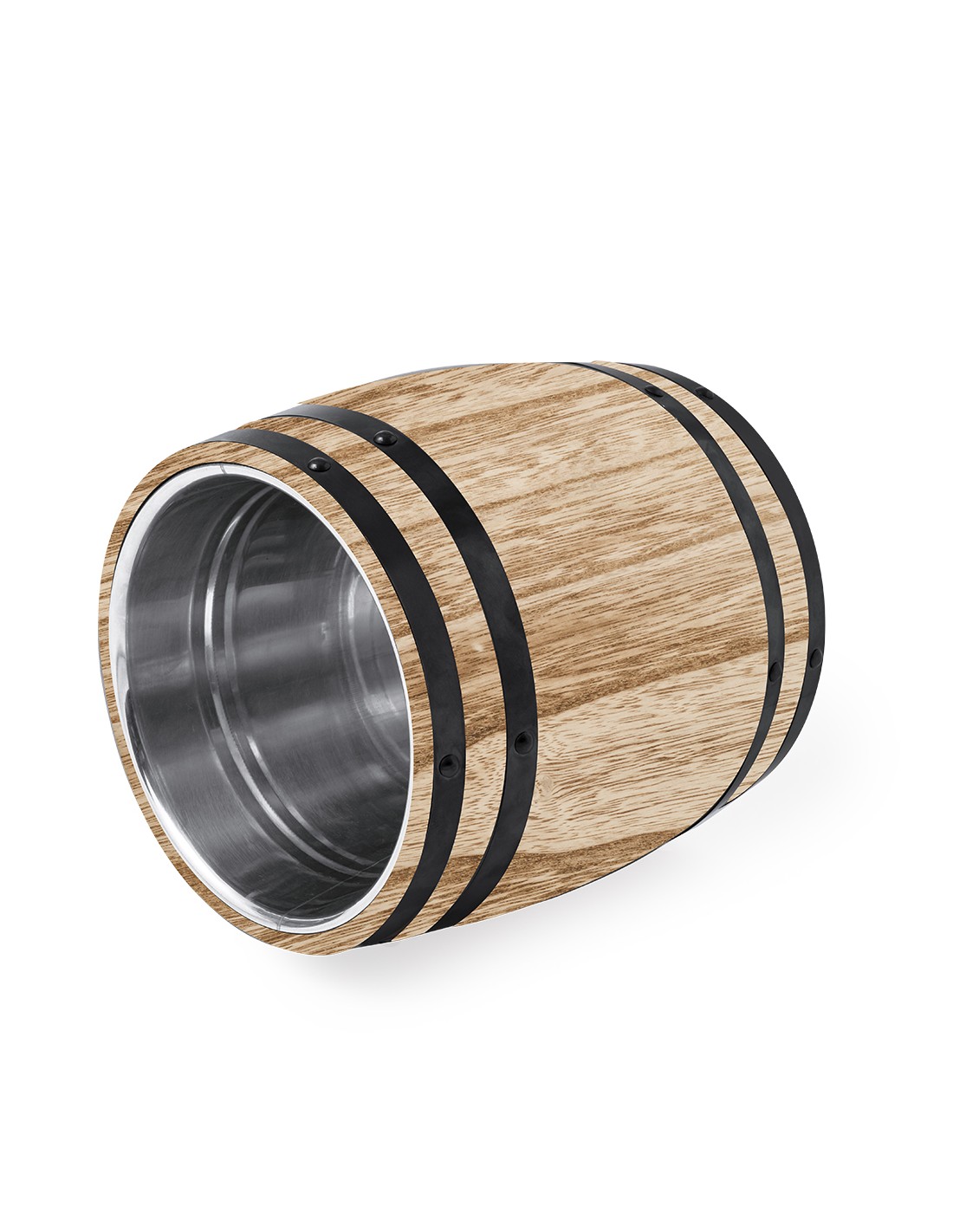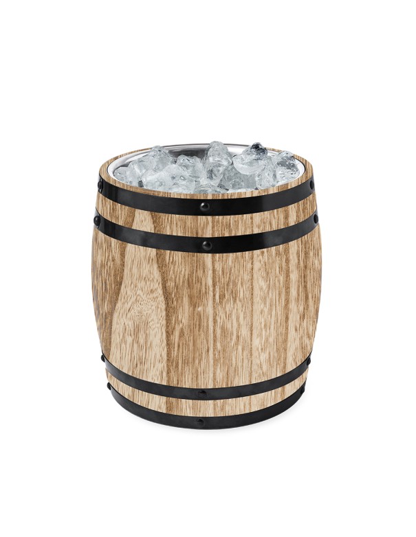 Original cubo de acero con exterior de madera. Forma de barril para conservar bebidas frías o hielos gracias a su doble pared de acero inox con 3L de capacidad. Presentado individualmente en caja de diseño kraft.