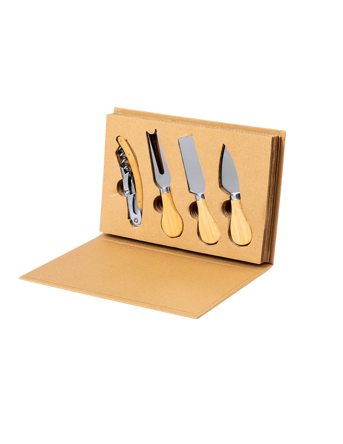 Set de quesos y vino con accesorios fabricados en resistente acero inox, con mango en bambú. Accesorios presentados en un original estuche de cartón corrugado, con interior troquelado para cada uno. Incluye utensilios para quesos duros, blandos y troceados; y un abridor de dos tiempos con cuchilla cortacápsulas.Materiales como el bambú fomentan la utilización de materias primas naturales, reduciendo las emisiones contaminantes. Proviene de una planta de gran resistencia y versatilidad, con crecimiento y regeneración rápidos, siendo una excelente alternativa al uso de madera tradicional.