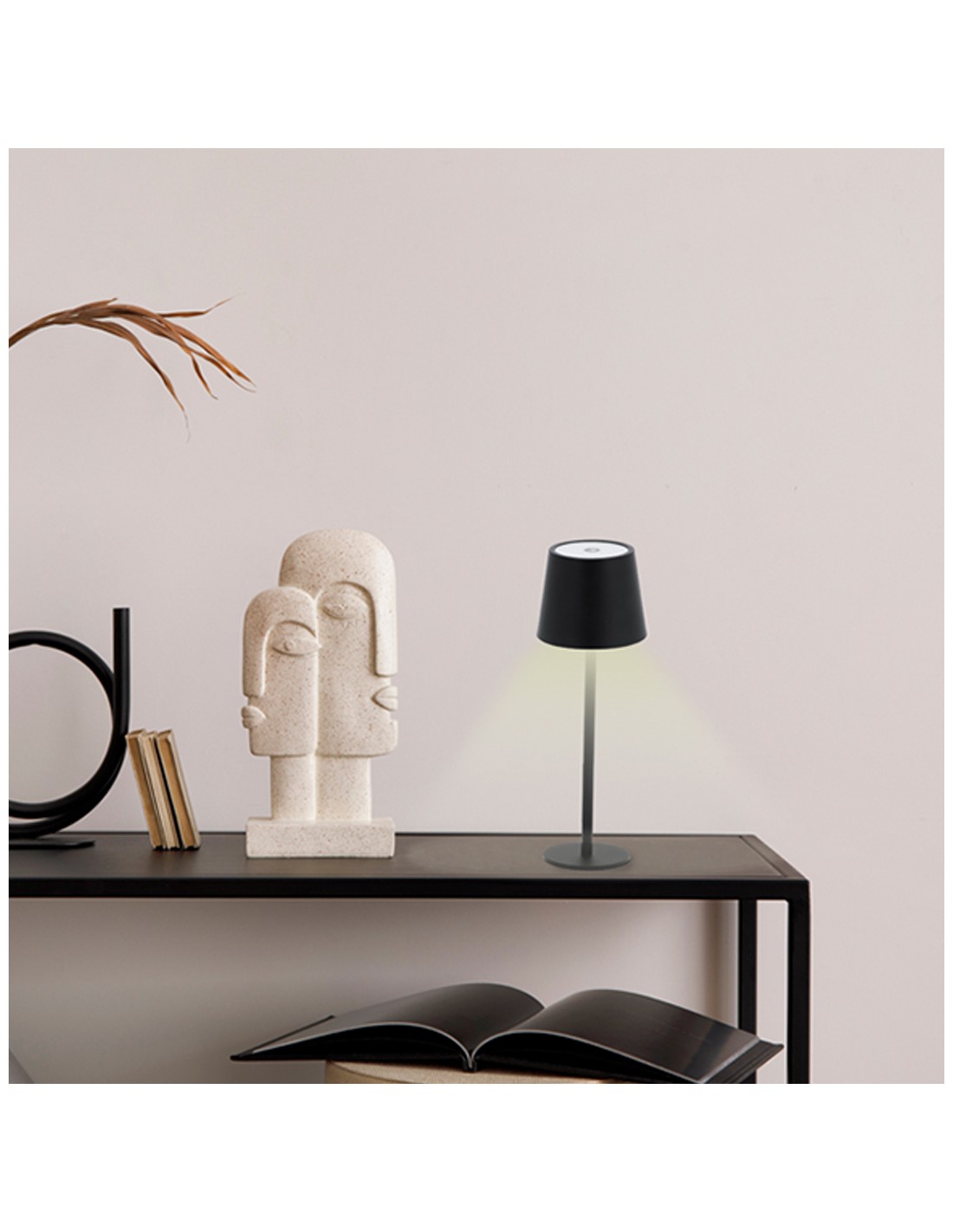 Lámpara de diseño en acabado negro cromado. Incluye 3 modos de luz (blanca, neutra y cálida) y sistema de regulación de intensidad de luz táctil. Equipada con 48 LEDs. Con botón encendido/apagado.