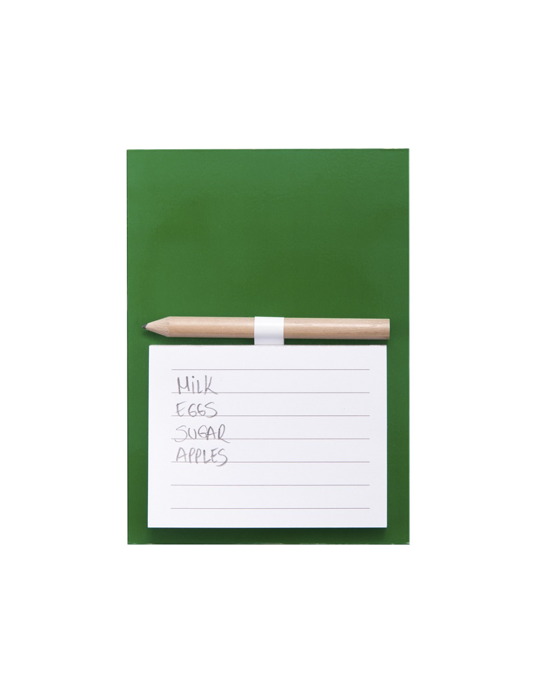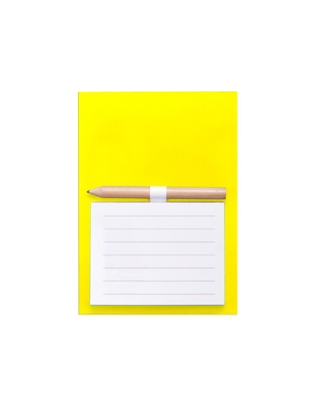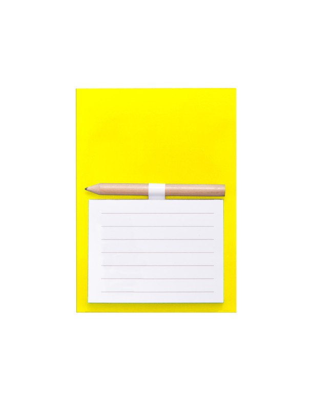 Imán bloc de notas en resistente cartón de vivos y variados colores. Bloc de 40 hojas de distribución a una raya con soporte para minilápiz -incluido-.