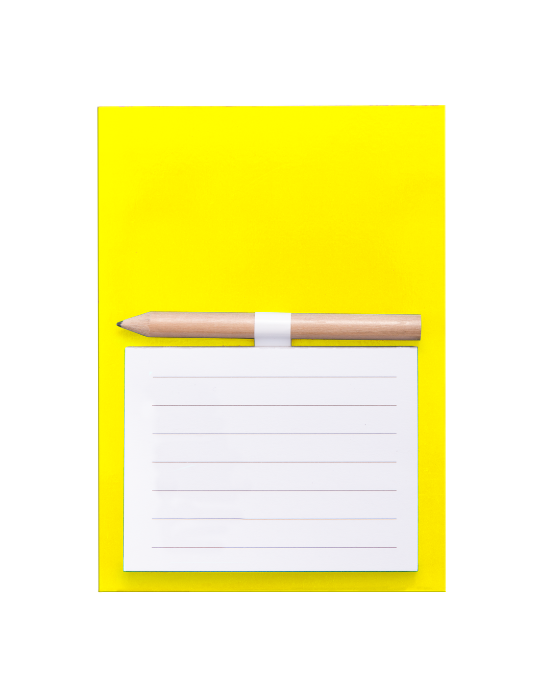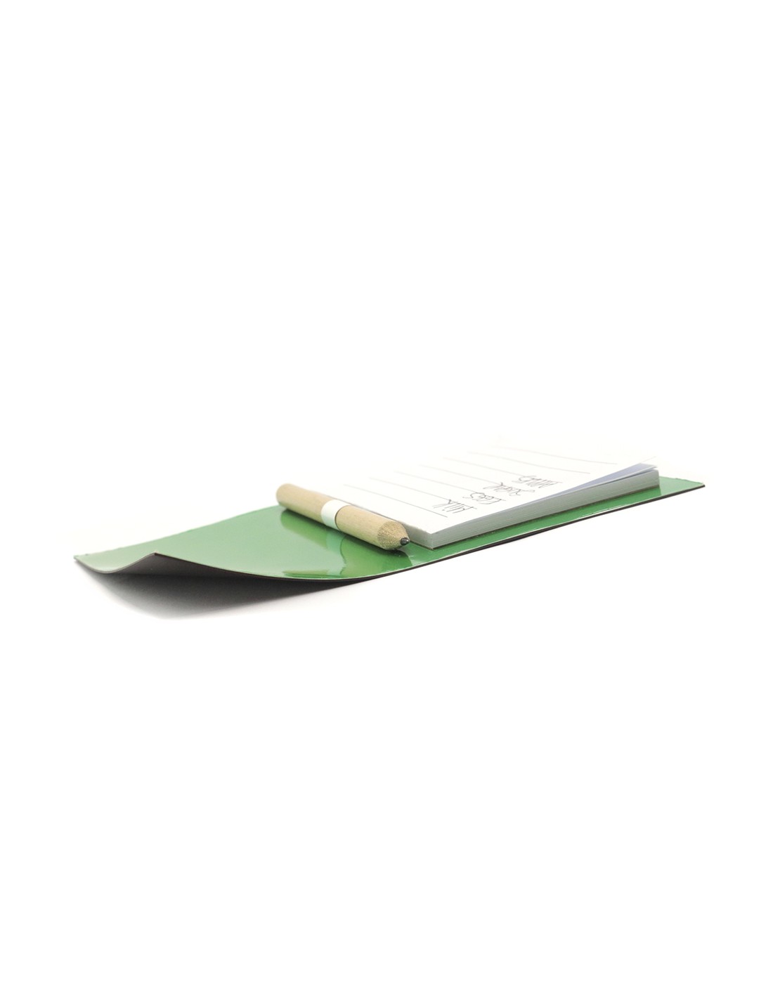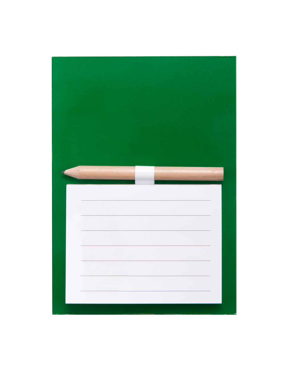 Imán bloc de notas en resistente cartón de vivos y variados colores. Bloc de 40 hojas de distribución a una raya con soporte para minilápiz -incluido-.