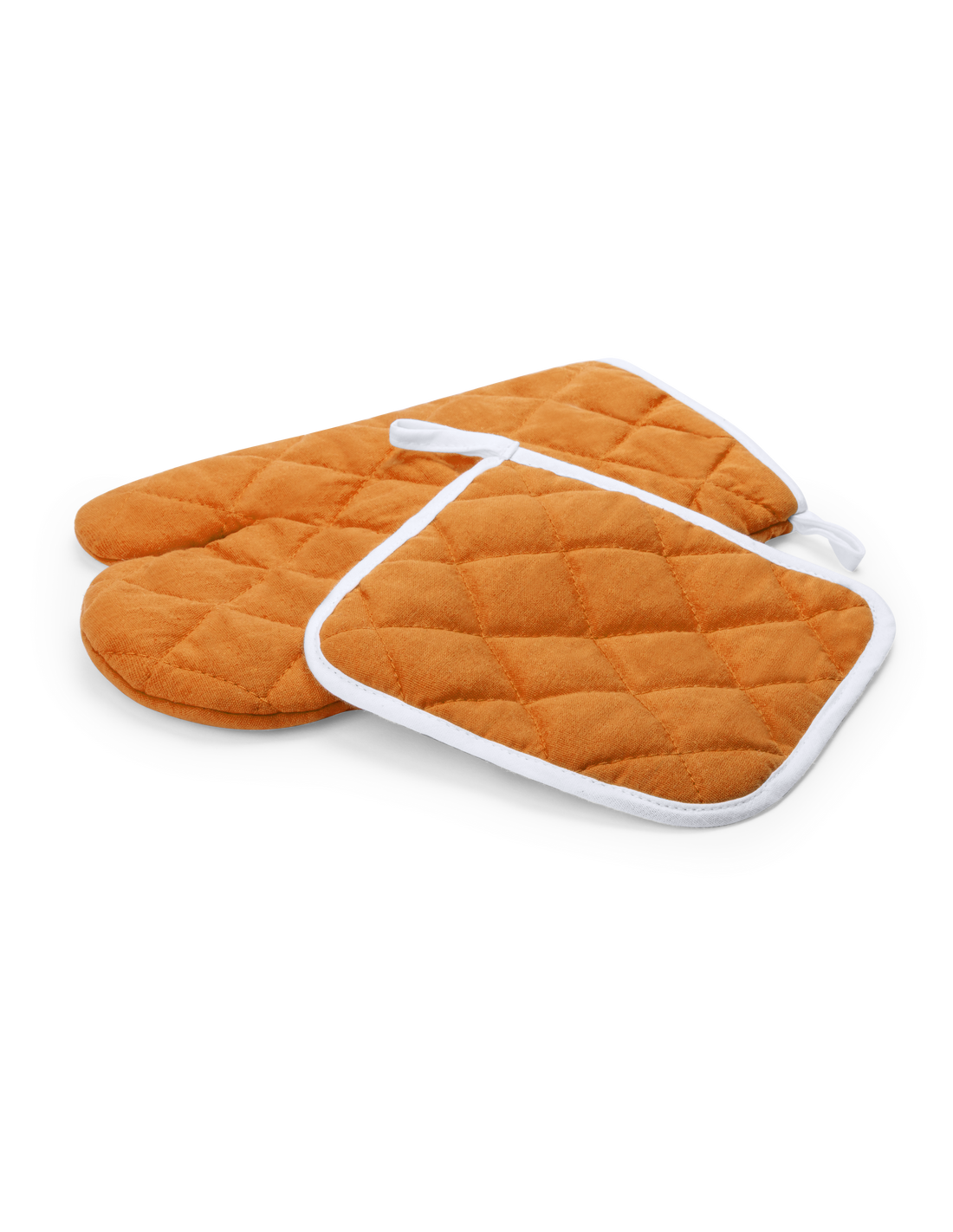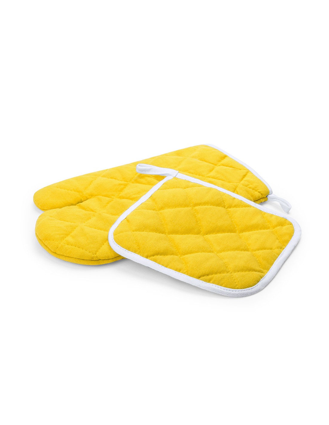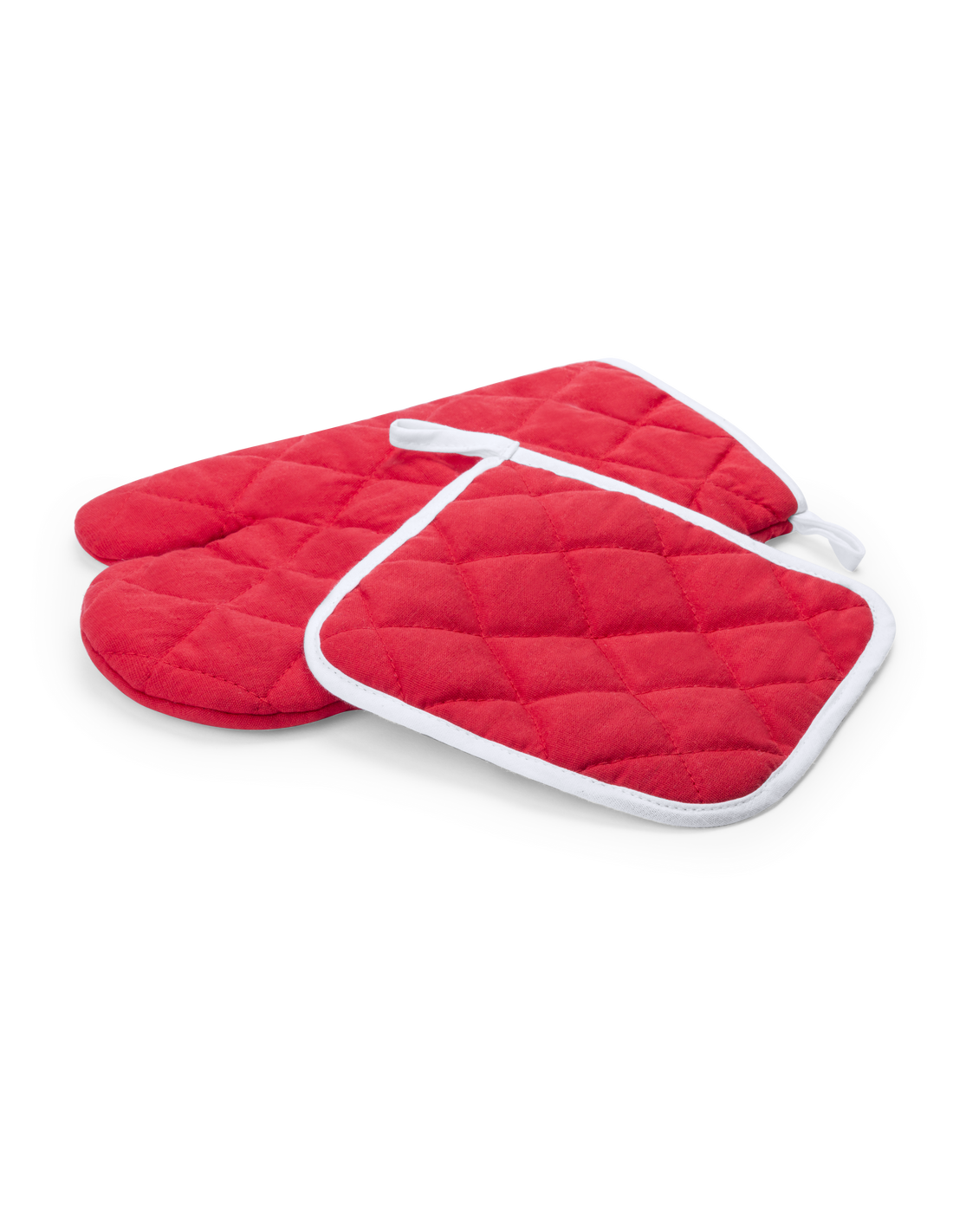 Set de cocina con agarrador y manopla en material TC -combinado de algodón y poliéster-. En variada gama en vivos colores con interior en blanco. Una cara lisa especialmente diseñada para impresión y cinta para colgar.