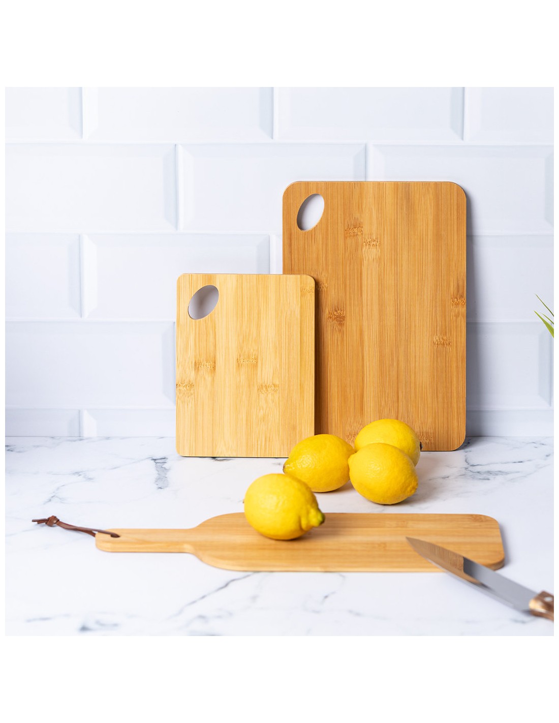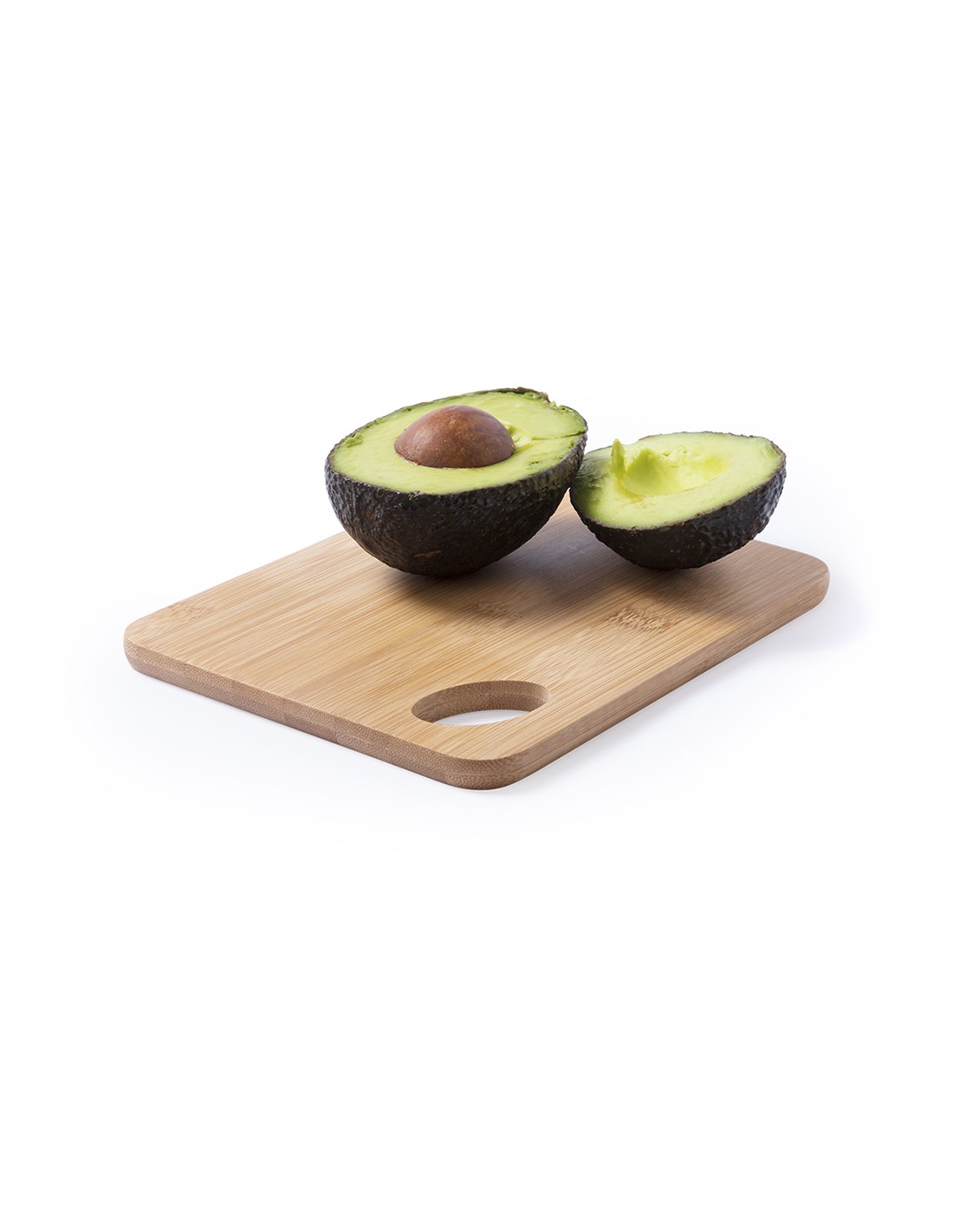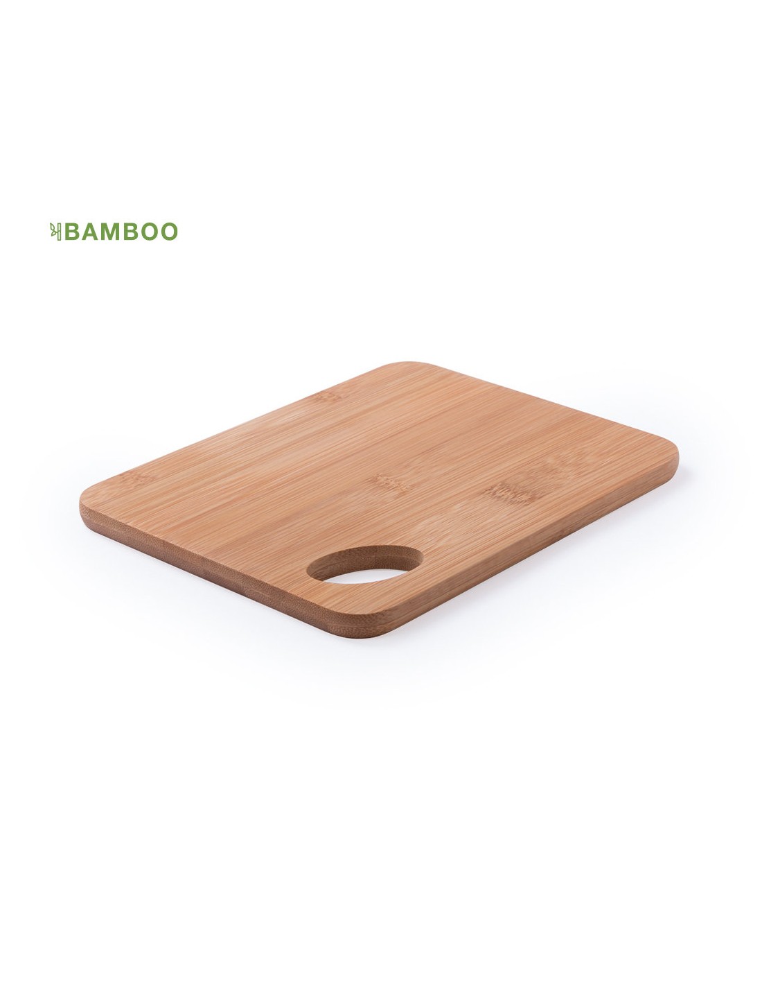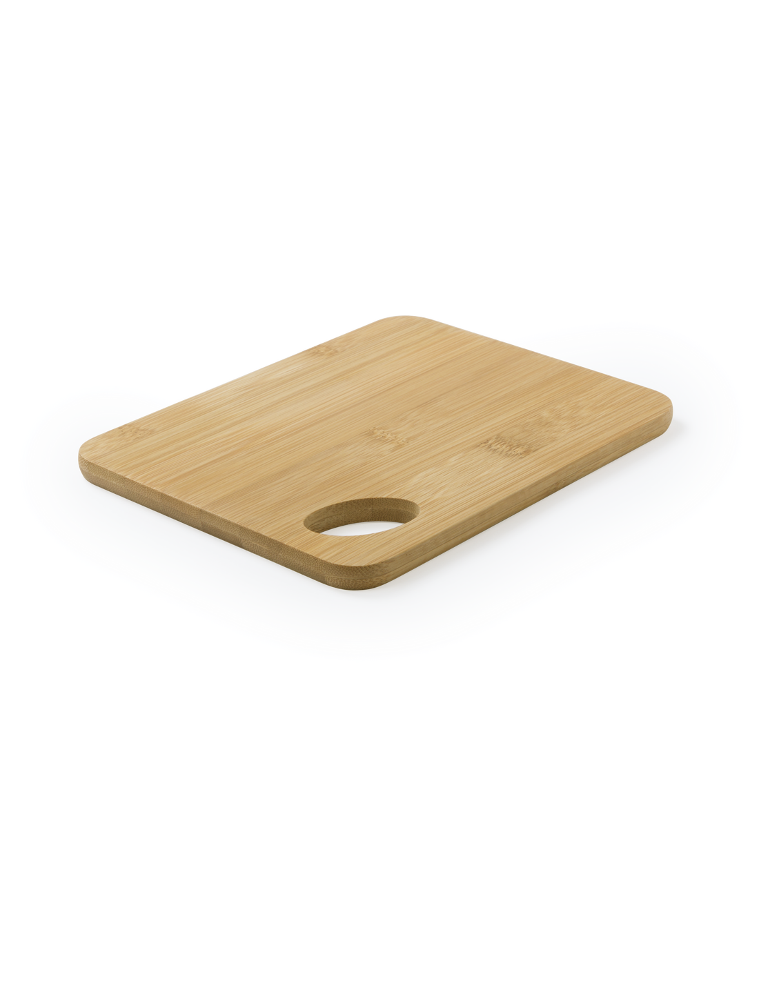 Tabla en madera de bambú, de suave y resistente acabado. Con troquelado para fácil manejo.