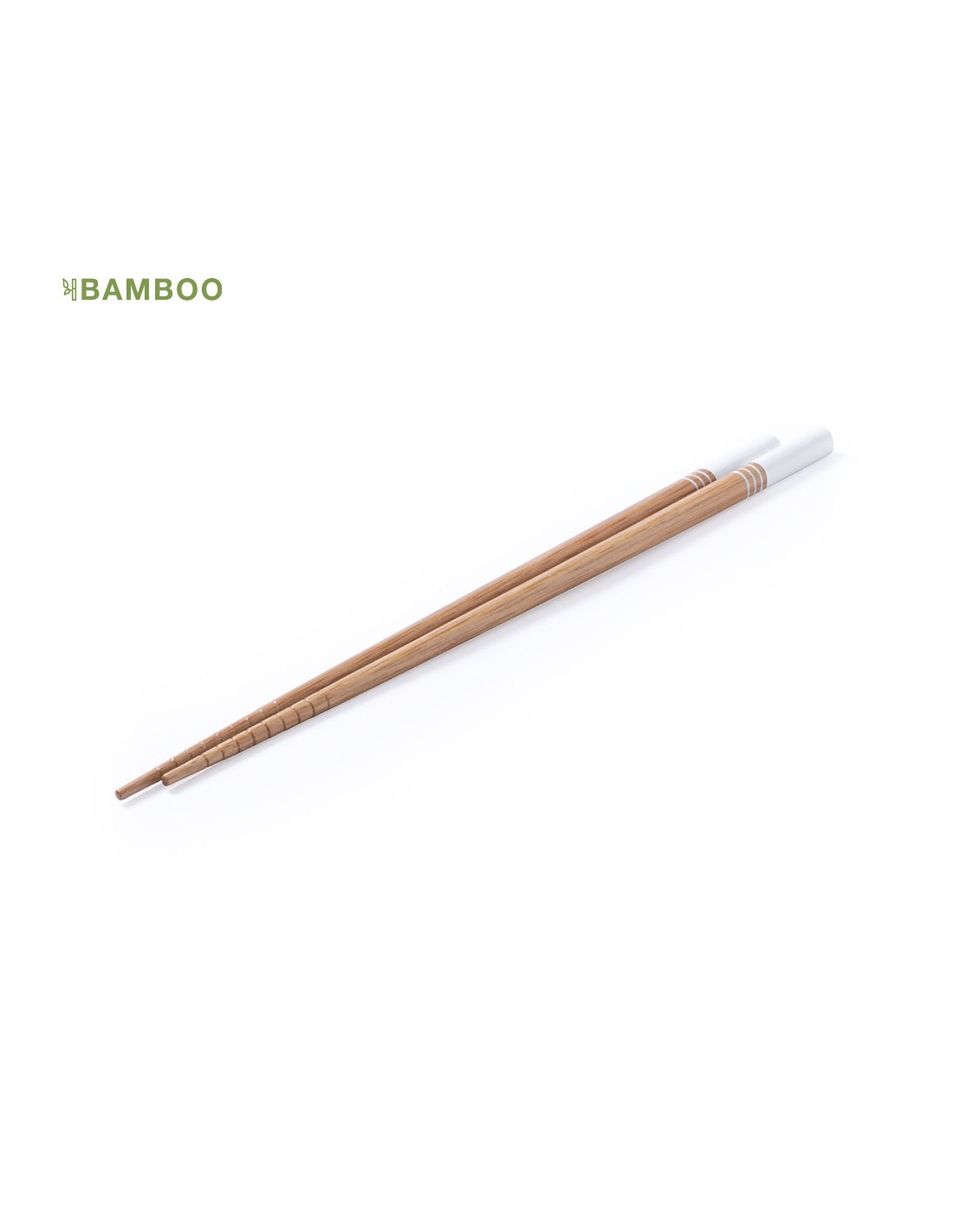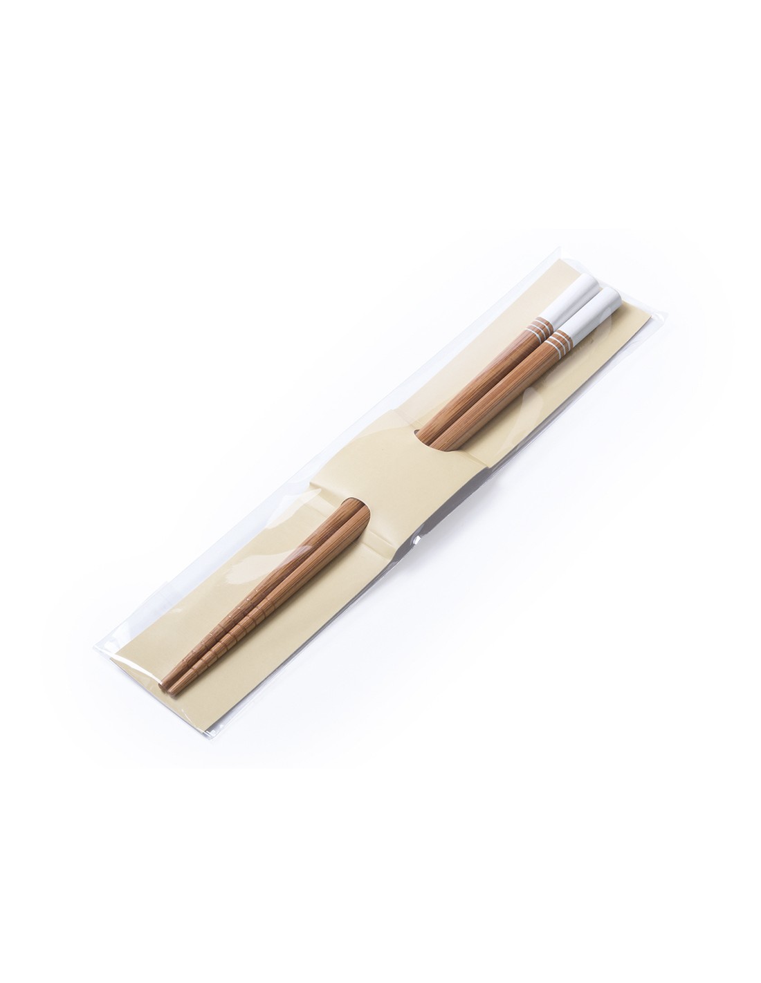 Set de 2 palillos de bambú de fino acabado con accesorios en sobrios colores. Presentados en funda individual de cartón con troquelado.