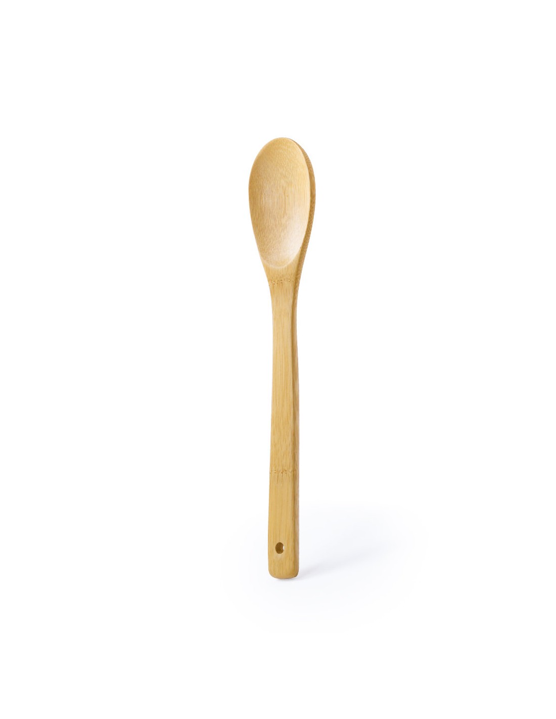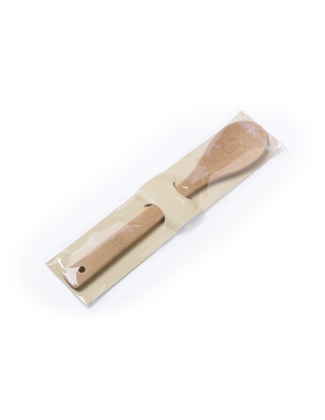 Cuchara de cocina en madera de bambú. Presentada en bolsa individual con cartón troquelado de refuerzo.