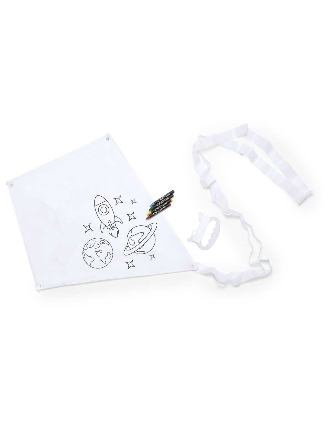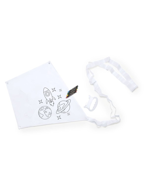 Divertida cometa para montar y pintar en resistente poliéster 190T, con 4 ceras incluidas.