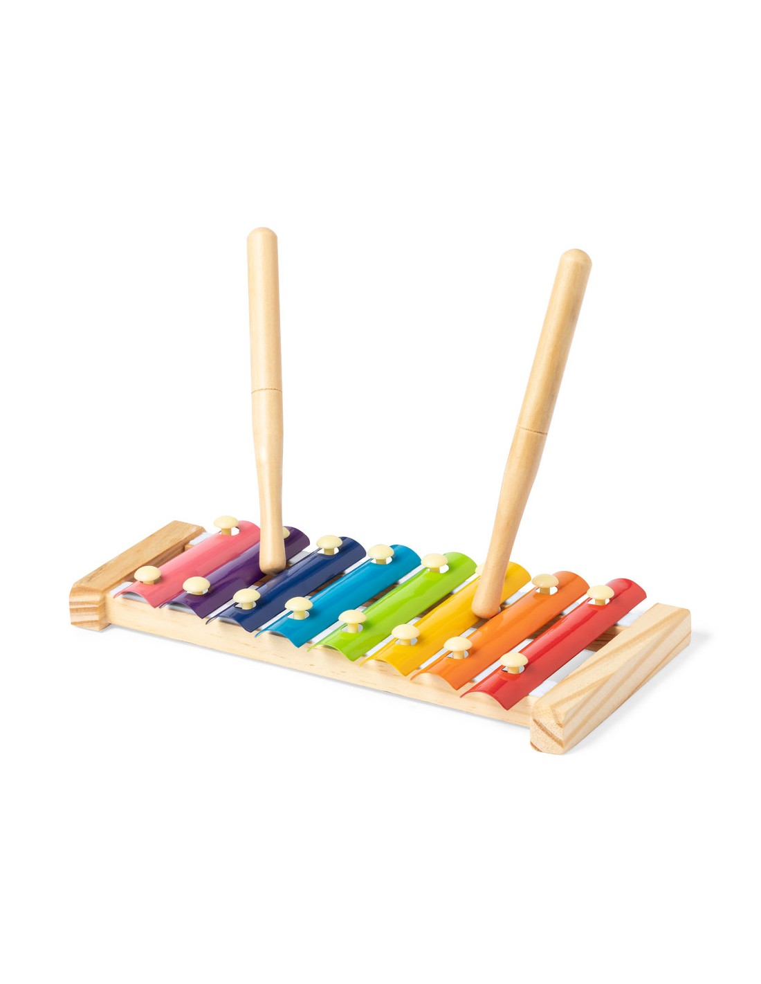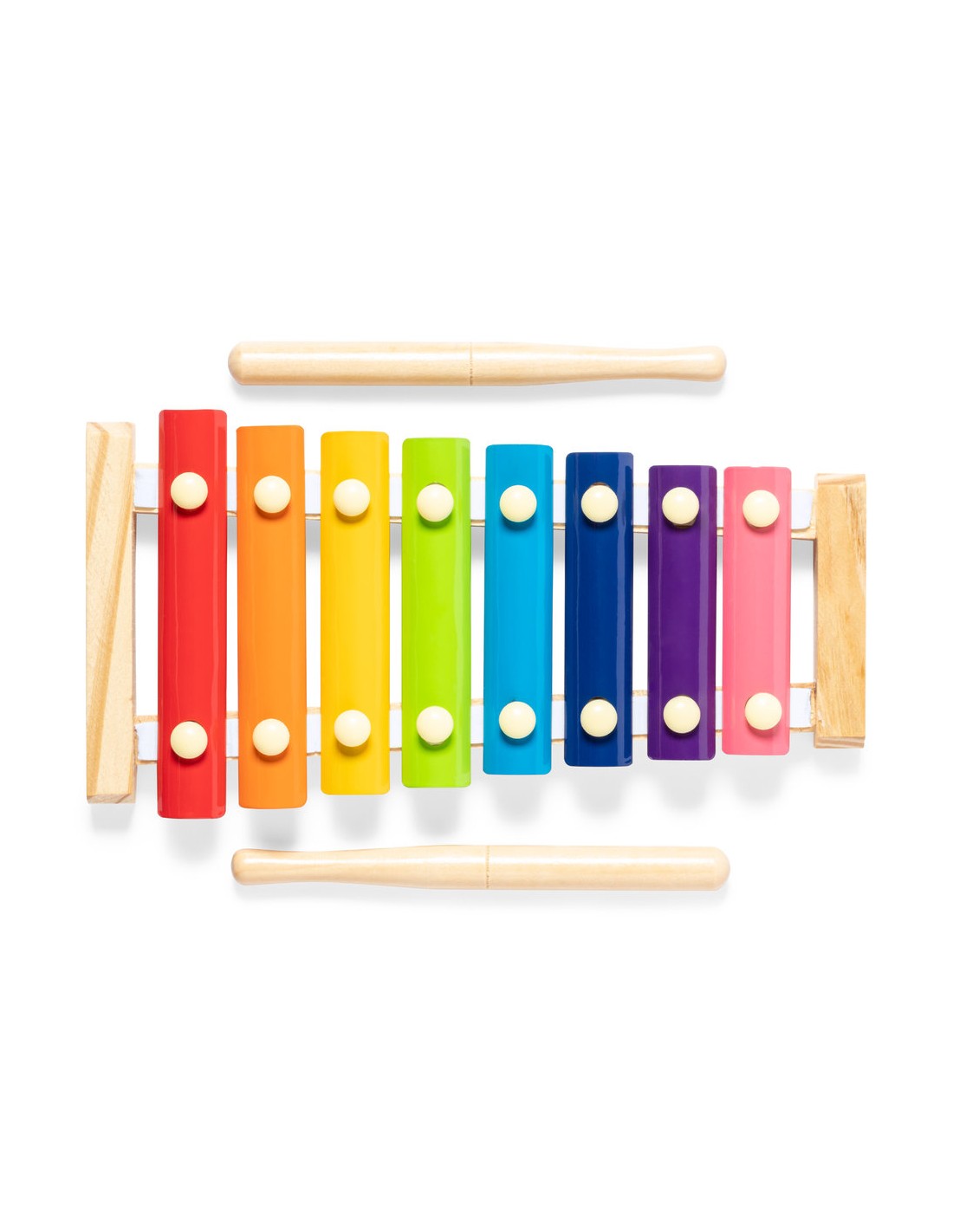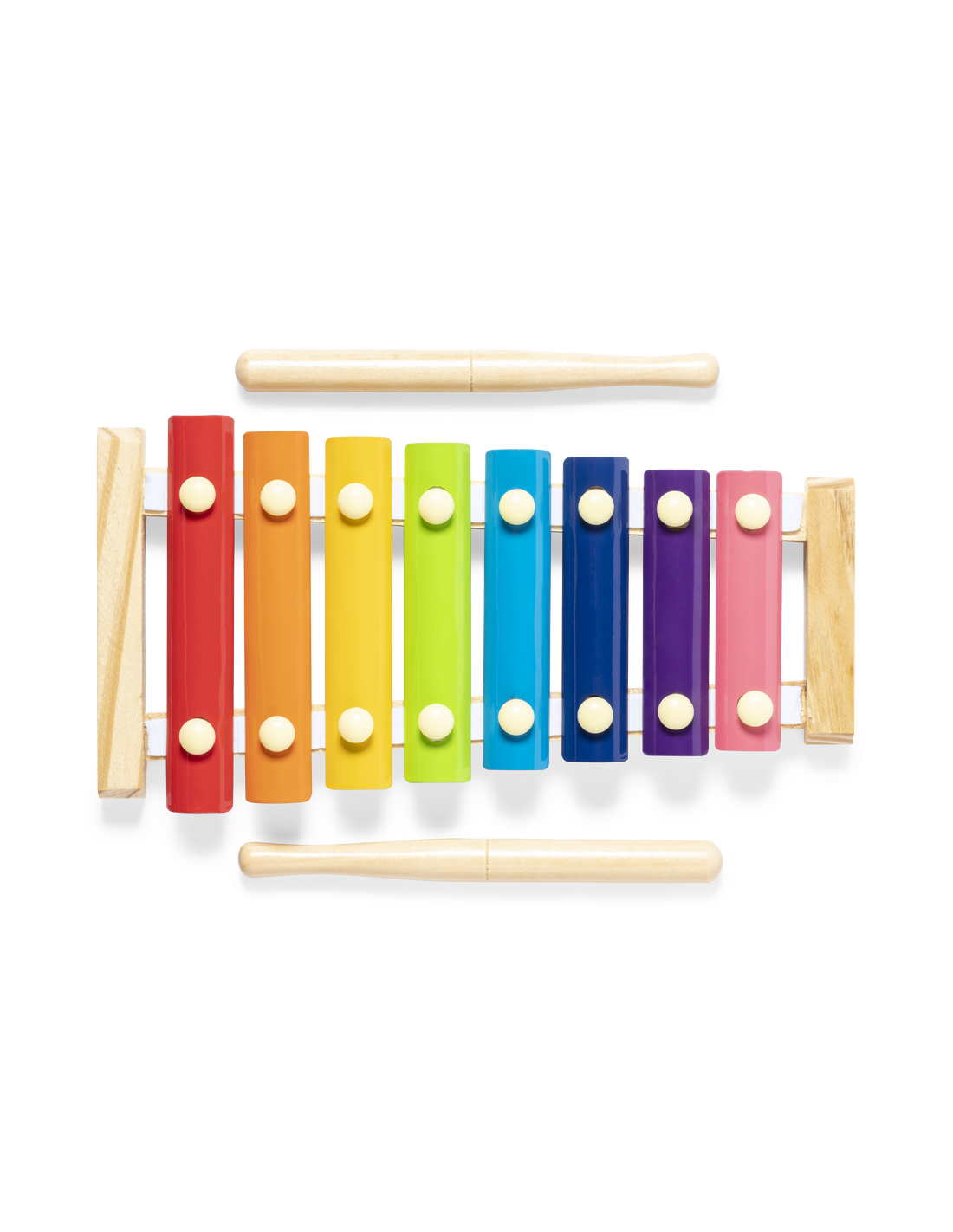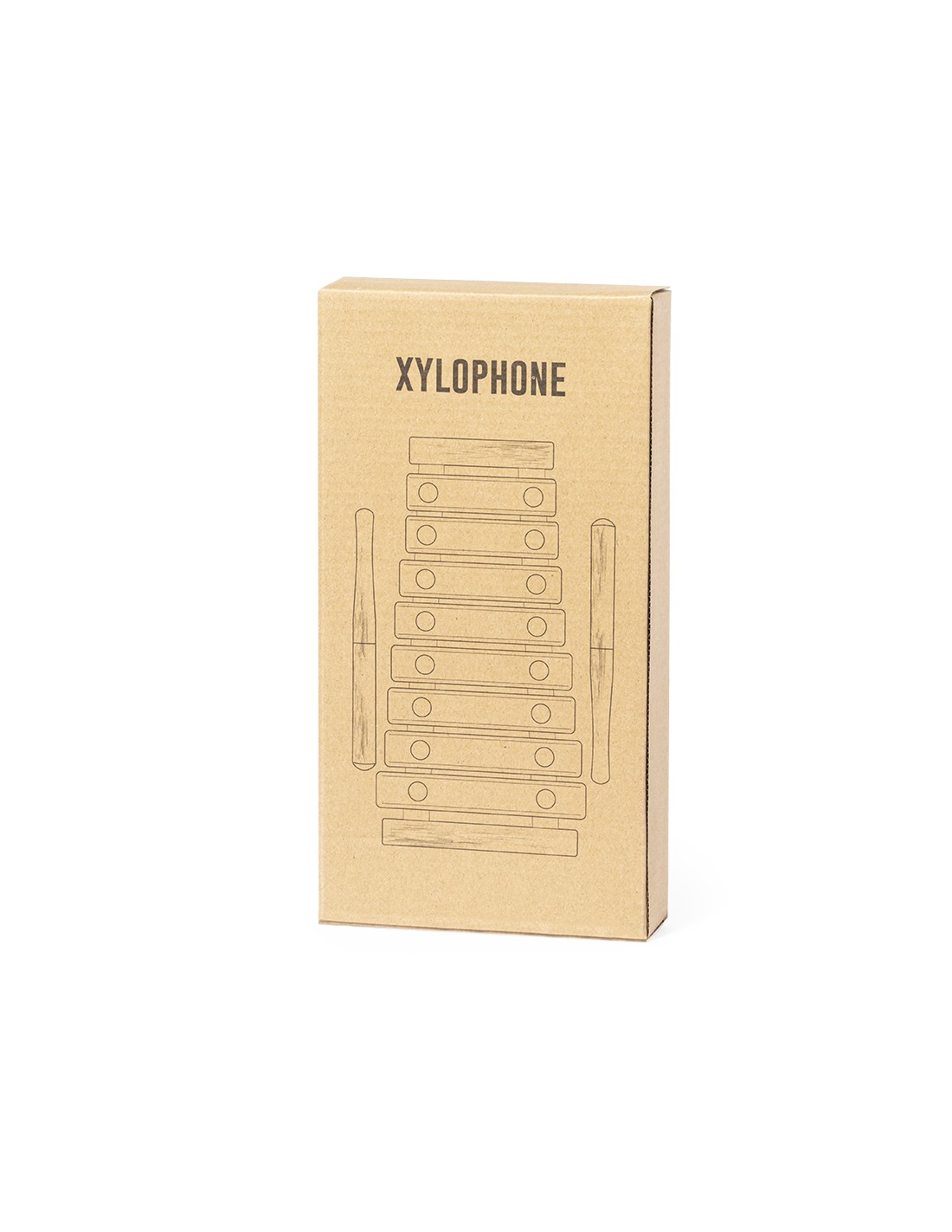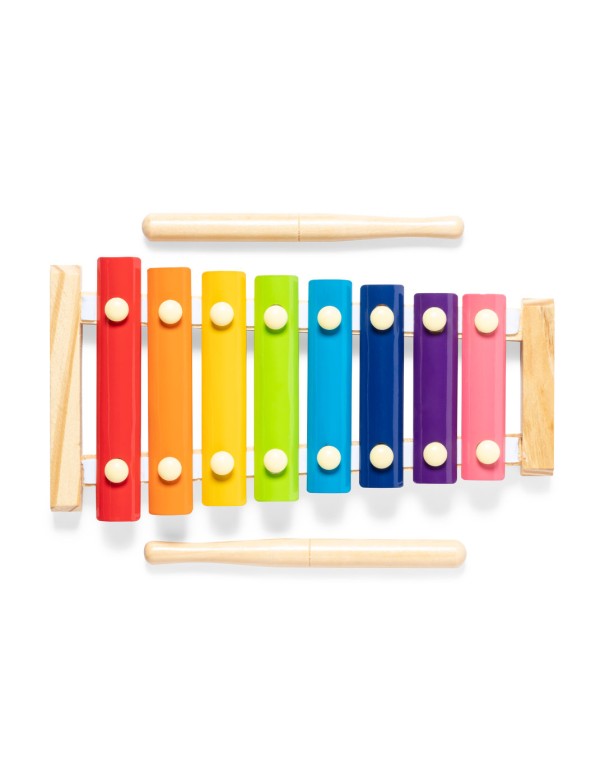 Xilófono con base y baquetas en madera natural de pino. Teclas metálicas multicolor y presentado en caja individual de diseño kraft.