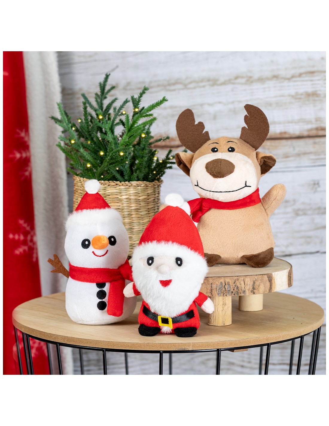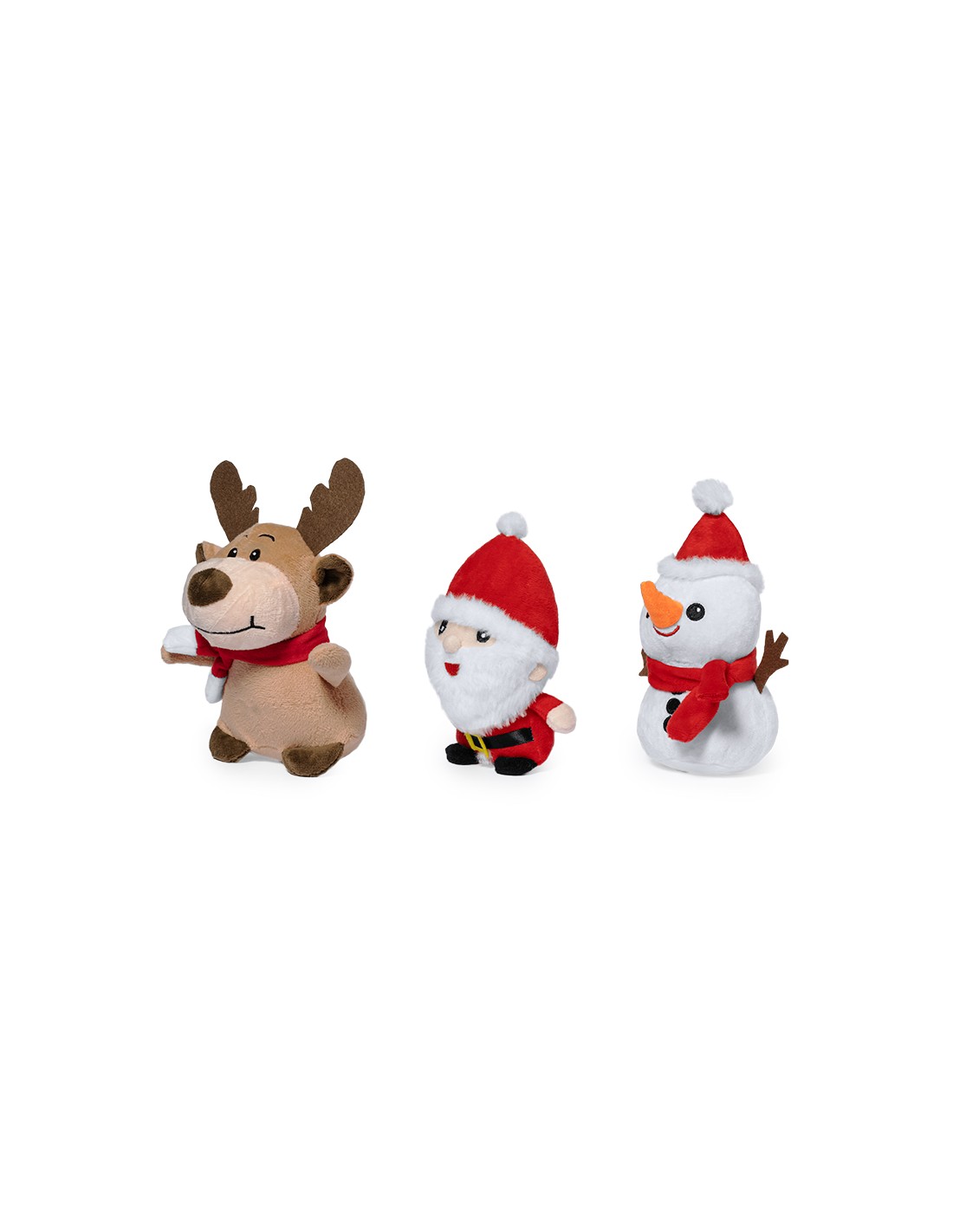 Suaves y adorables peluches con motivos navideños. Disponibles en tres divertidos y originales diseños: Papa Noel, Muñeco de Nieve y Reno. Presentado en bolsa individual reciclada.