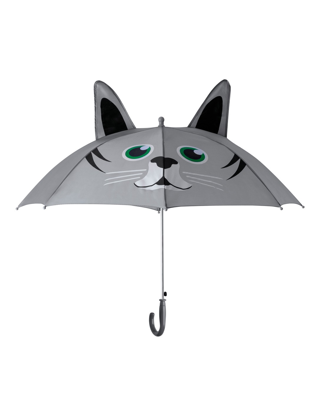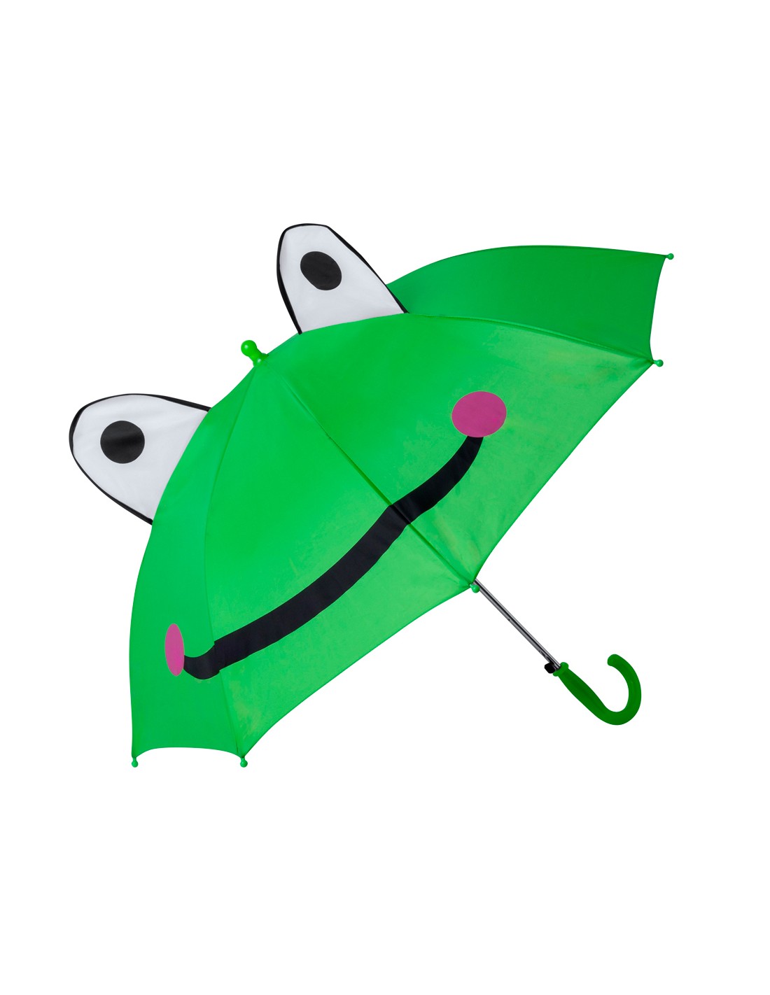 Paraguas infantil con divertidos diseños de gato y rana. De 78cm de diámetro y fabricado en resistente material poliéster 180T. Apertura automática, con caña y varillas de metal, mango curvo y funda de poliéster a juego.