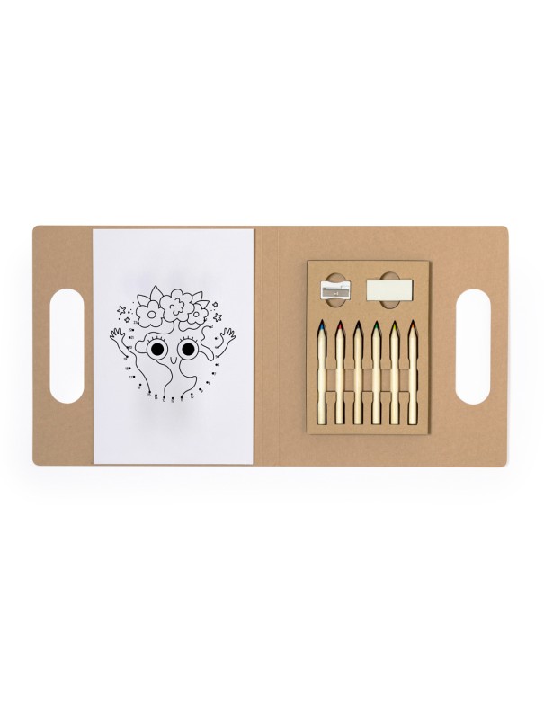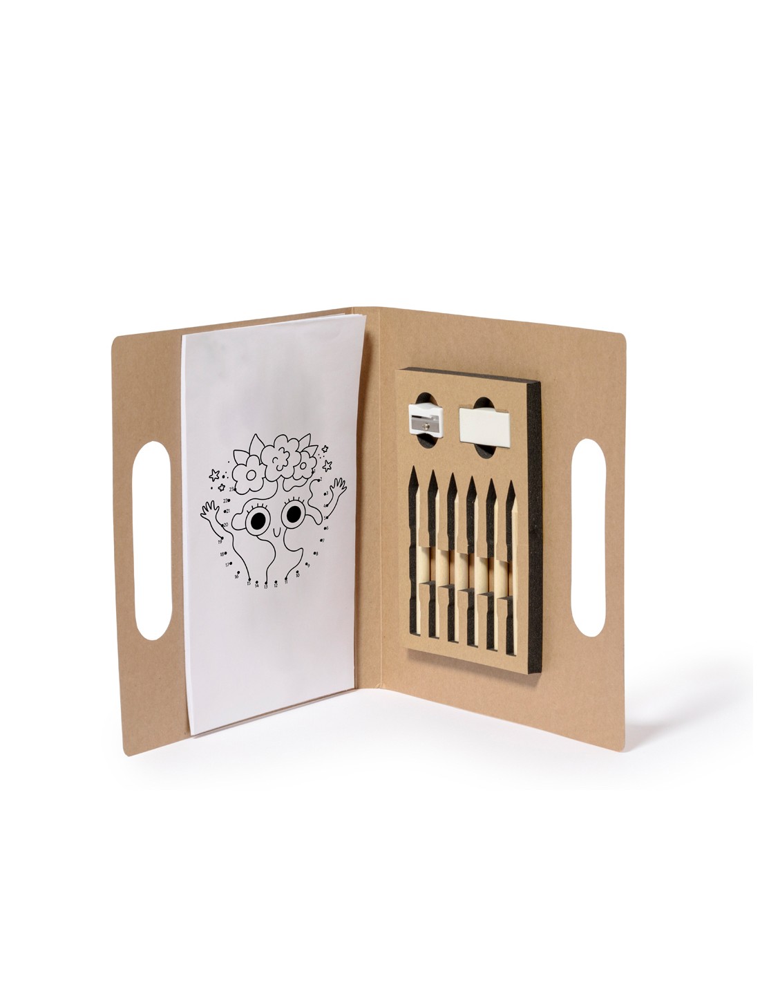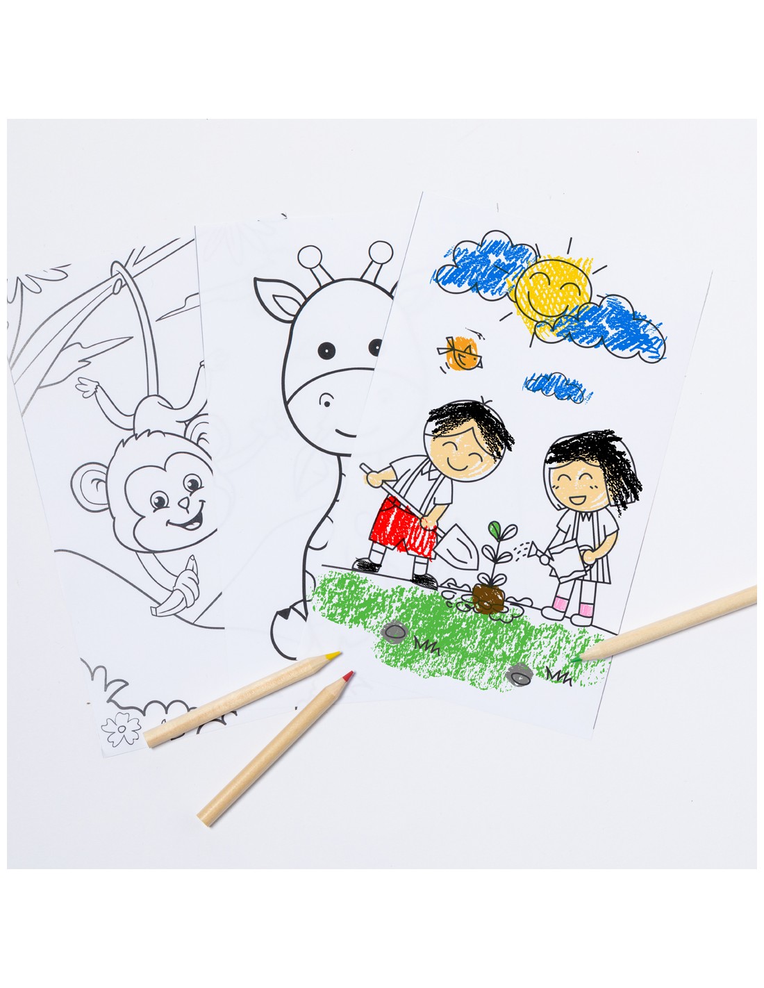 Set para colorear hecho en cartón reciclado. Divertido conjunto de dibujos y lápices de colores en una práctica carpeta con asas. Incluye:Bloc de 20 hojas con dibujos de naturaleza para colorear.Caja con 6 lápices de madera con minas en multitud de colores.Sacapuntas.Goma de borrar.