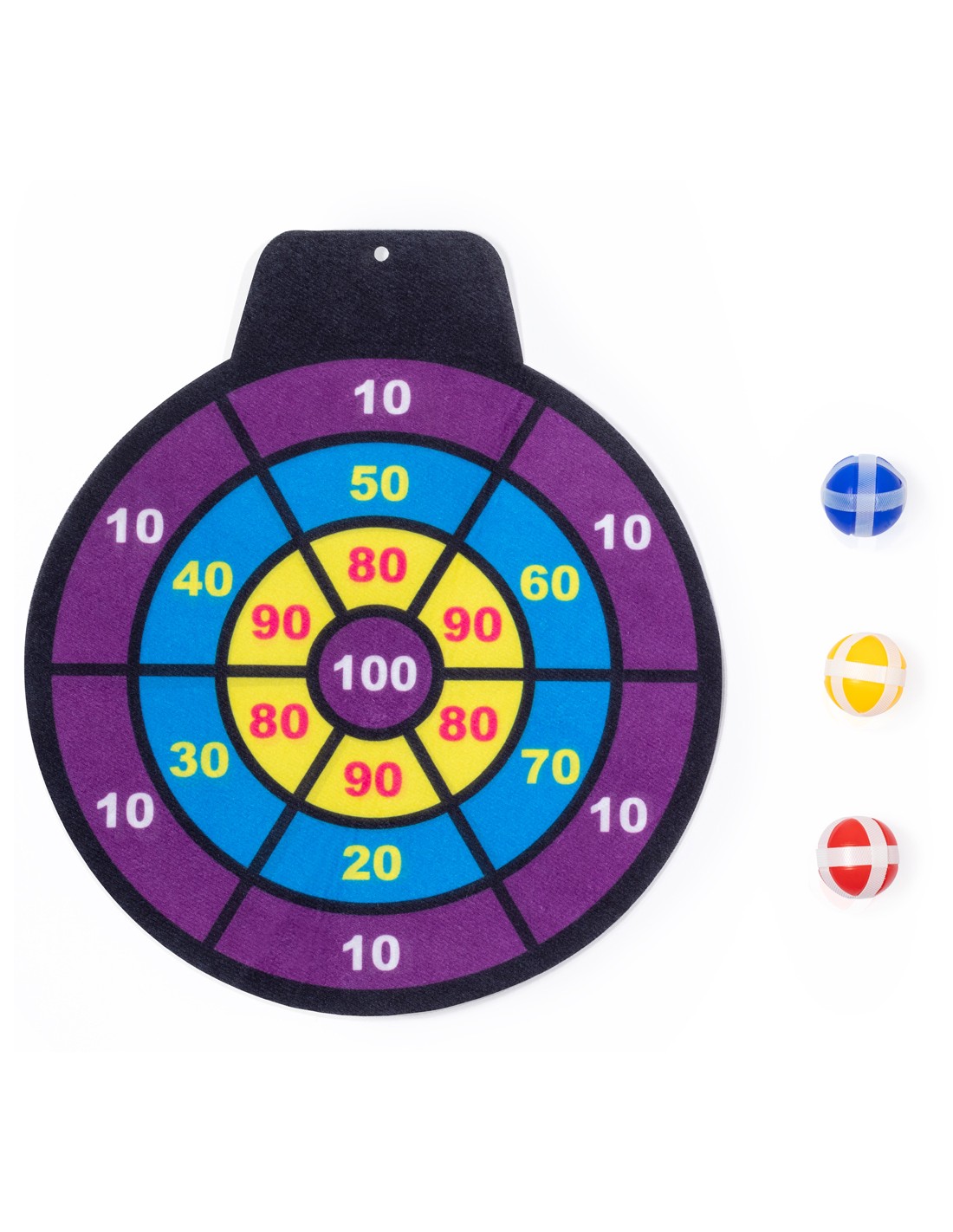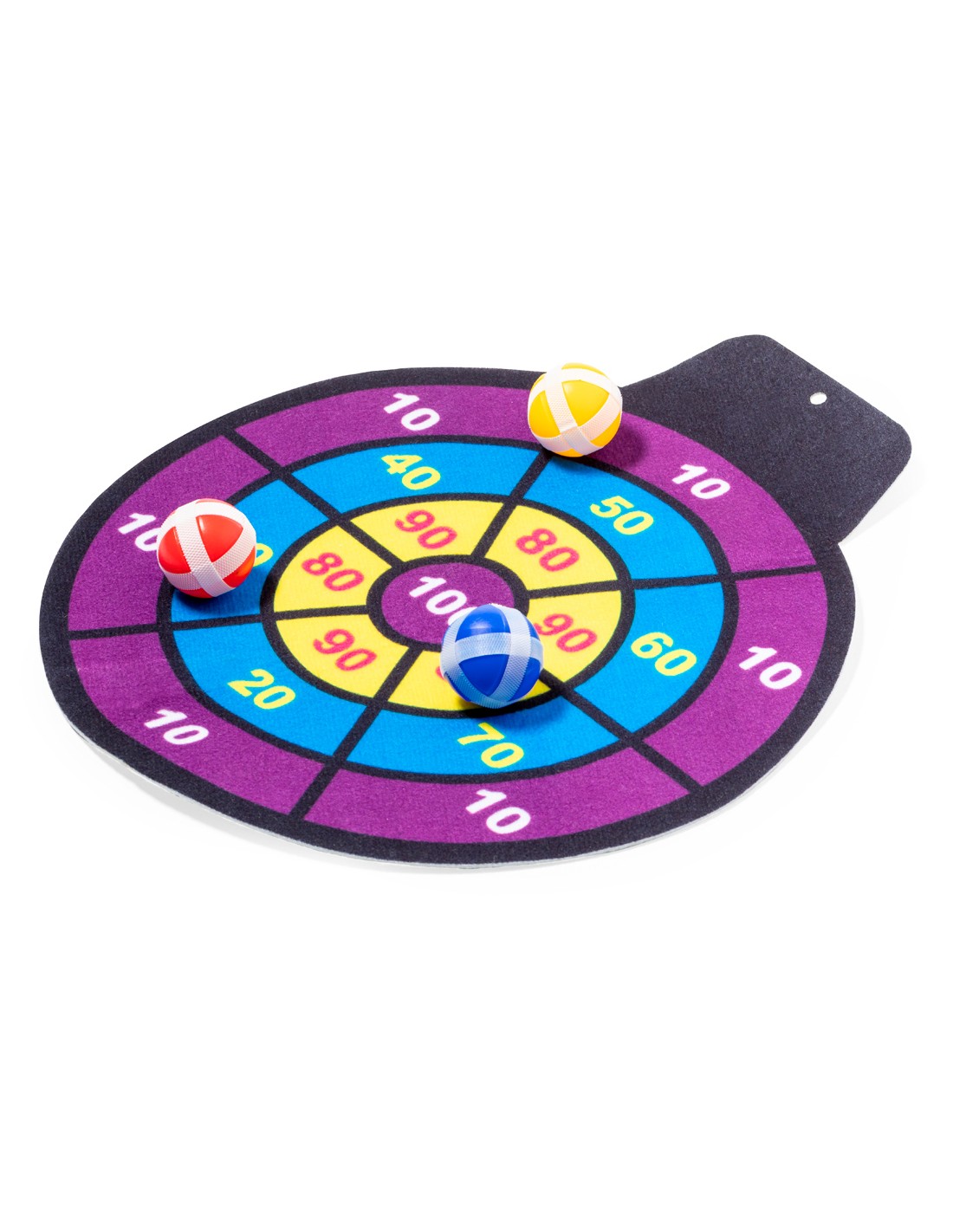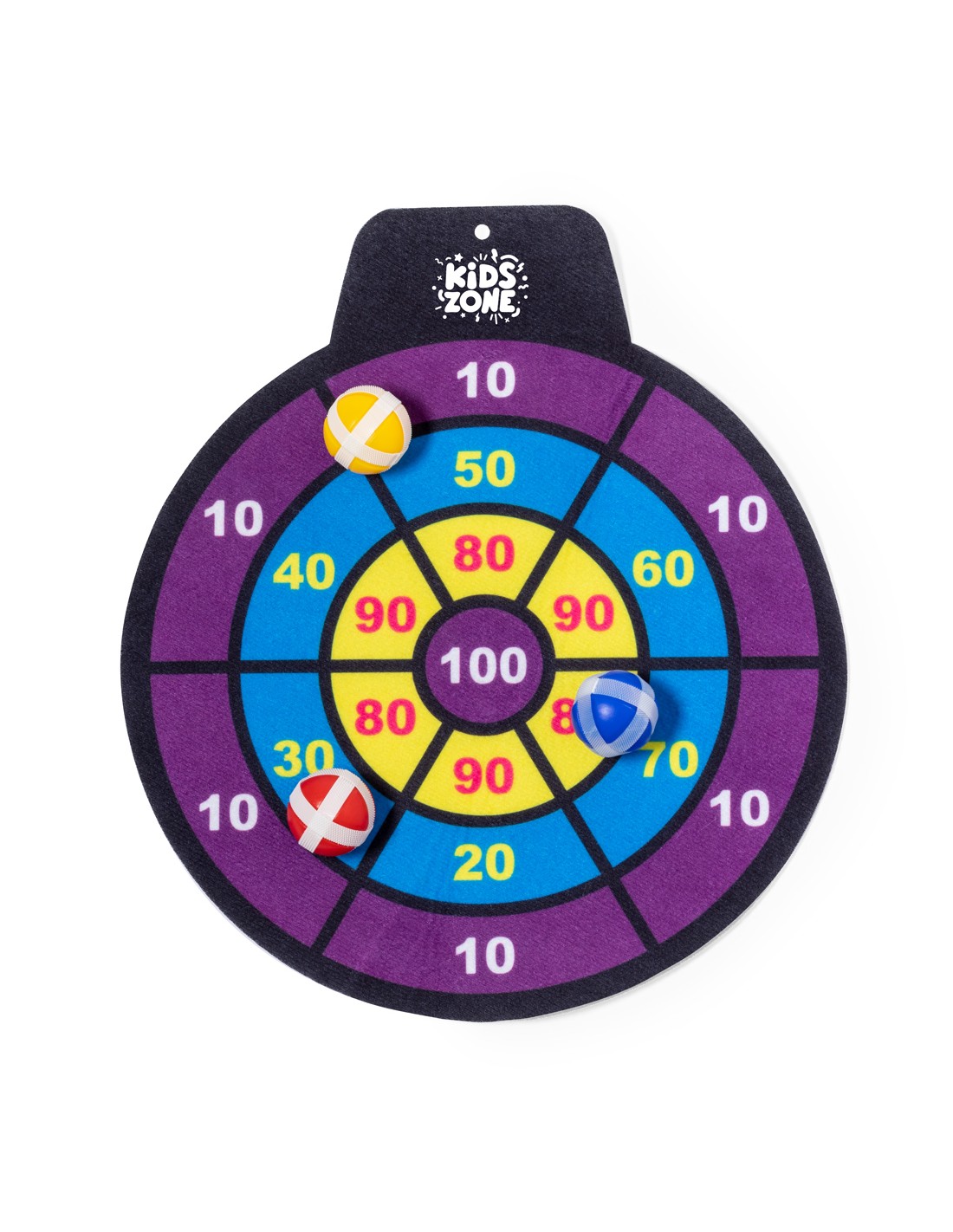 Divertida diana de tela con pelotas de velcro. Perfecta para todas las edades ofreciendo un objetivo desafiante y seguro. El juego consiste en lanzar a la diana con puntuaciónes las pelotas de distintos colores, que se quedarán fijas gracias a su envoltura de velcro. Fácil de colgar en cualquier sitio y a cualquier altura mediante agujero. Incluye diana de tela flexible y 3 pelotas con velcro. Presentado en bolsa reciclada.