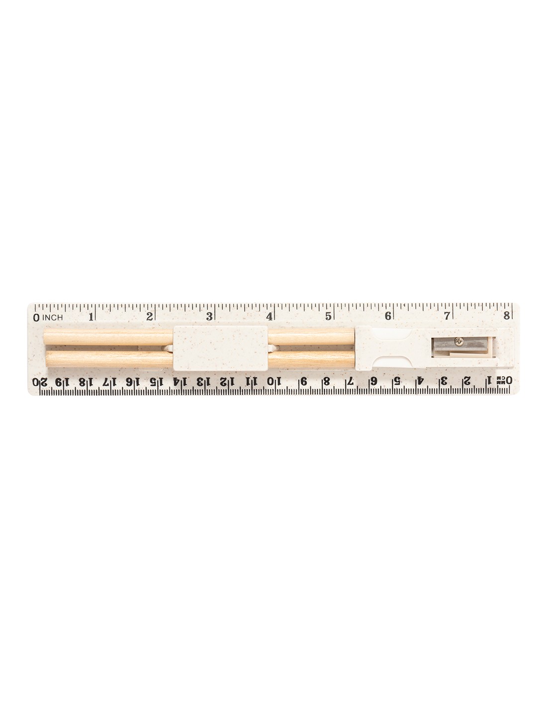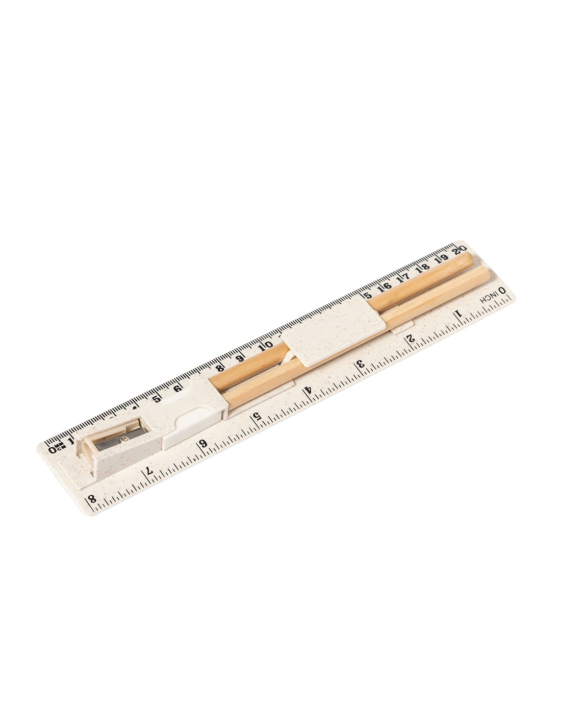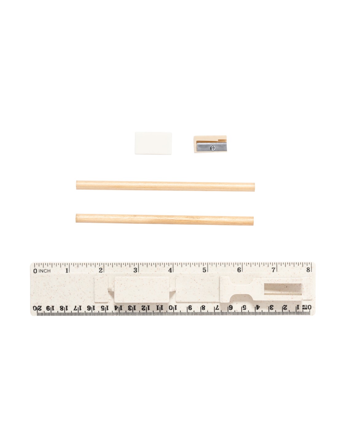 Set de 5 piezas fabricado en caña de trigo. Incluye 2 lápices de madera con mina negra y cuerpo cilíndrico blanco; goma y sacapuntas. Presentado en estuche/regla de 20 cm/8 pulgadas, con compartimentos para los distintos elementos del set. Presentado individualmente en una bolsa de papel blanca. La caña de trigo fomenta la utilización de materias primas naturales, reduciendo así las emisiones contaminantes.