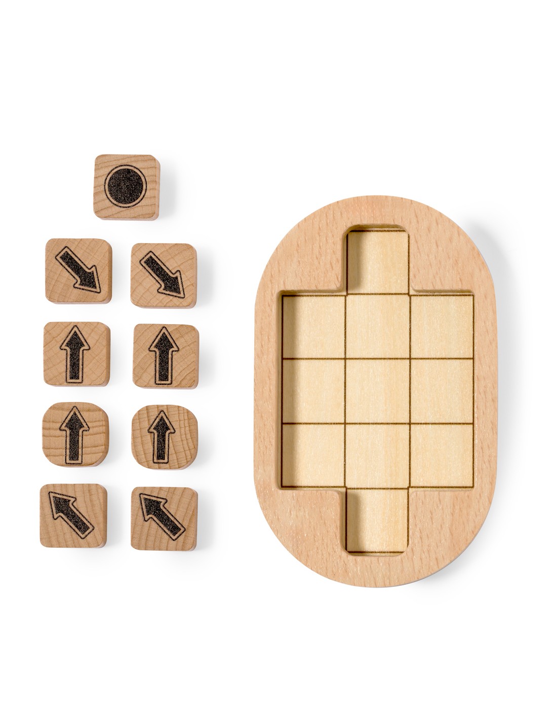 Juego de habilidad fabricado en madera, compuesto por 9 piezas y un tablero. El desafío consiste en deslizar las 8 piezas con flechas por el tablero para ordenarlas apuntando a la ficha con un punto, ofreciendo destreza y estrategia. Presentado individualmente en una caja de diseño kraft.