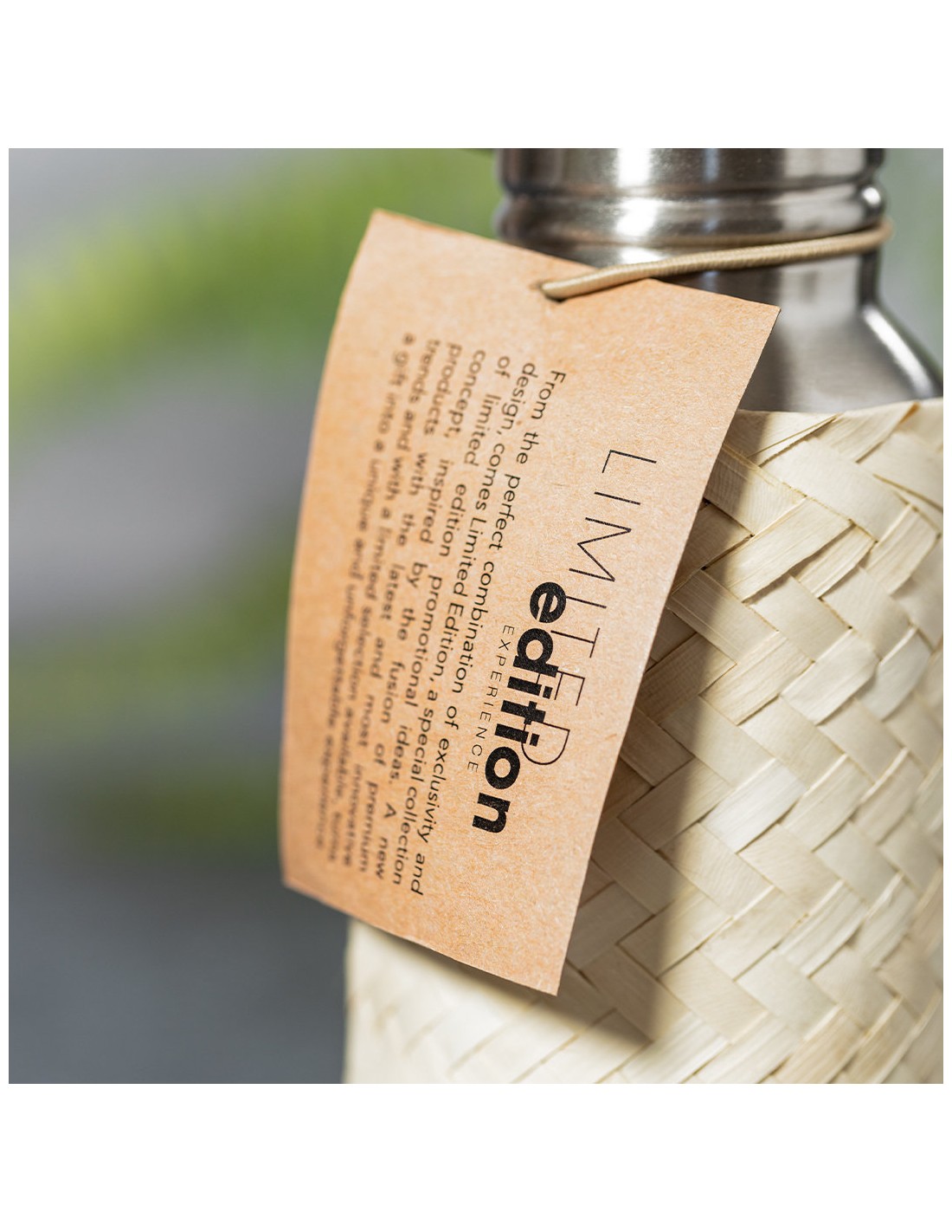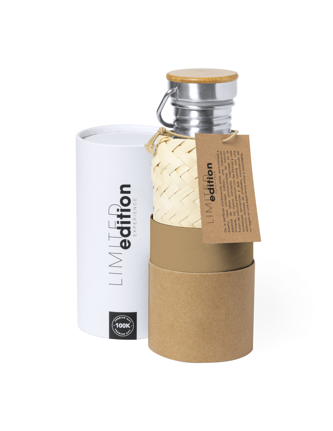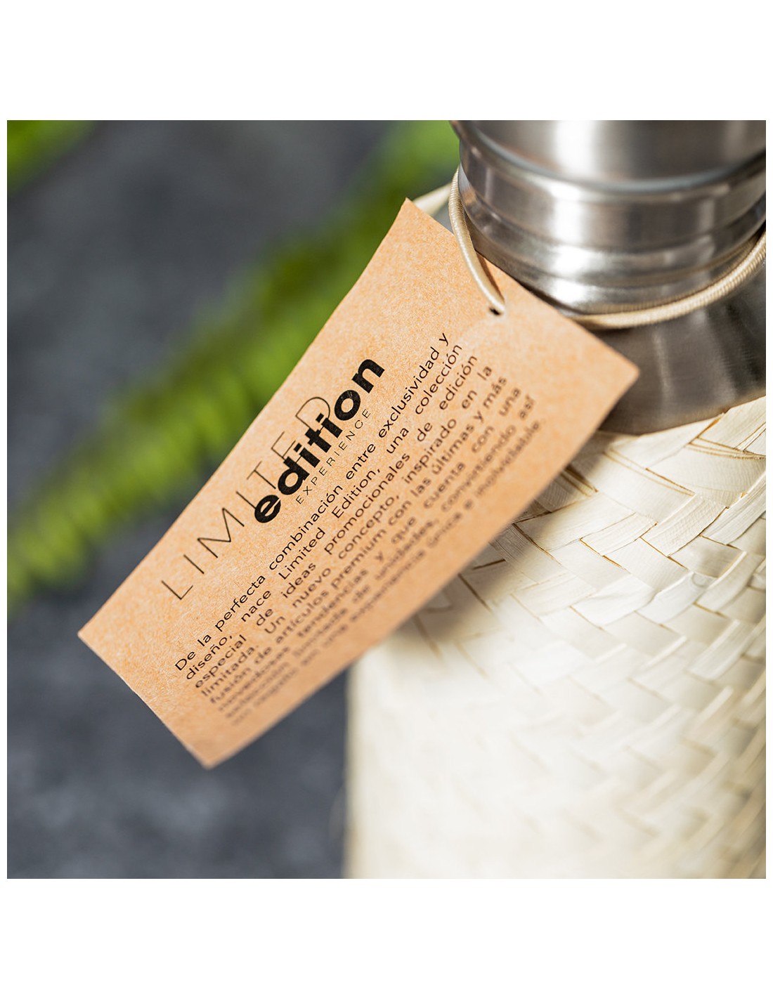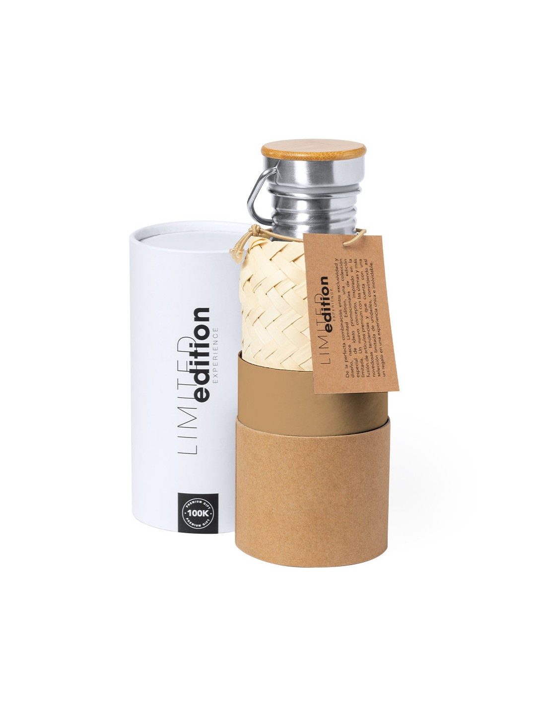 Bidón Limited Edition. Envuelto en un ecodiseño de líneas suaves, este bidón combina cuerpo en acero inoxidable, funda de paja y tapón de seguridad a rosca con base de bambú. Incluye asa de transporte. De 600ml de capacidad. De la perfecta combinación entre exclusividad y diseño, nace Limited Edition, una colección especial de ideas promocionales de edidición limitada. Un nuevo concepto, inspirado en la fusión de artículos premium con las últimas y más novedosas tendencias y que cuenta con una seleción limitada de unidades, convirtiendo así un regalo en una experiencia única e inolvidable. Exclusivo estuche de presentación Limited Edition, con diseño protegido por derechos de propiedad industrial. Incluida tarjeta con descripción de Limited Edition en cartón reciclado.