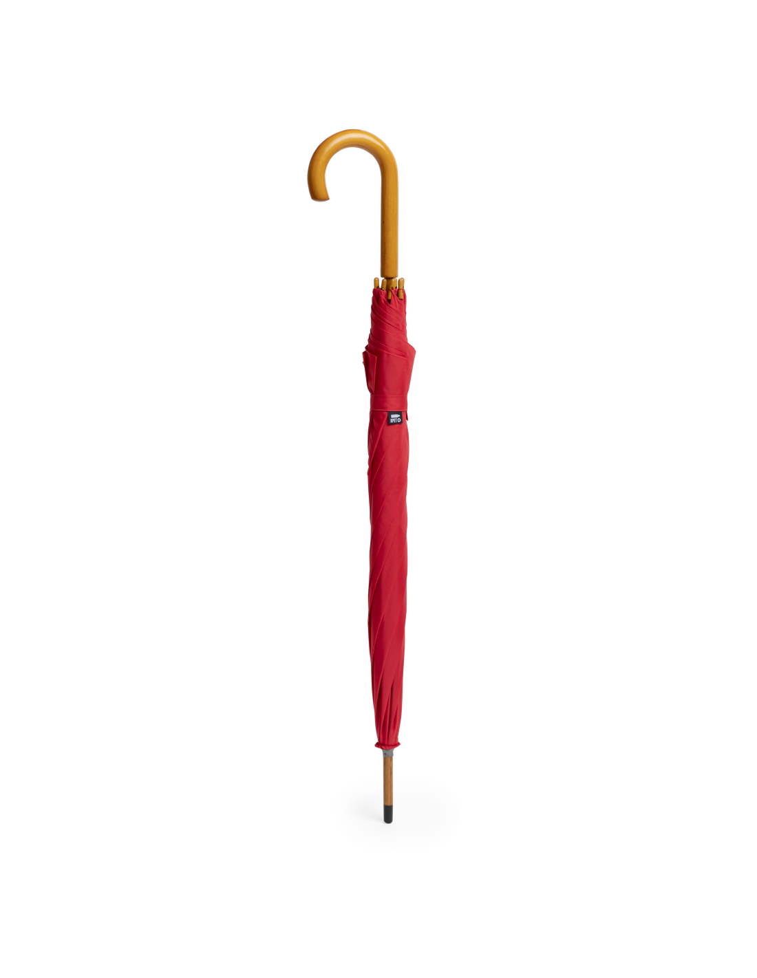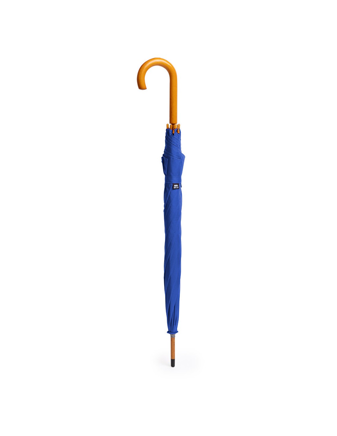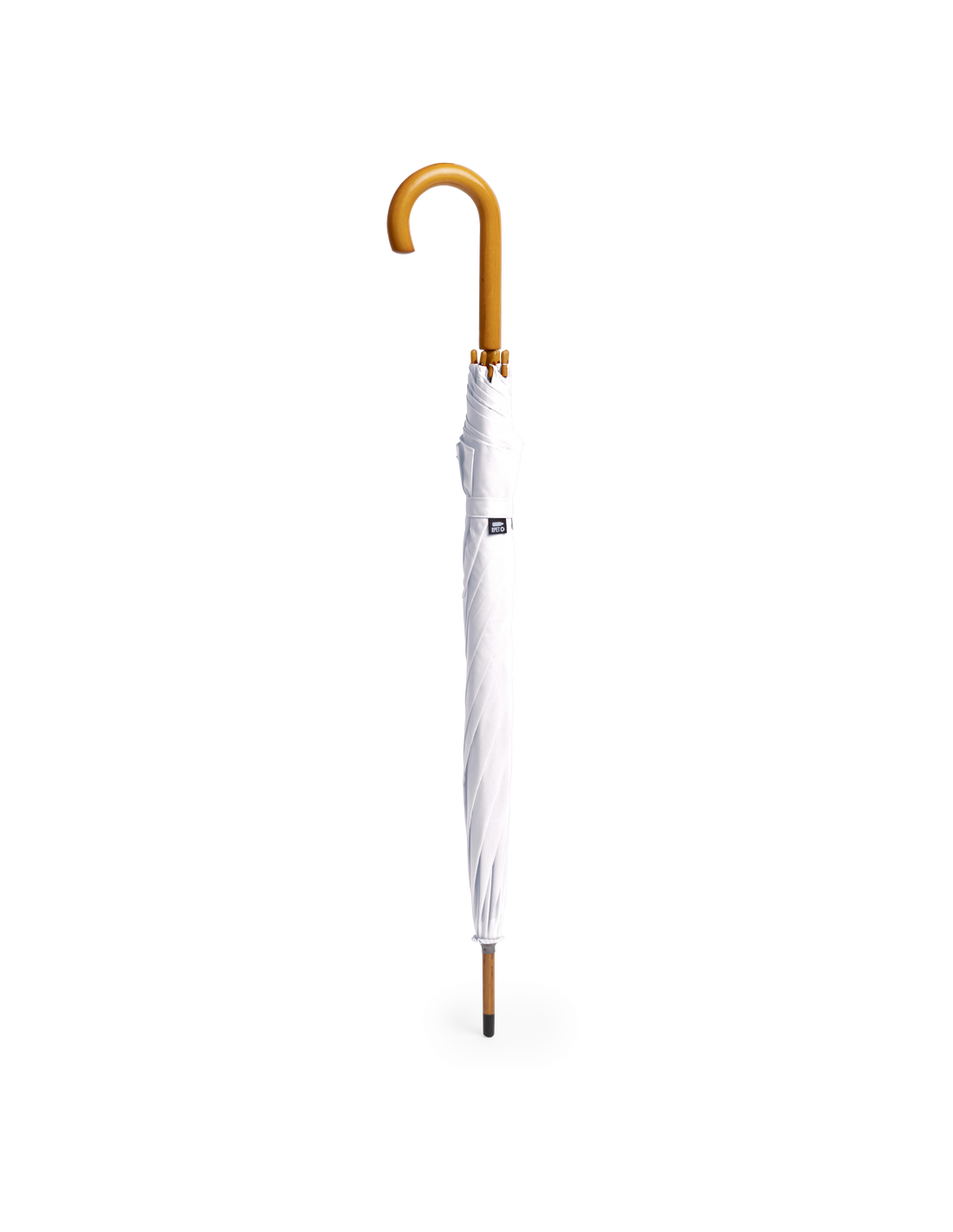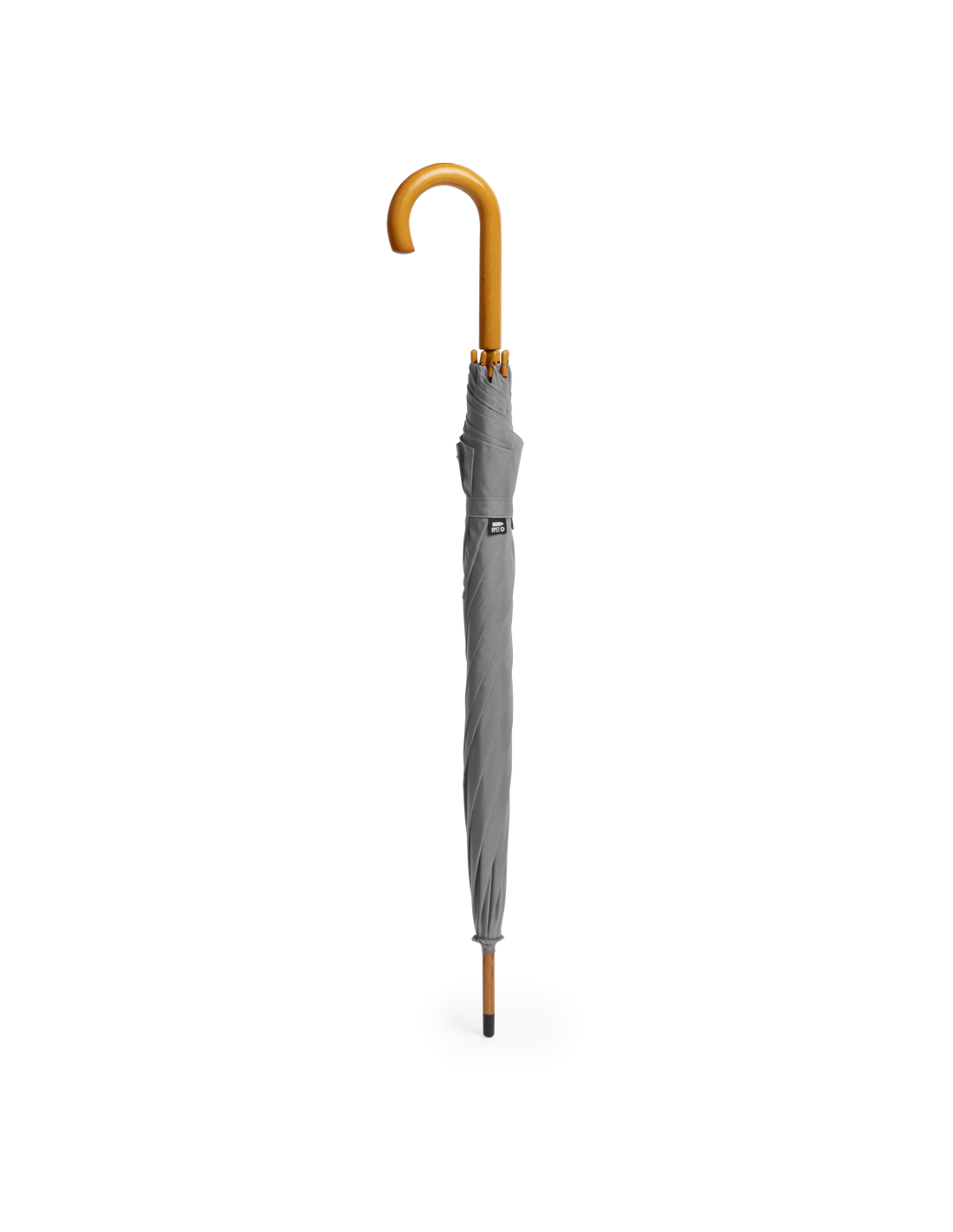 Paraguas de línea nature de 105cm de diámetro. En material pongee 190T RPET, elaborado a partir de plástico reciclado, para así fomentar la reutilización de residuos plásticos y ayudar a la sostenibilidad del planeta. De apertura automática y varillas metálicas. Mango y caña de madera, con etiqueta distintiva RPET