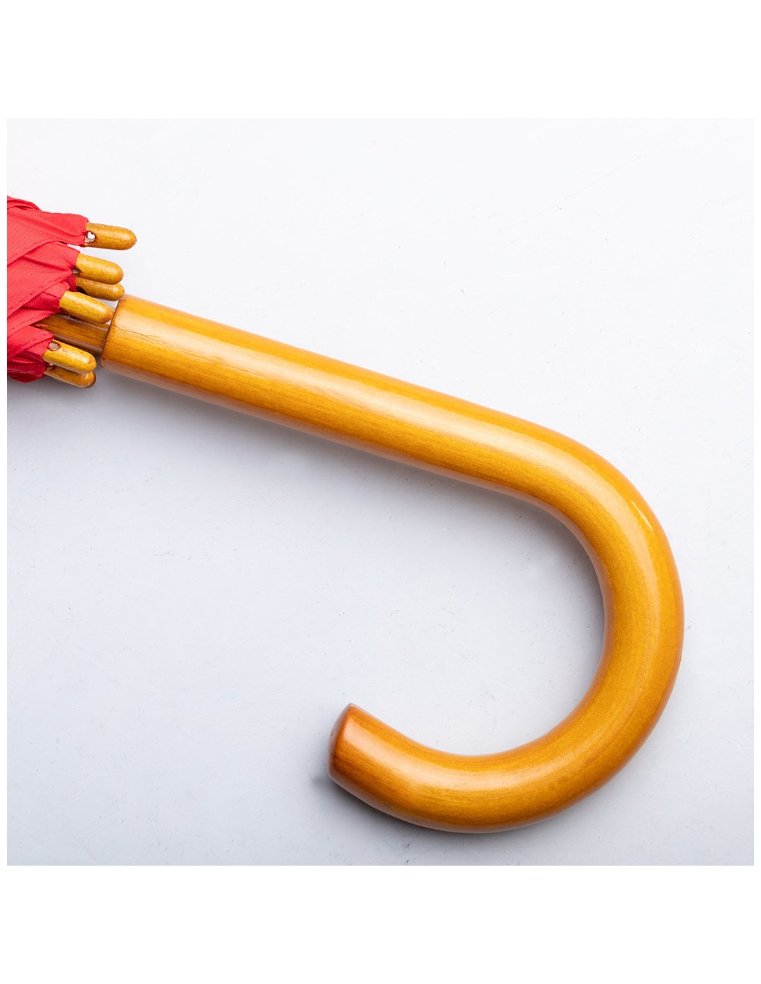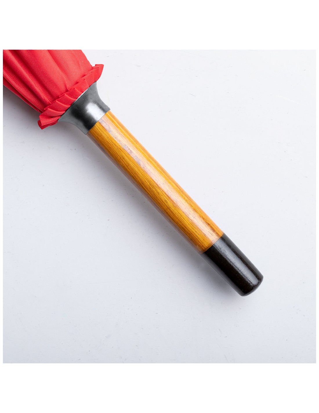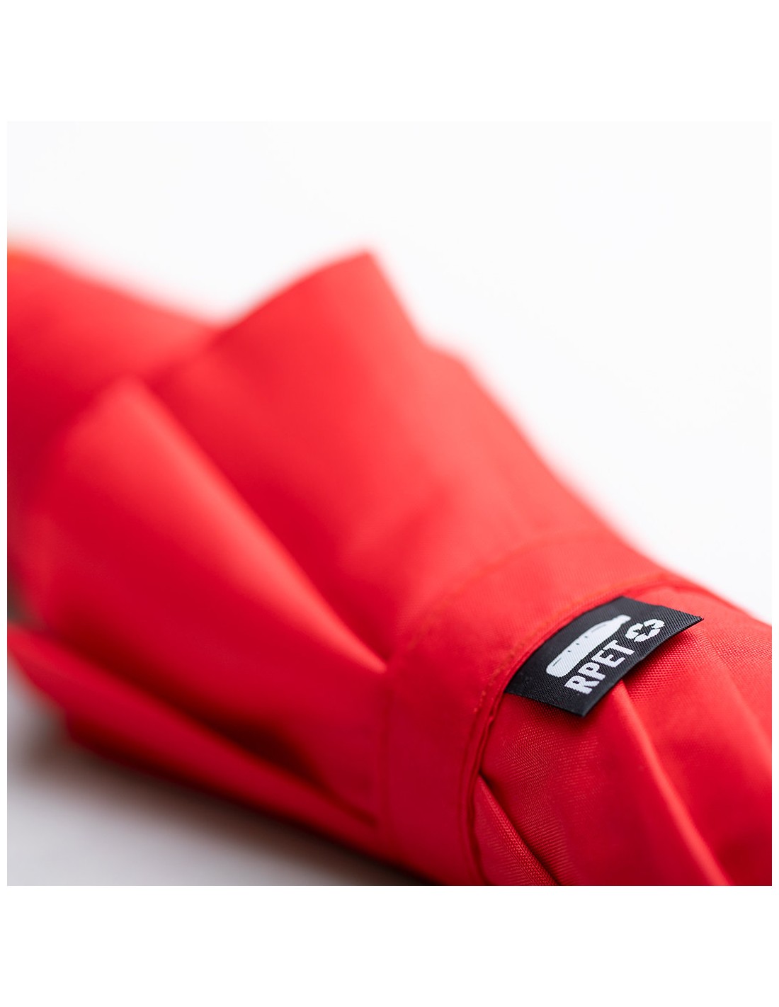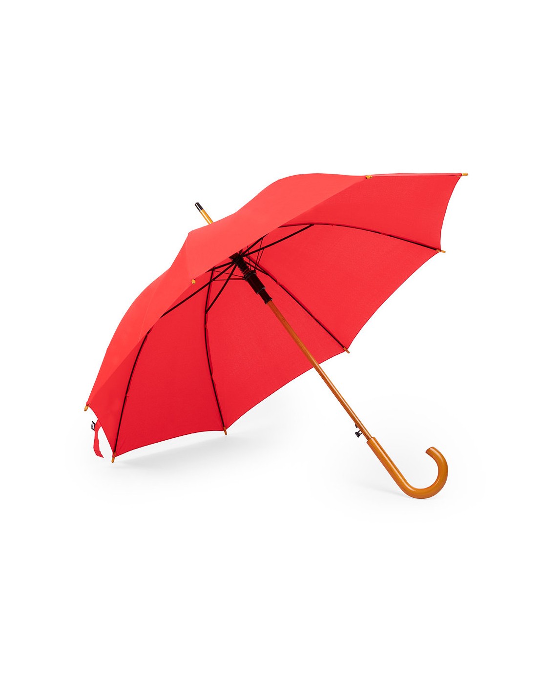 Paraguas de línea nature de 105cm de diámetro. En material pongee 190T RPET, elaborado a partir de plástico reciclado, para así fomentar la reutilización de residuos plásticos y ayudar a la sostenibilidad del planeta. De apertura automática y varillas metálicas. Mango y caña de madera, con etiqueta distintiva RPET