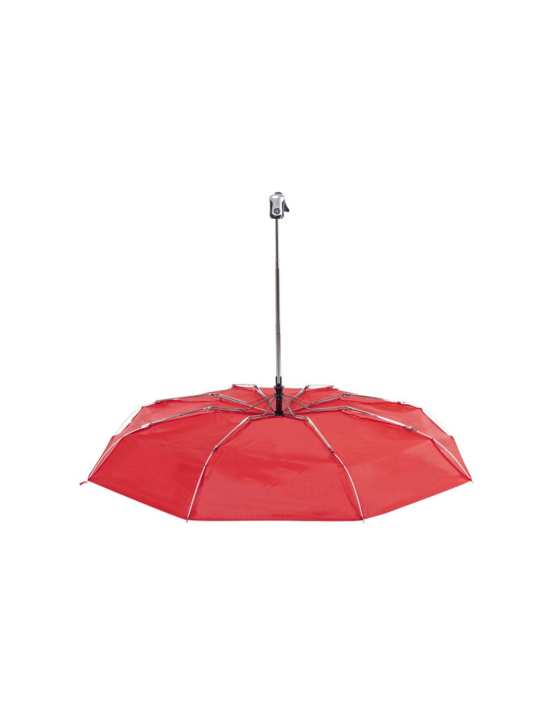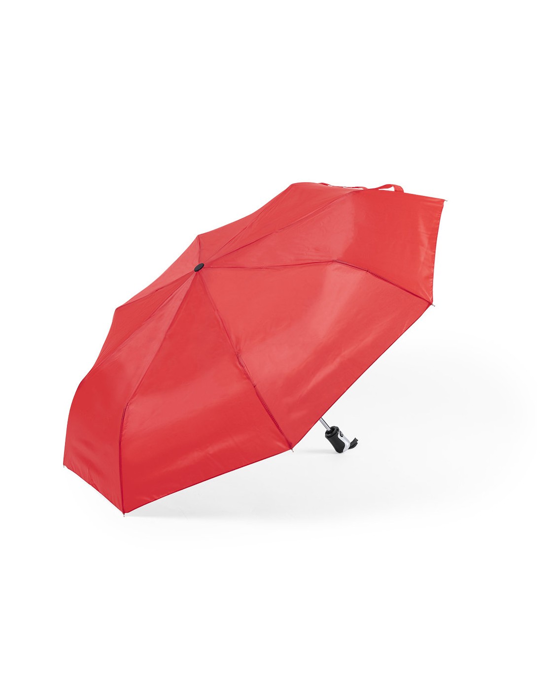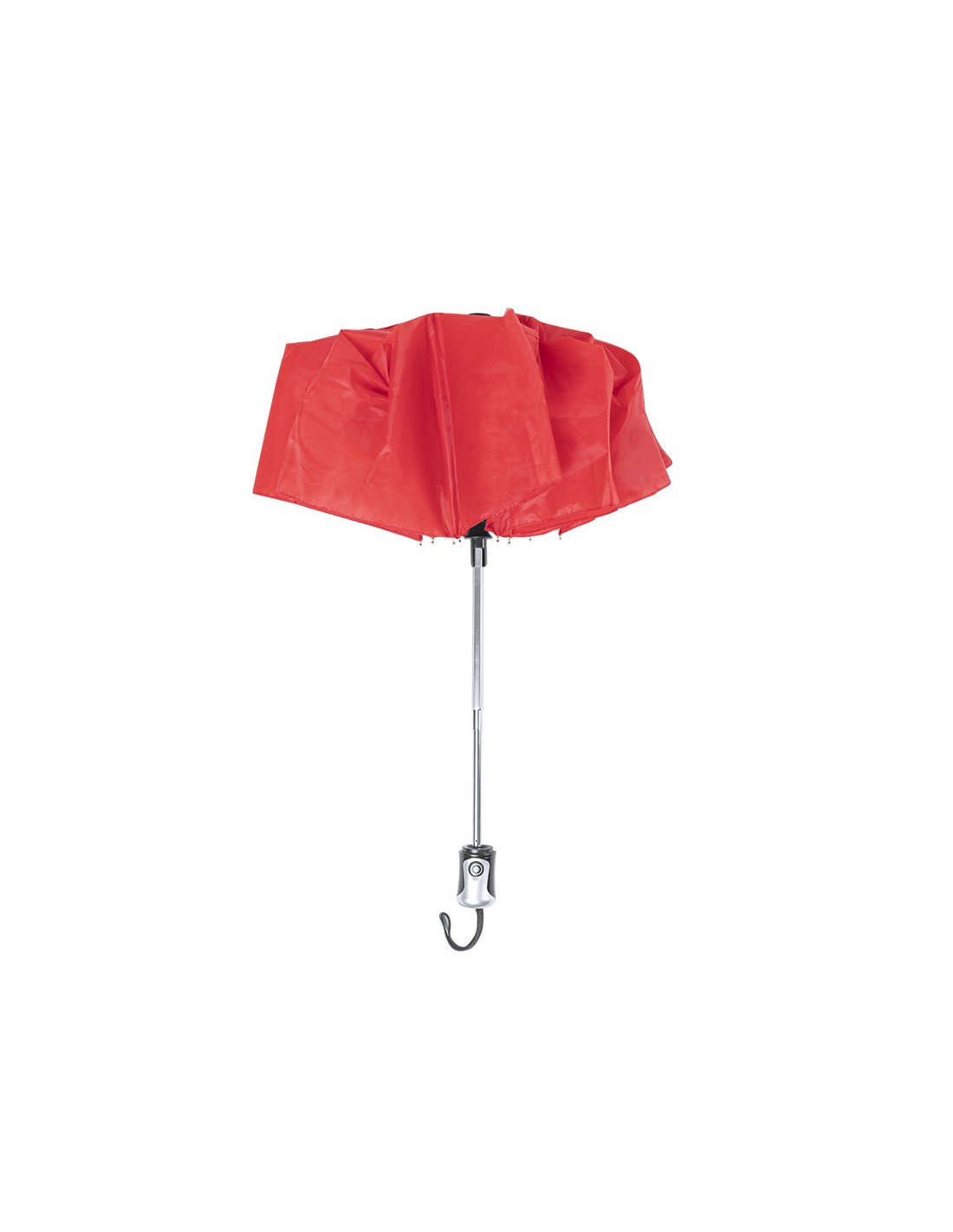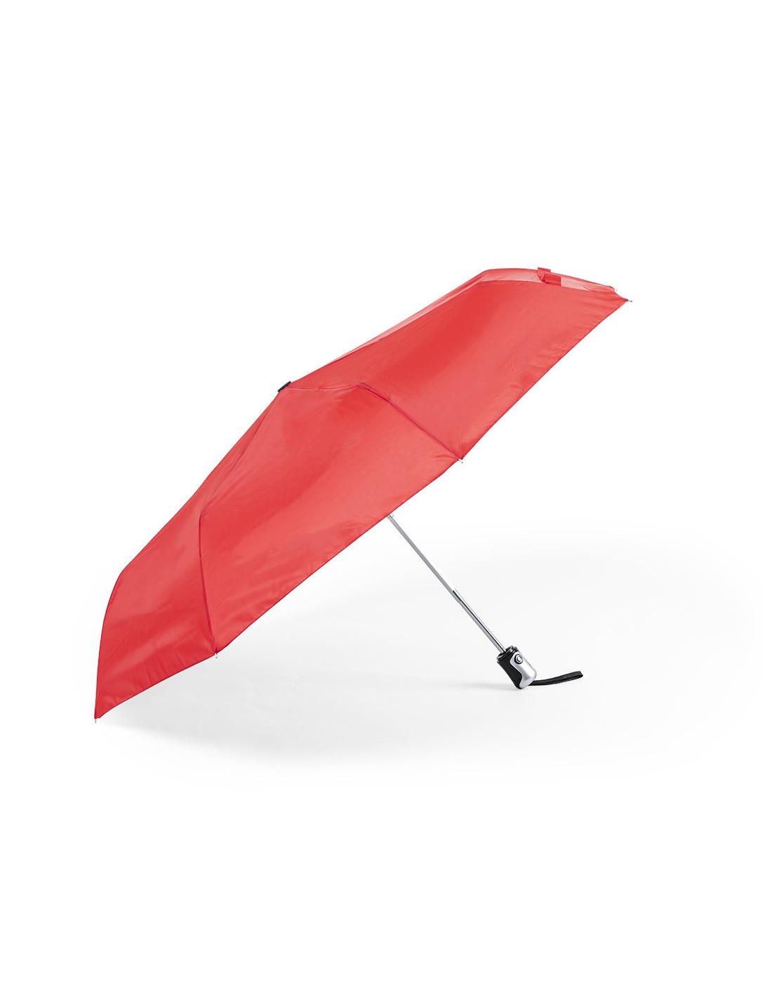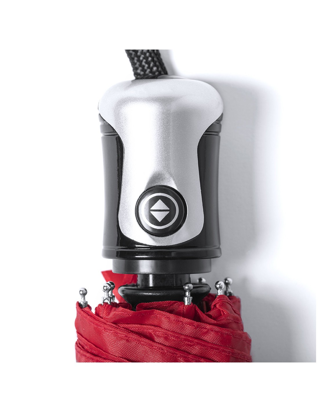 Paraguas plegable de 8 paneles y 98cm de diámetro. Tela en resistente poliéster 190T, con mecanismo automático de apertura/cierre y sistema antiviento. Varillas metálicas en color plata y fibra de vidrio. Cierre de velcro y mango ergonómico con cinta de transporte. Incluye funda a juego.