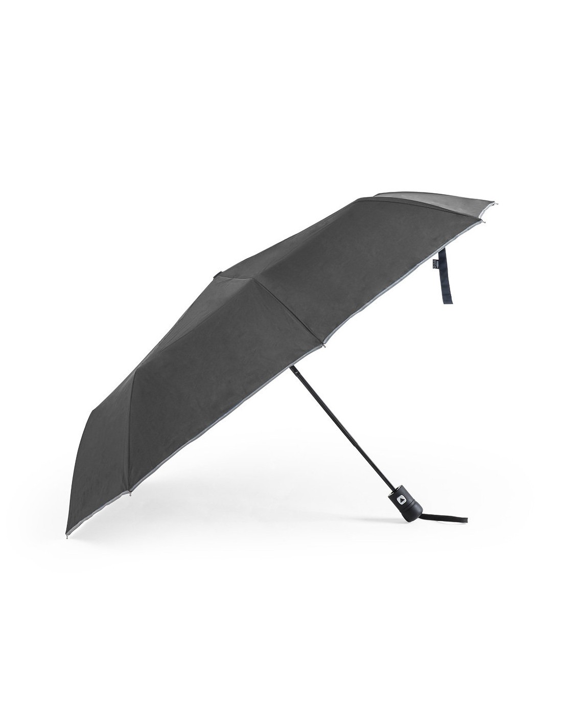 Paraguas plegable de línea nature de 100cm de diámetro. En material pongee 190T RPET, elaborado a partir de plástico reciclado, para así fomentar la reutilización de residuos plásticos y ayudar a la sostenibilidad del planeta. Con banda reflectante en todo el contorno del paraguas. De apertura automática, con mecanismo anti viento y varillas de fibra de vidrio. Mango con botón y distintivo RPET en etiqueta. Con funda RPET a juego.