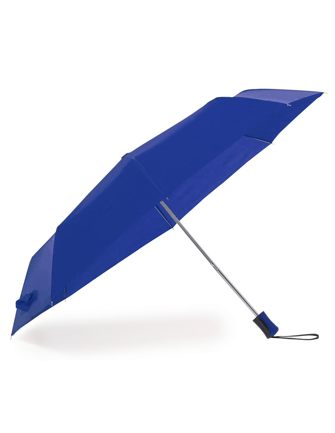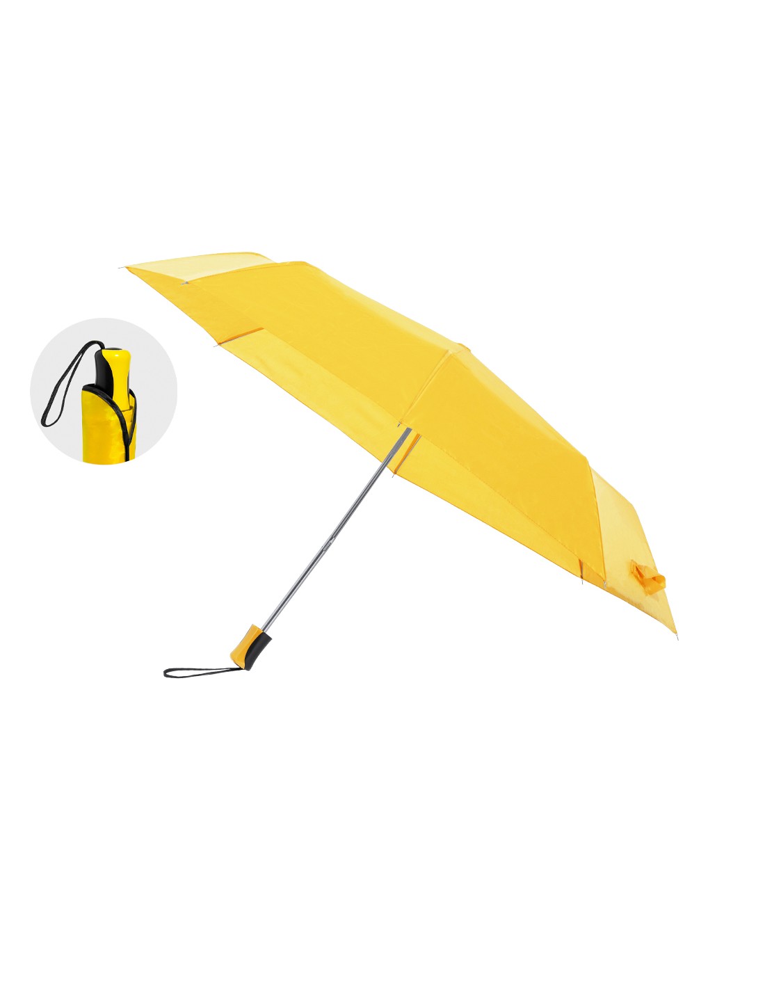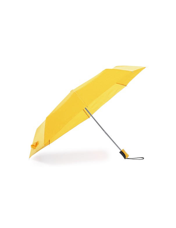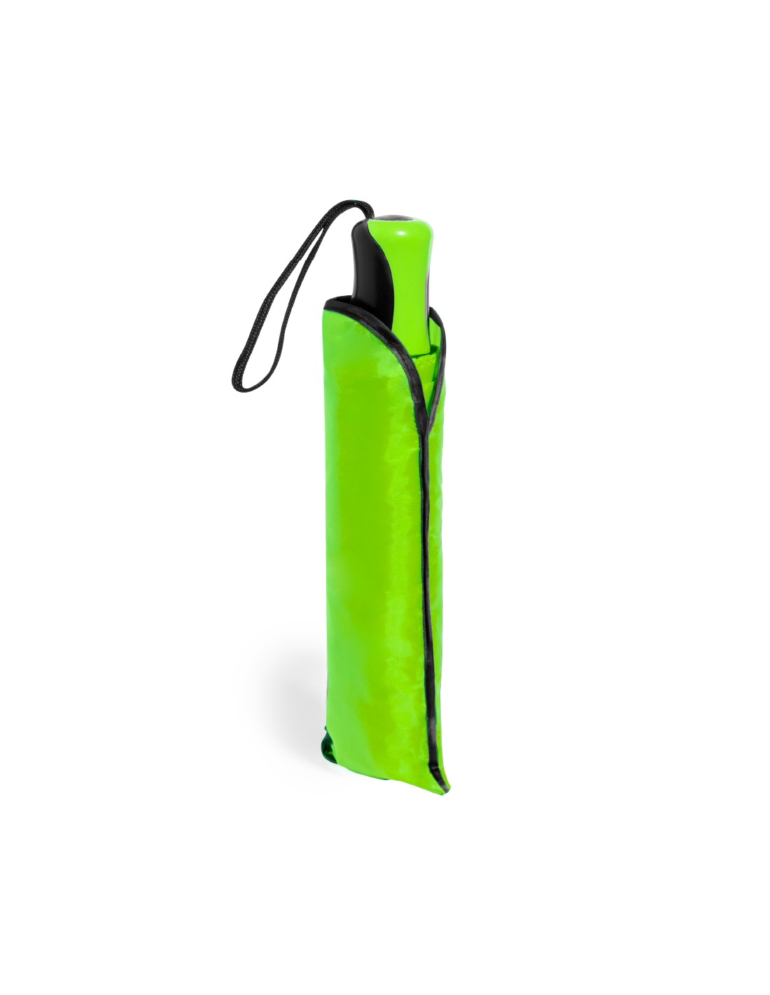 Paraguas plegable de 8 paneles de poliéster 190T. De apertura manual, con varillas metálicas en color plateado y cierre de velcro. Mango ergonómico con cinta de transporte y funda protectora a juego. Disponible en amplia gama de colores. Presentado en bolsa individual reciclada.
