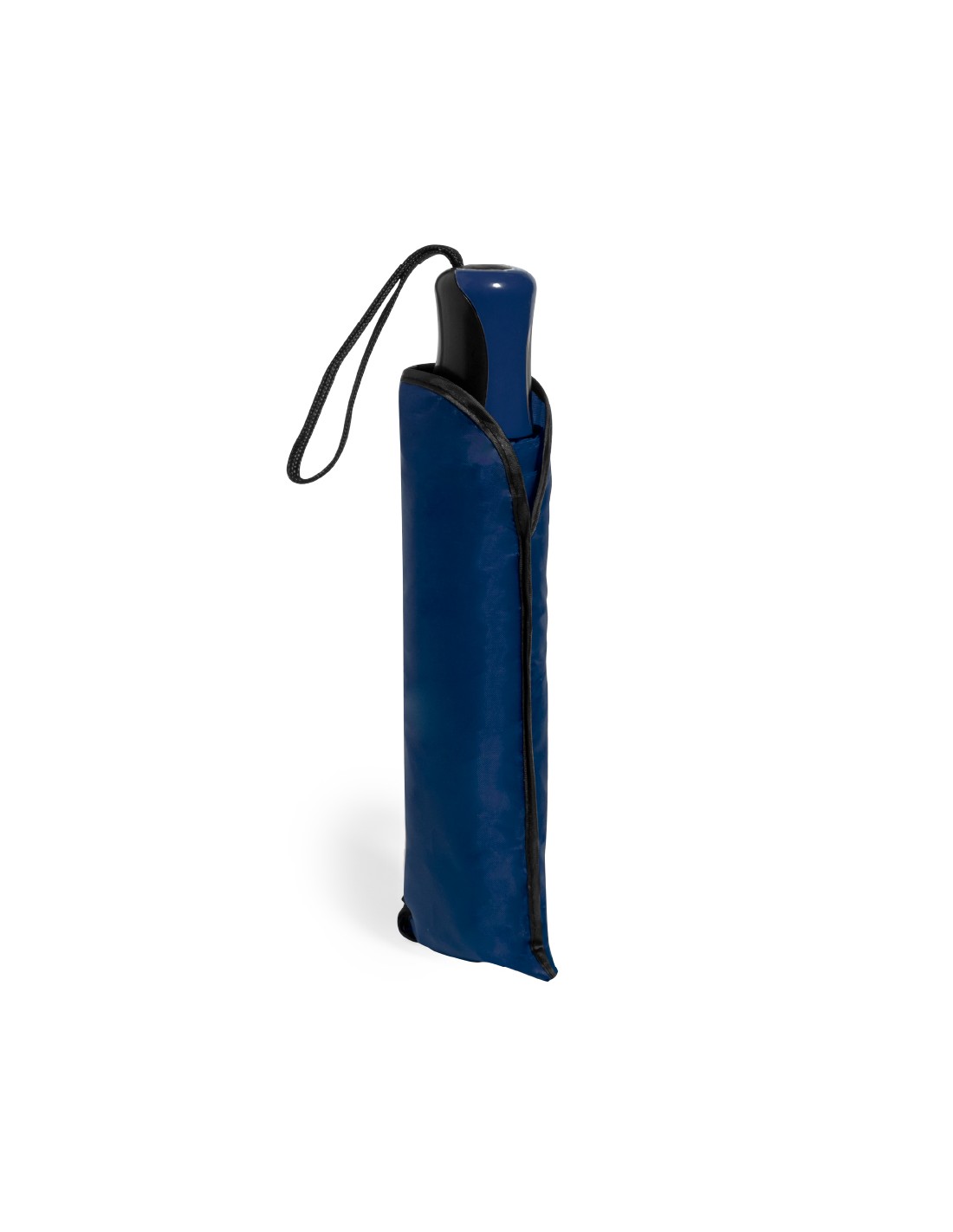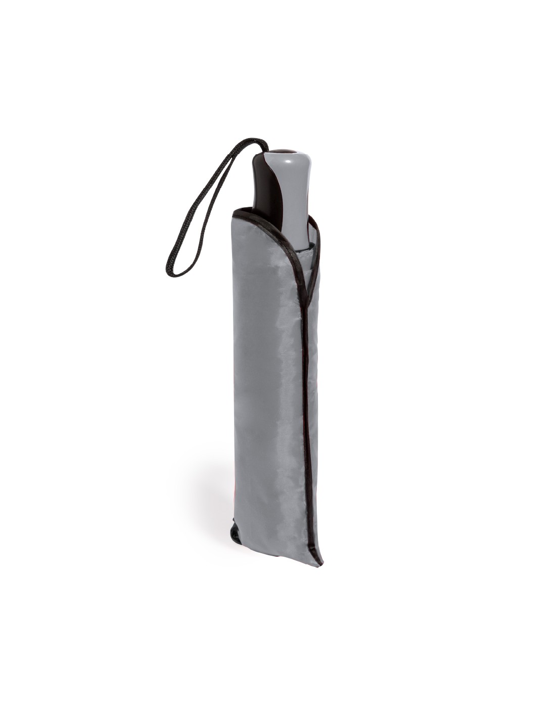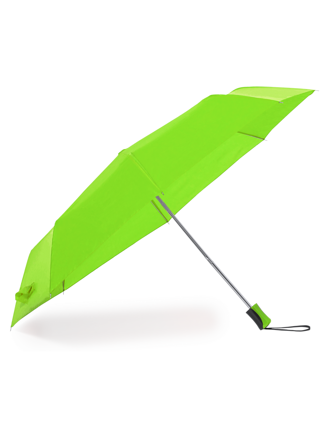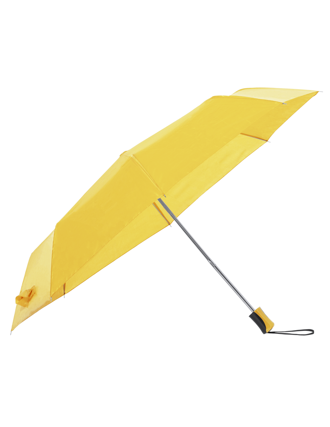 Paraguas plegable de 8 paneles de poliéster 190T. De apertura manual, con varillas metálicas en color plateado y cierre de velcro. Mango ergonómico con cinta de transporte y funda protectora a juego. Disponible en amplia gama de colores. Presentado en bolsa individual reciclada.