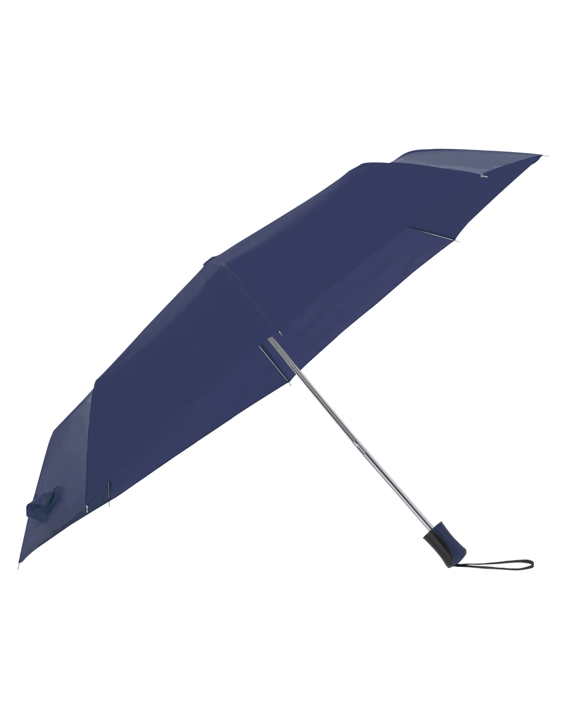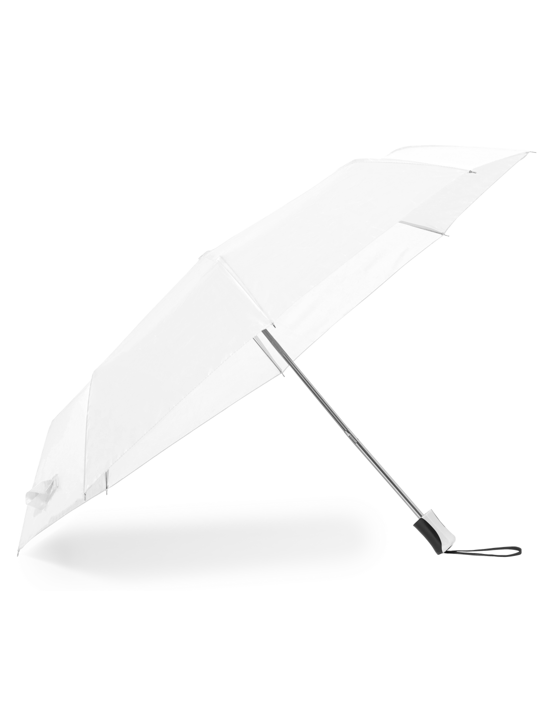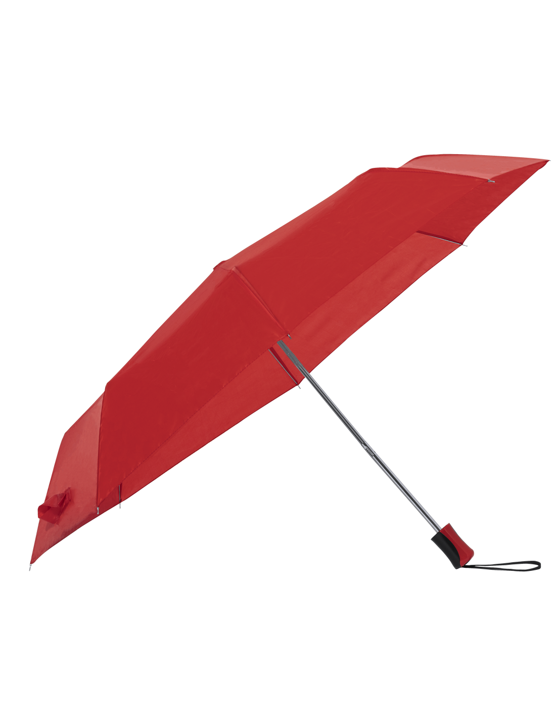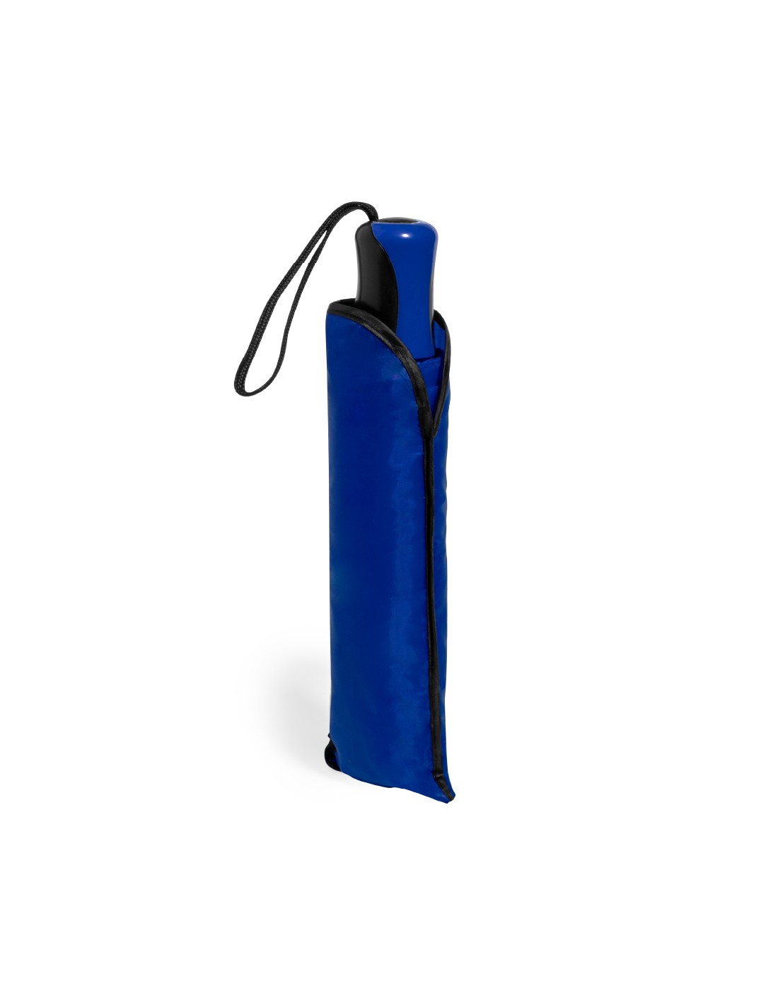 Paraguas plegable de 8 paneles de poliéster 190T. De apertura manual, con varillas metálicas en color plateado y cierre de velcro. Mango ergonómico con cinta de transporte y funda protectora a juego. Disponible en amplia gama de colores. Presentado en bolsa individual reciclada.