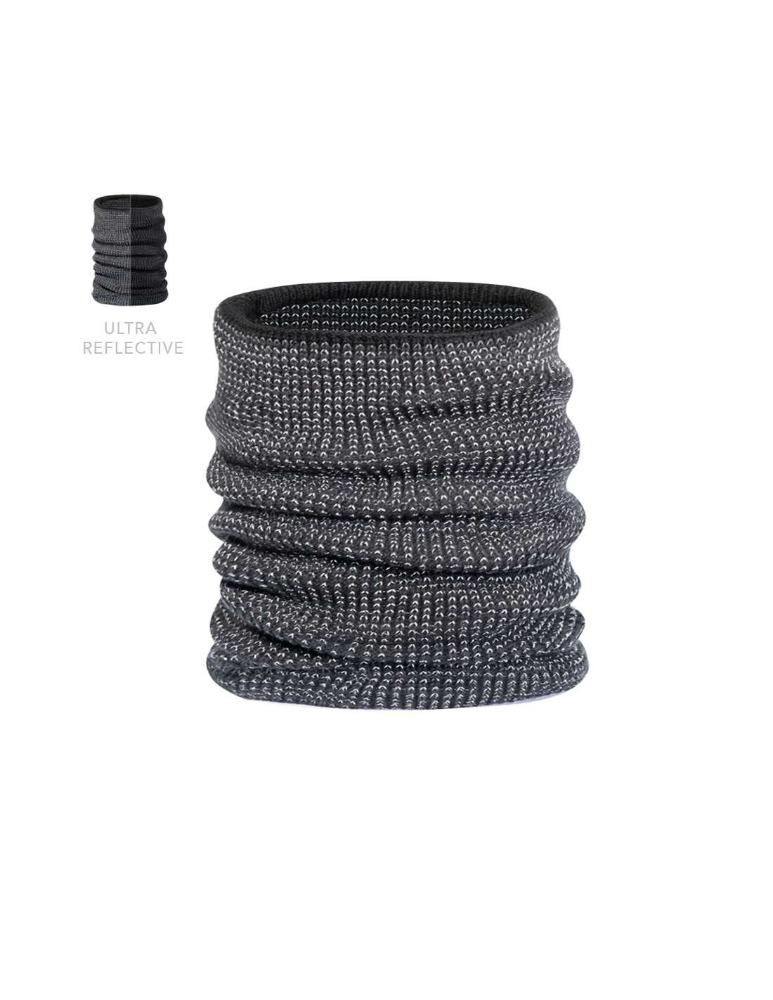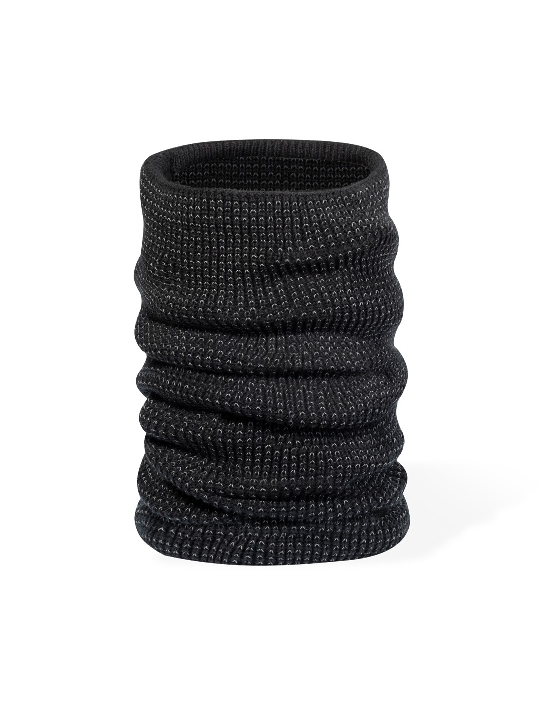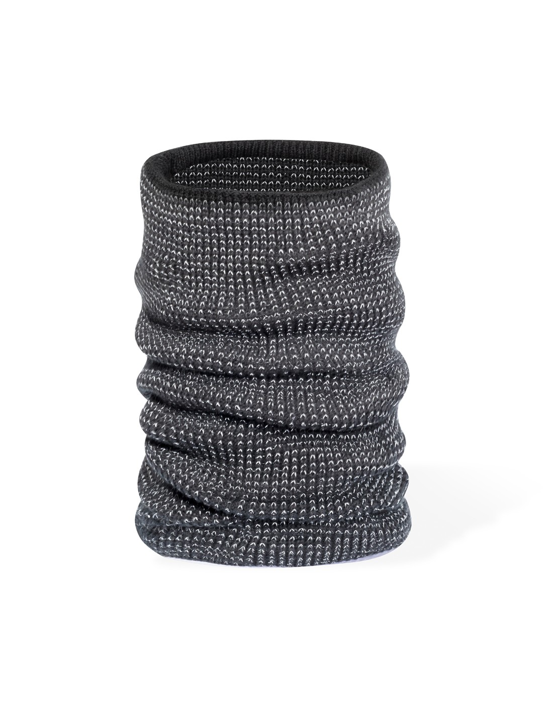 Cálida braga para cuello reflectante de punto de canalé, fabricado en material suave acrílico elástico en combinación con poliéster, e interior en suave polar fleece. Incluye un hilo reflectante entrelazado dentro del tejido para aumentar la visibilidad.