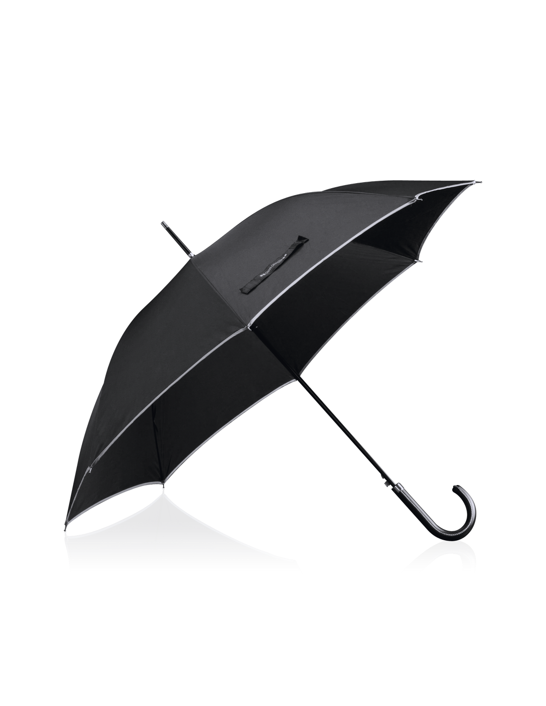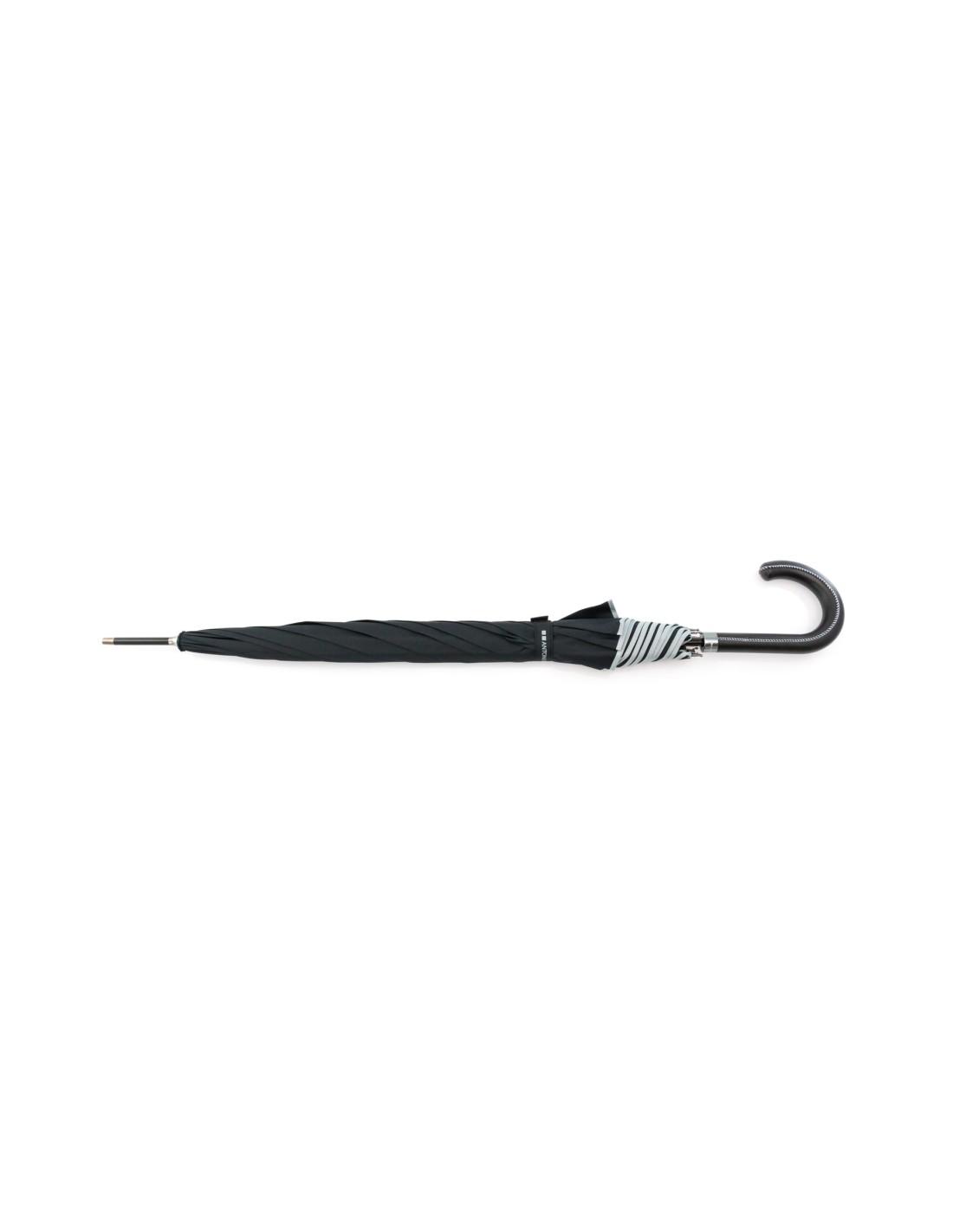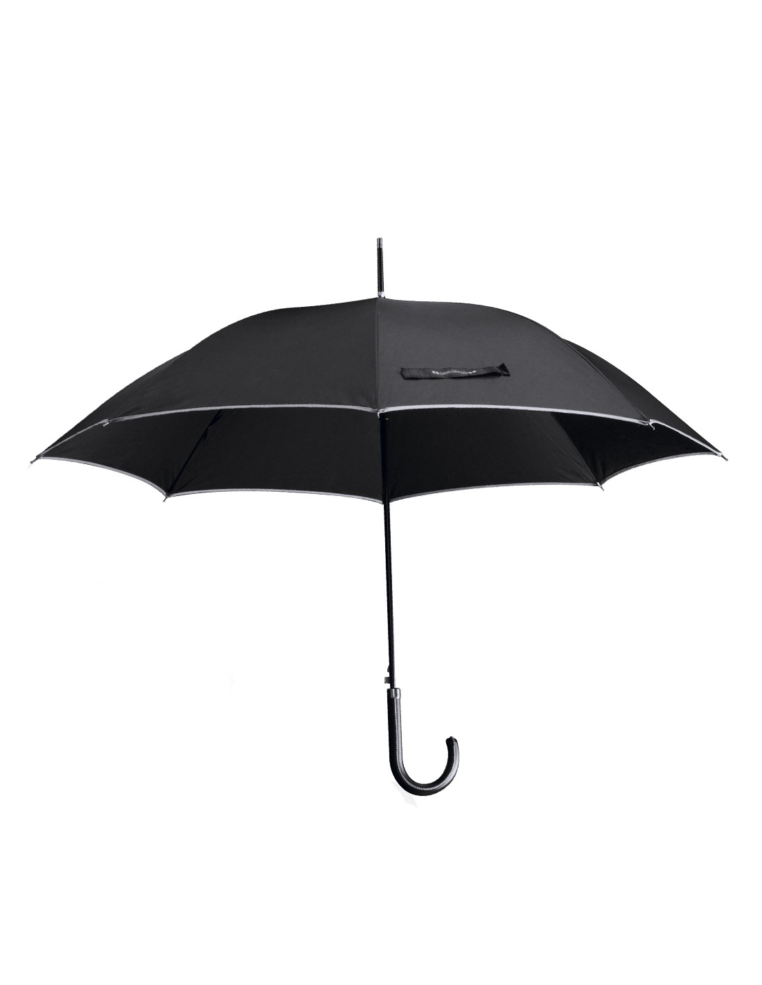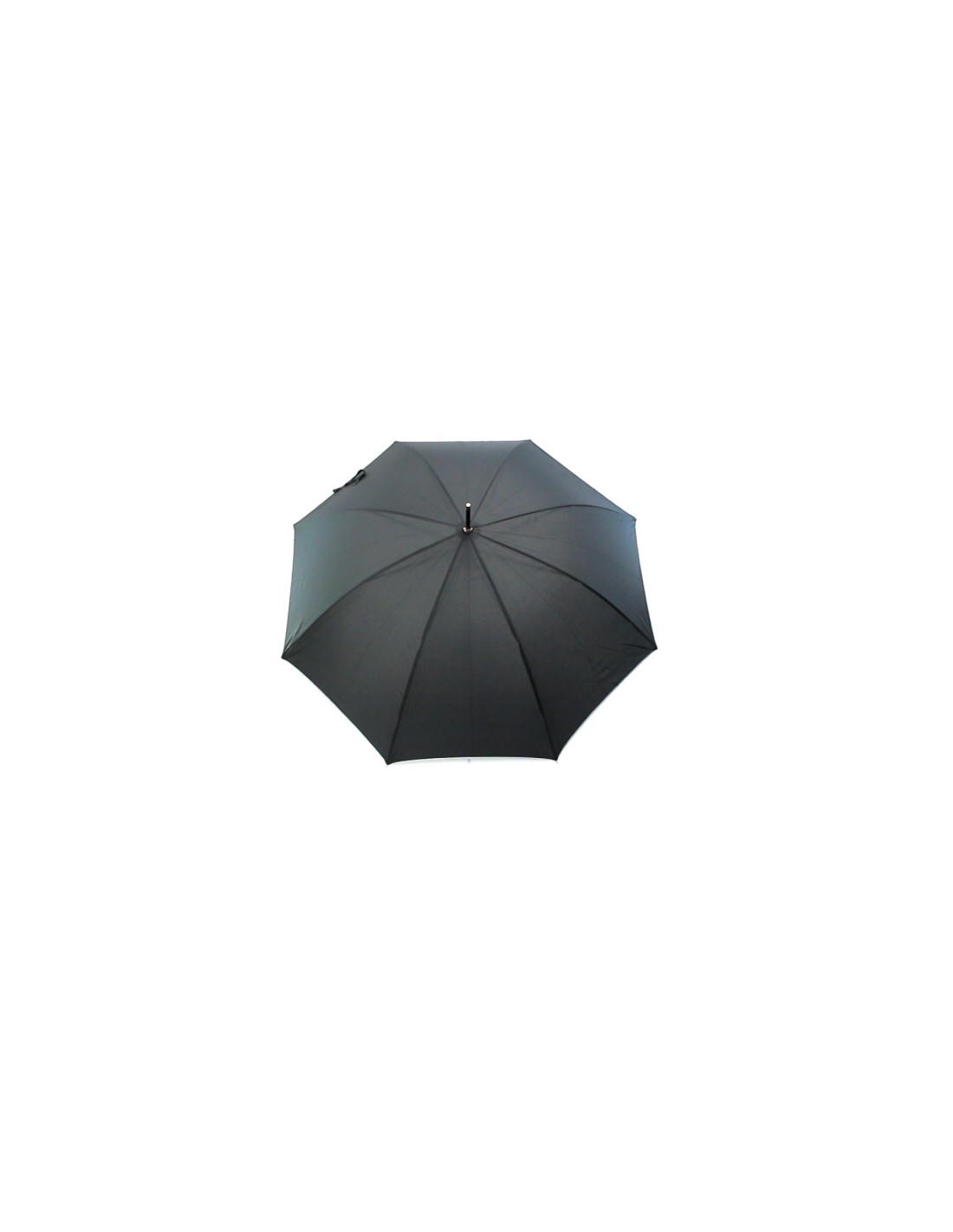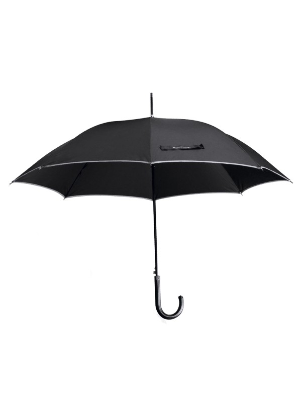 Paraguas de Antonio Miró de 8 paneles, con elegante diseño en color negro con ribetes en color blanco. De 100cm de diámetro, con apertura automática y en resistente material pongee. Con varillas metálicas en color negro, cierre de velcro y mango de suave tacto en polipiel. Presentado en funda con logotipo de la marca y cinta con accesorio de ajuste.