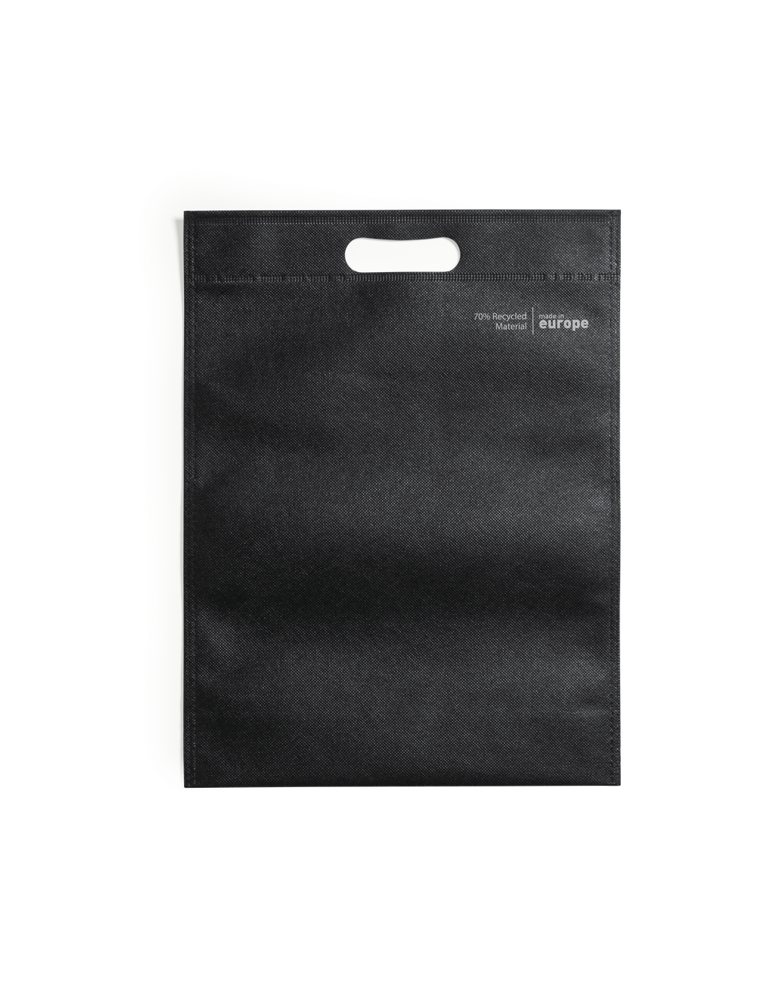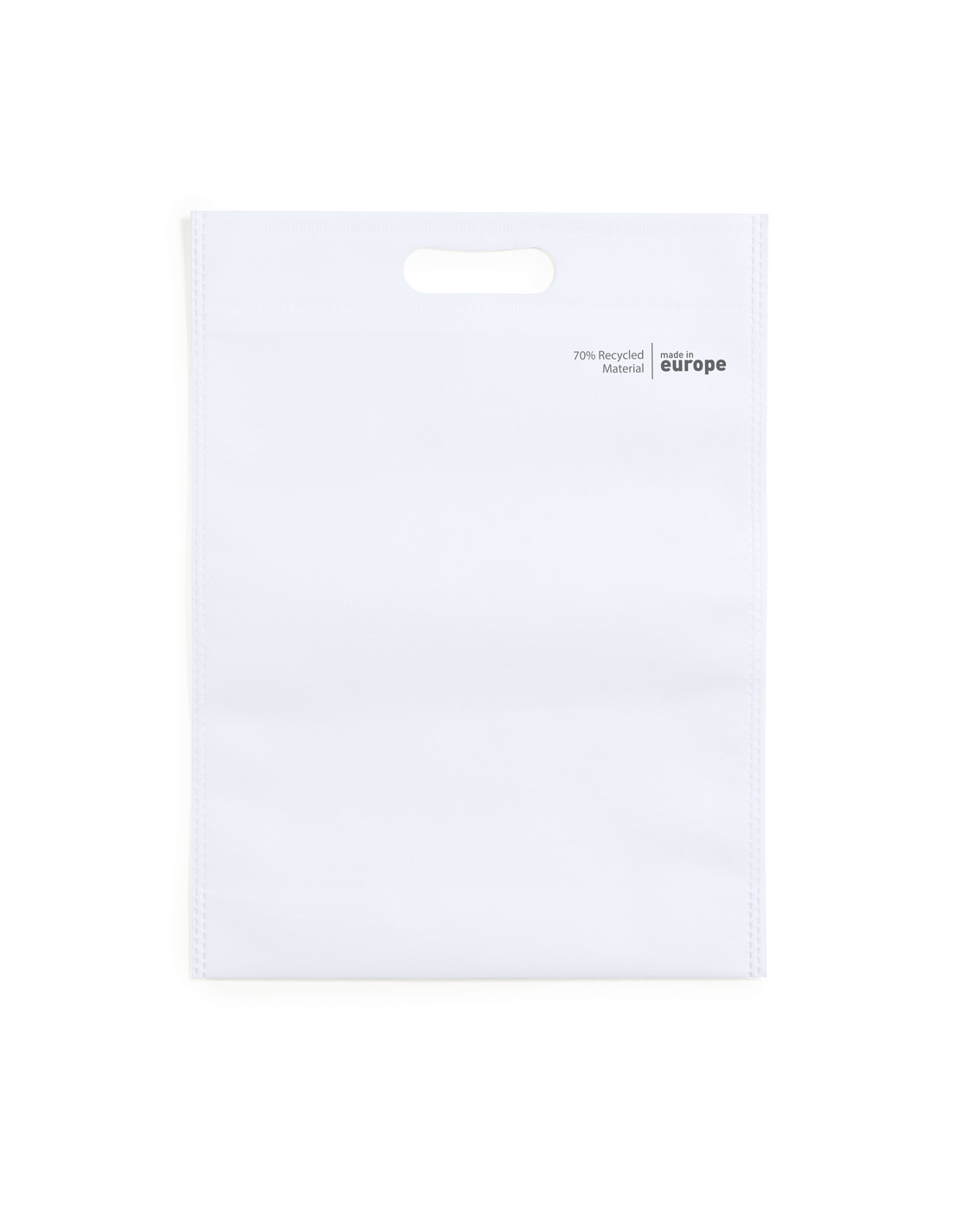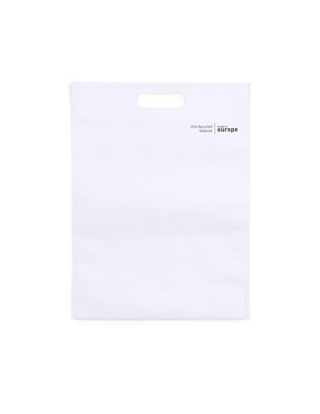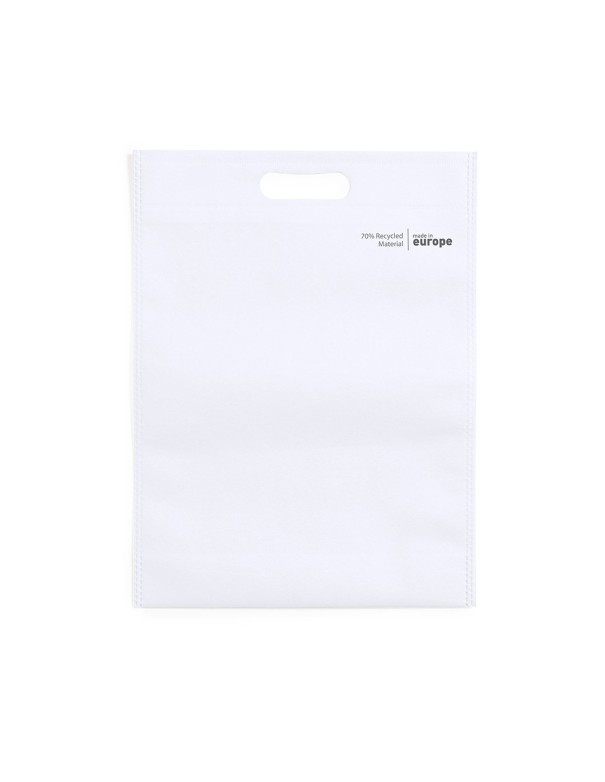 Bolsa de línea nature, fabricada en non-woven reciclado de 70g/m2. De fabricación europea, con acabado termosellado, fuelle en la base, asa reforzada troquelada y distintivo eco/made in sobre la bolsa.