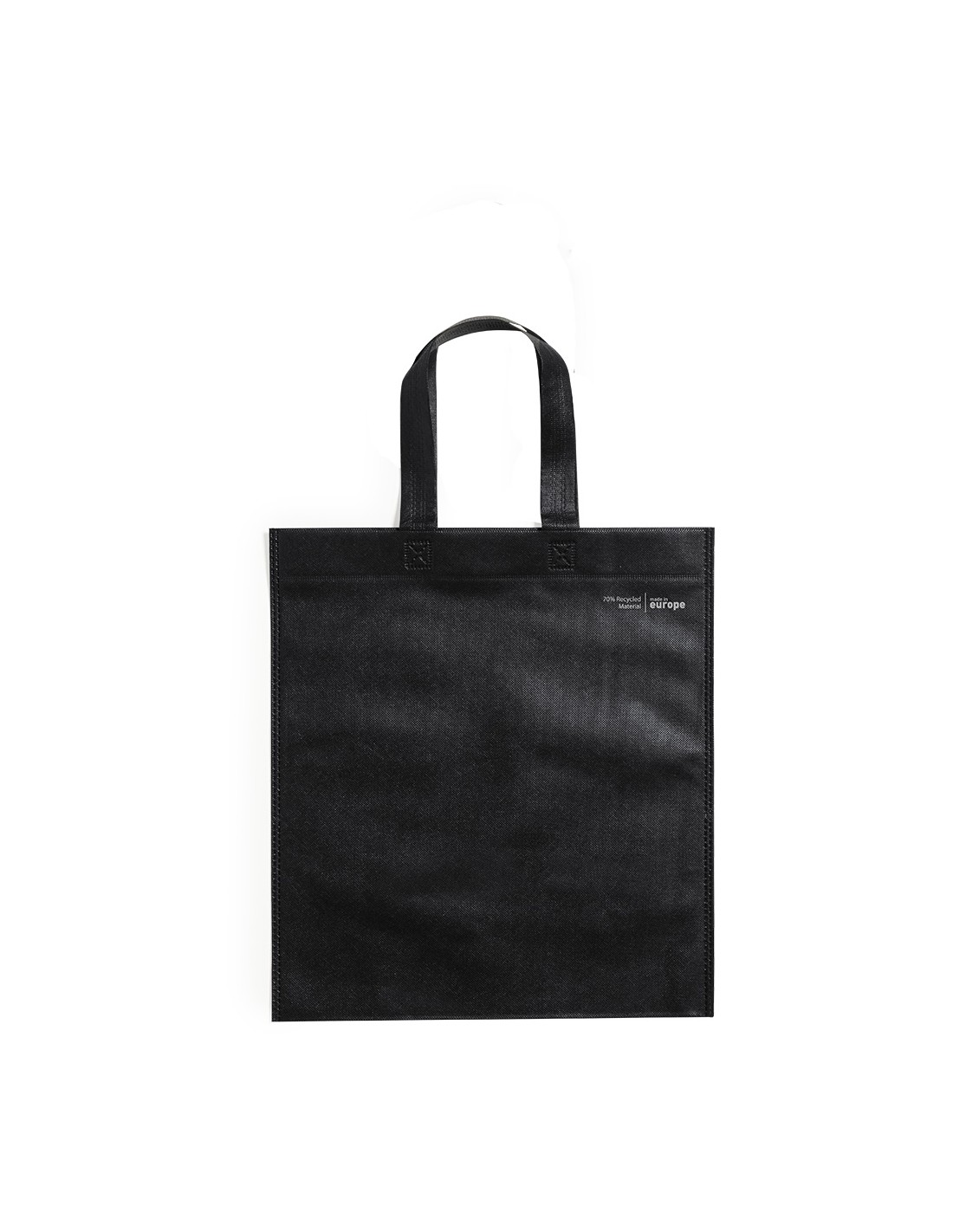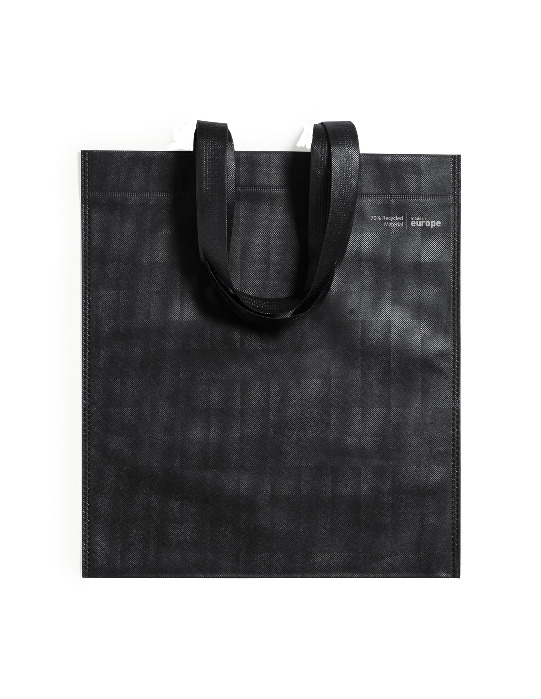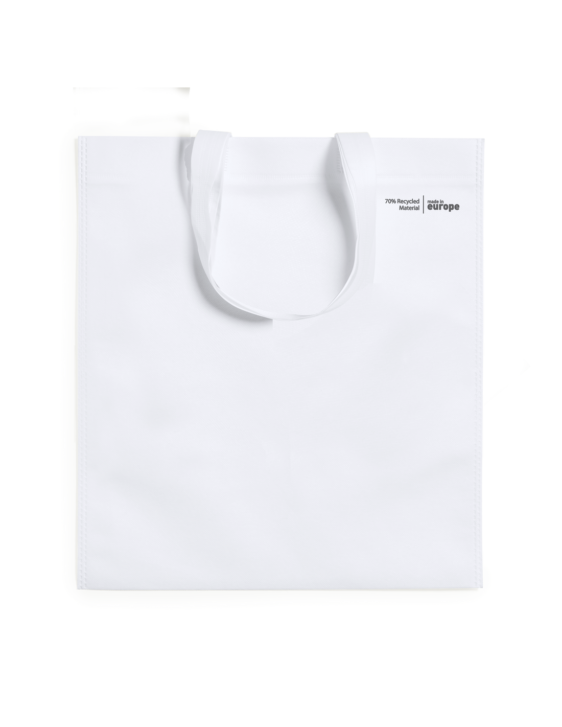 Bolsa de línea nature en non-woven reciclado de 70g/m2. De fabricación europea, con acabado termosellado, asas cortas y distintivo eco/made in sobre la bolsa.