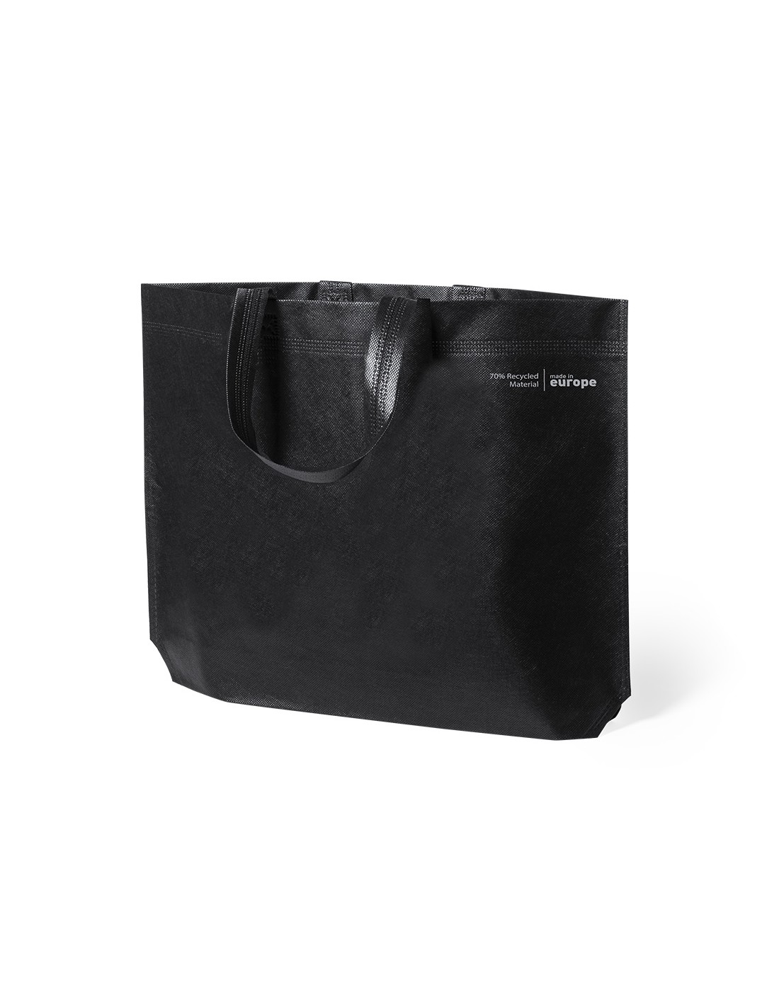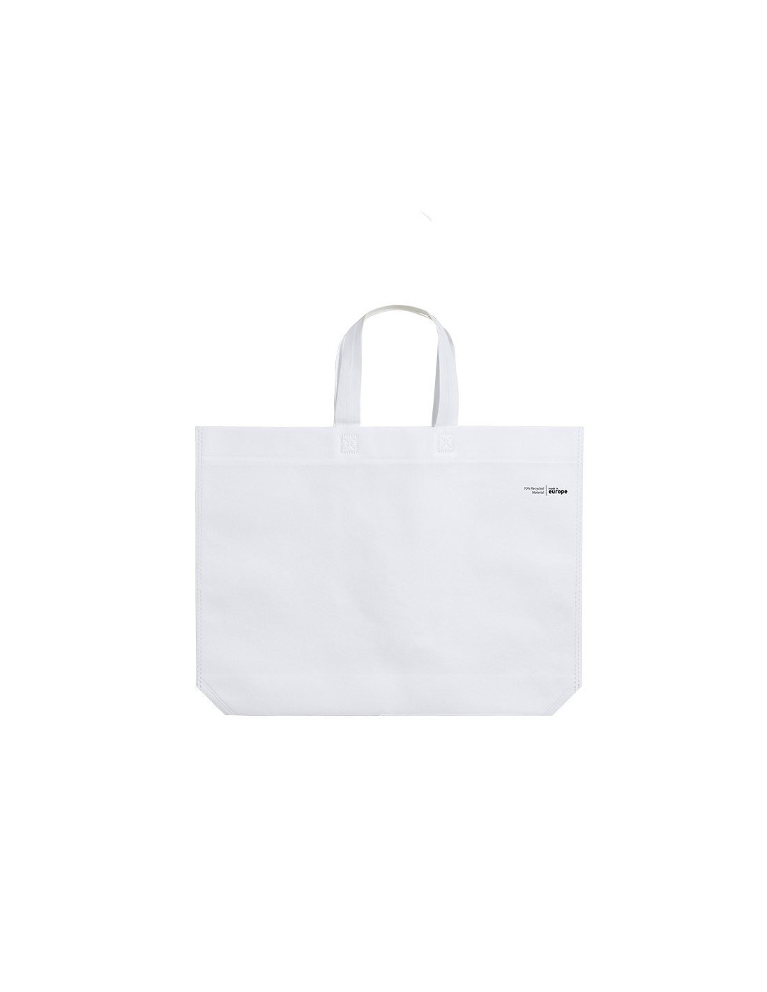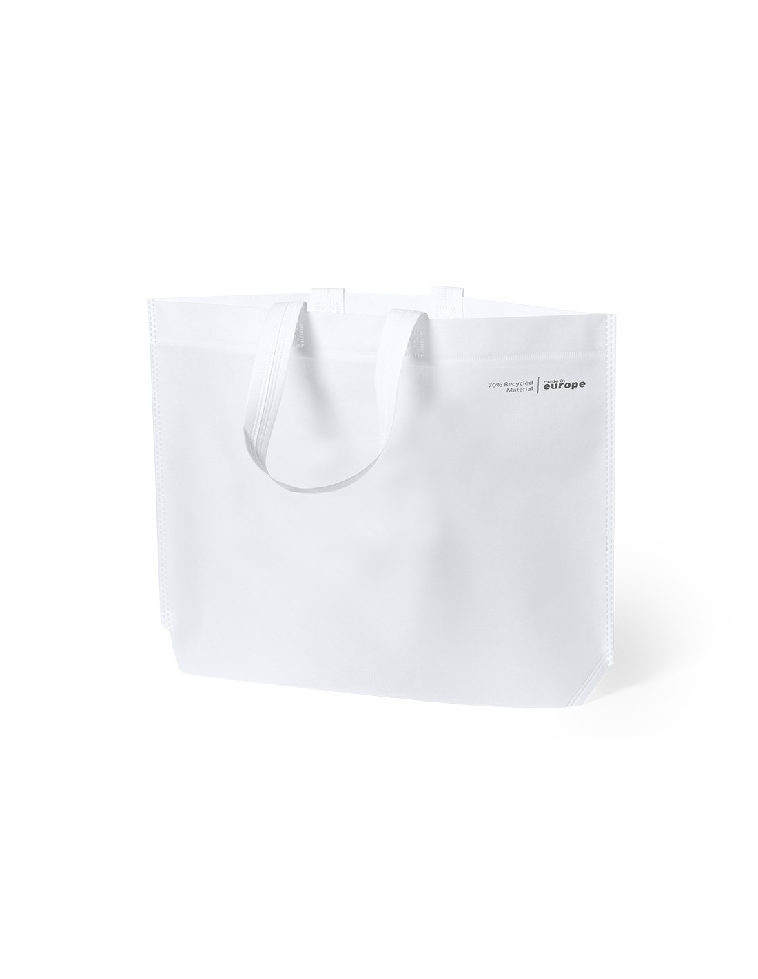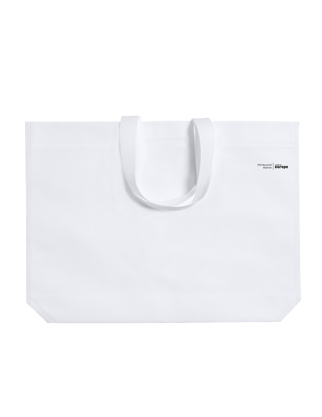 Bolsa de línea nature, fabricada en non-woven reciclado de 70g/m2. De fabricación europea, con acabado termosellado, con fuelle, asas largas y distintivo eco/made in sobre la bolsa.