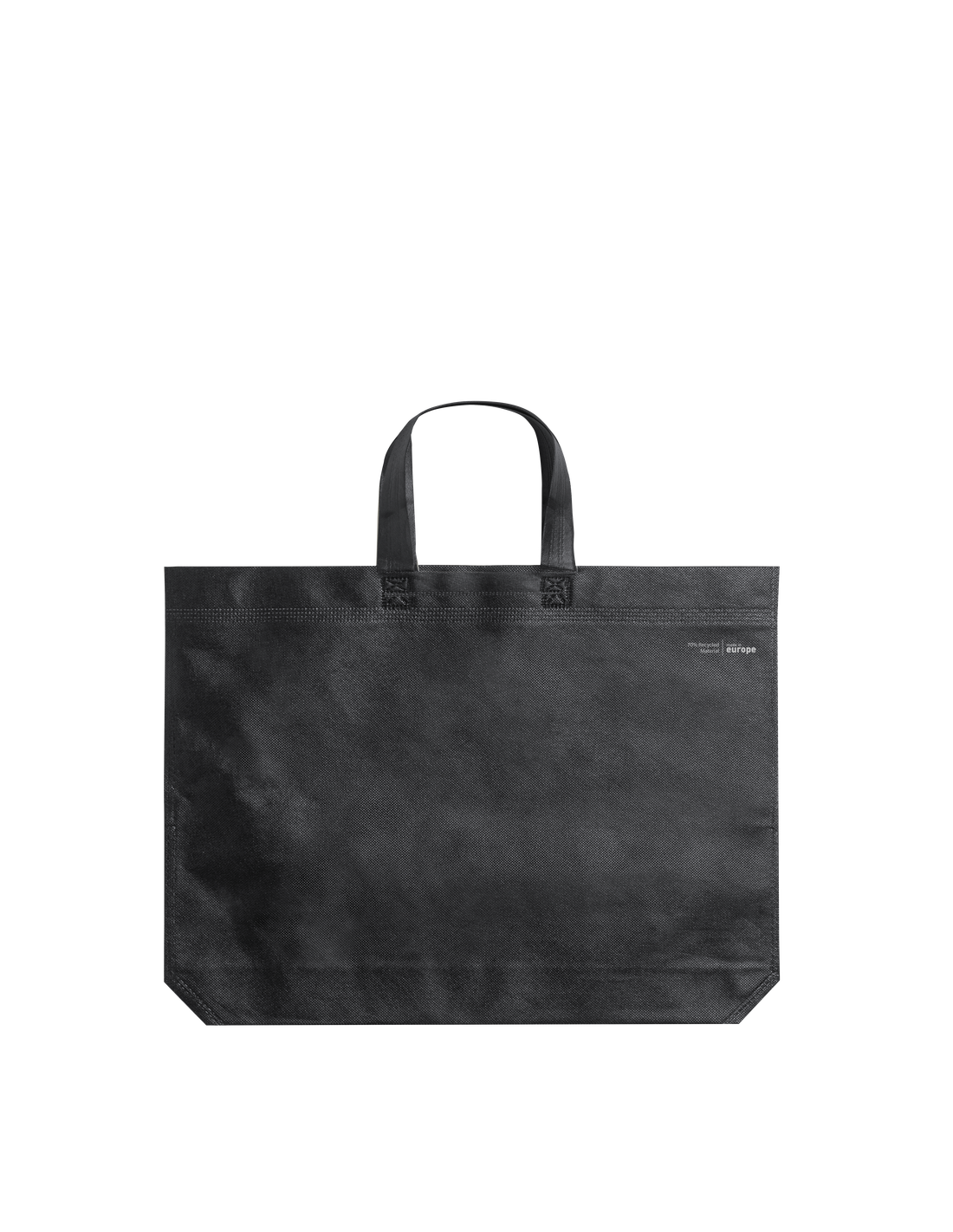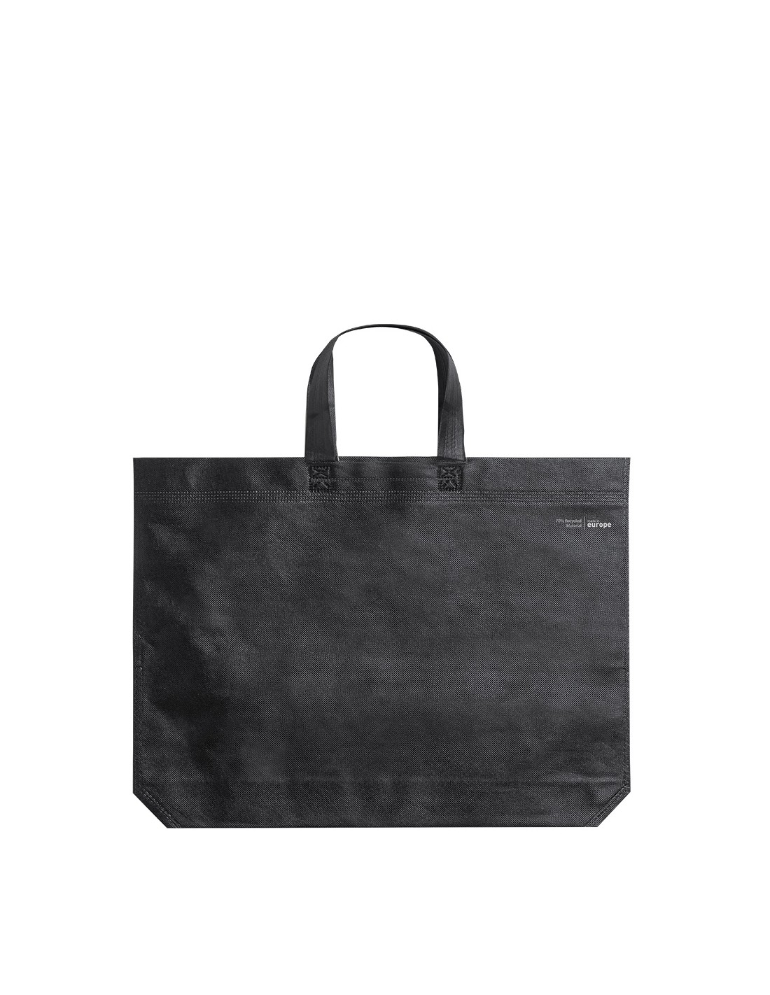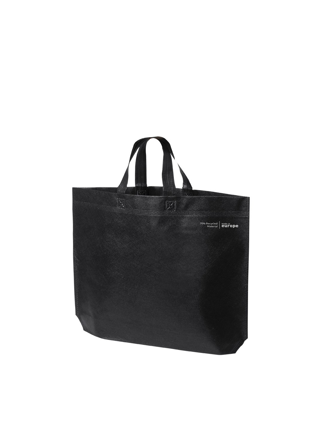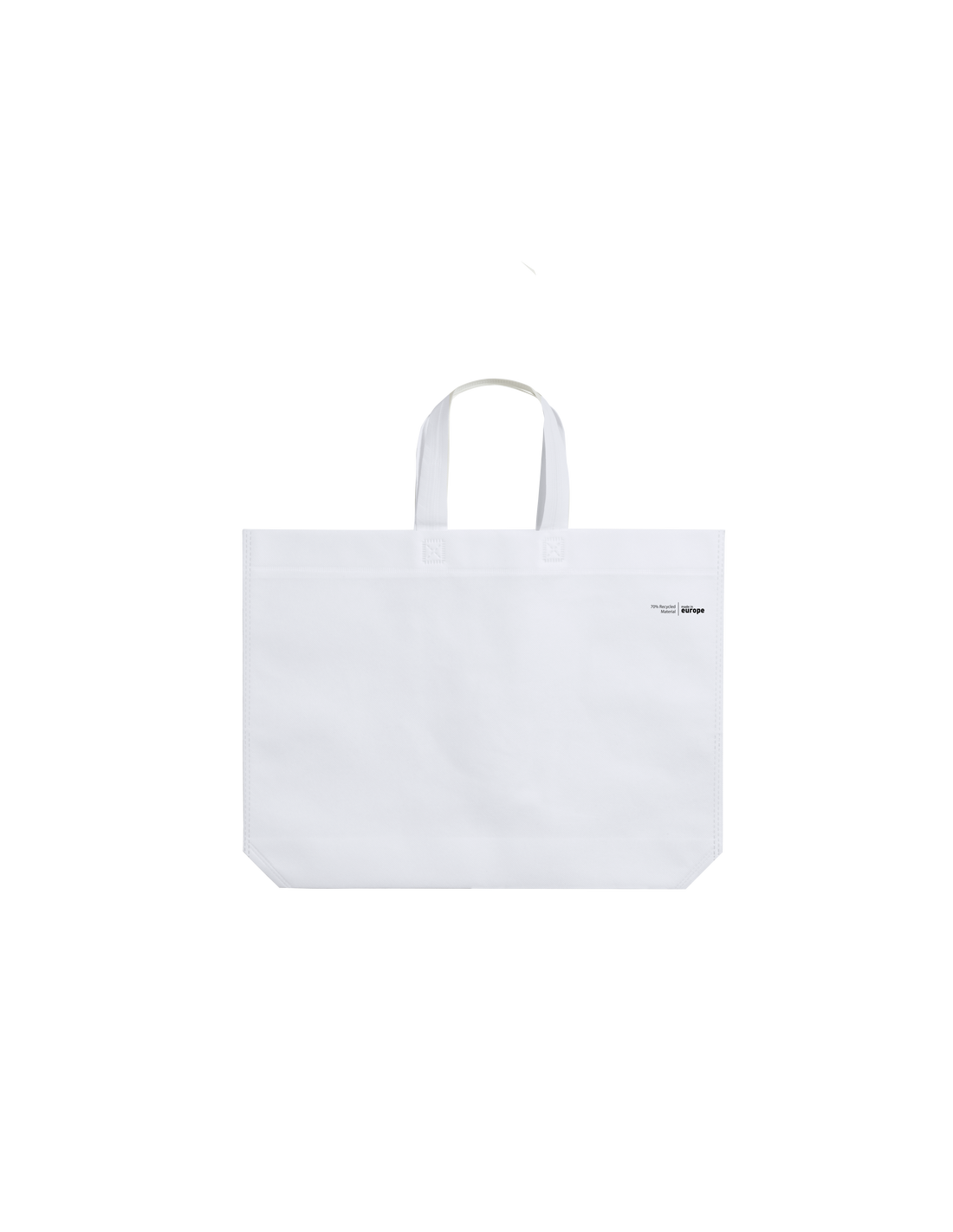 Bolsa de línea nature, fabricada en non-woven reciclado de 70g/m2. De fabricación europea, con acabado termosellado, con fuelle, asas largas y distintivo eco/made in sobre la bolsa.
