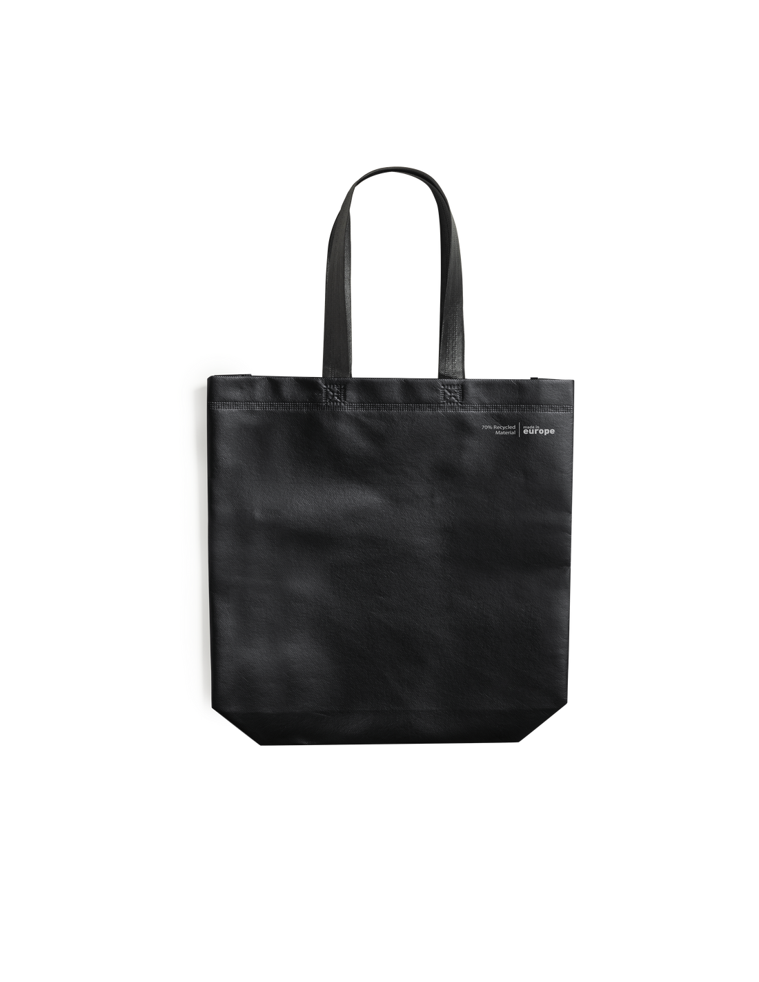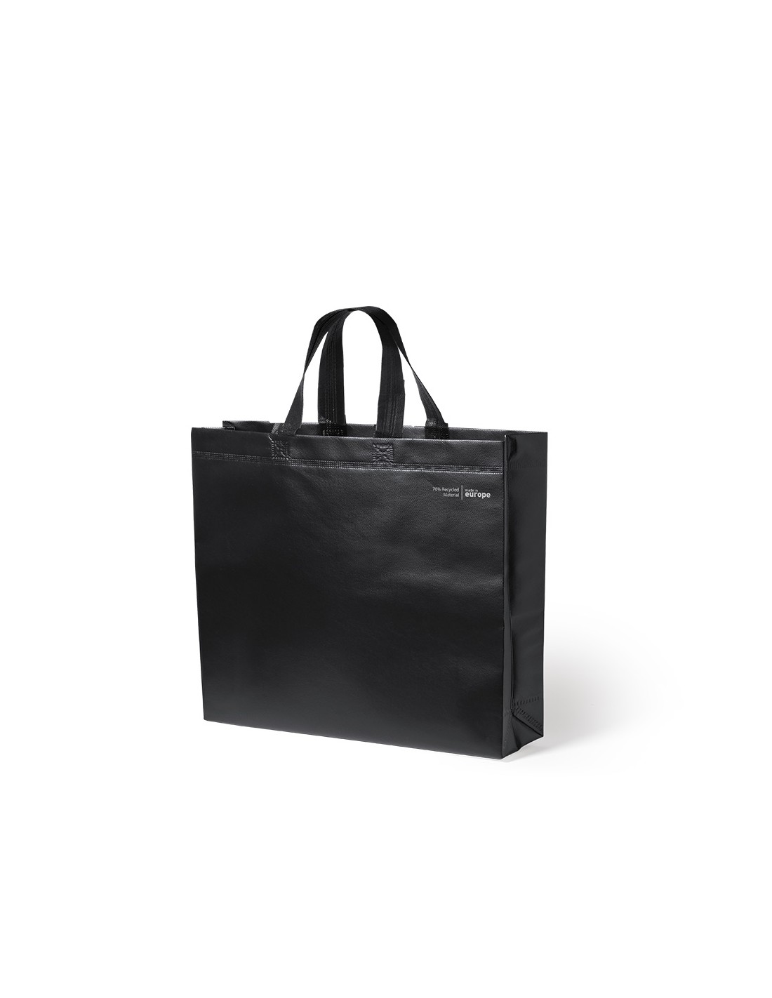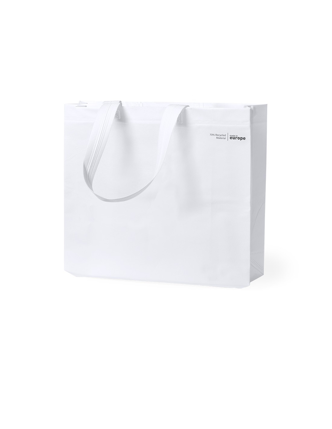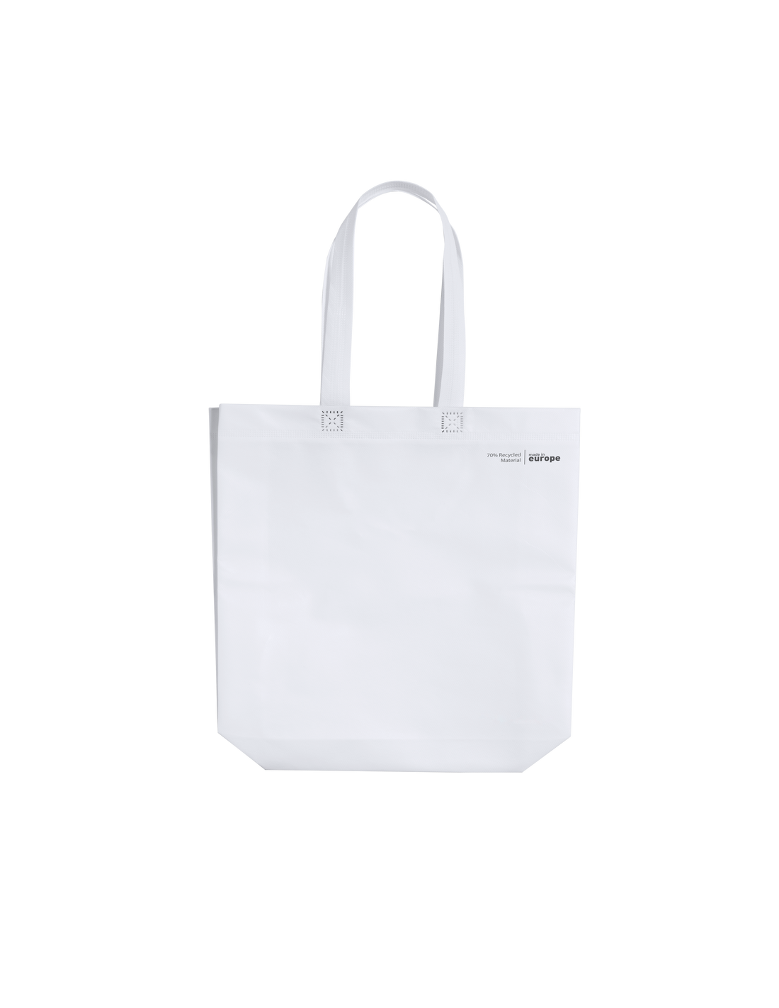 Bolsa de línea nature, fabricada en non-woven laminado reciclado de 120g/m2. De fabricación europea, con acabado termosellado, con fuelle, asas largas y distintivo eco/made in sobre la bolsa.