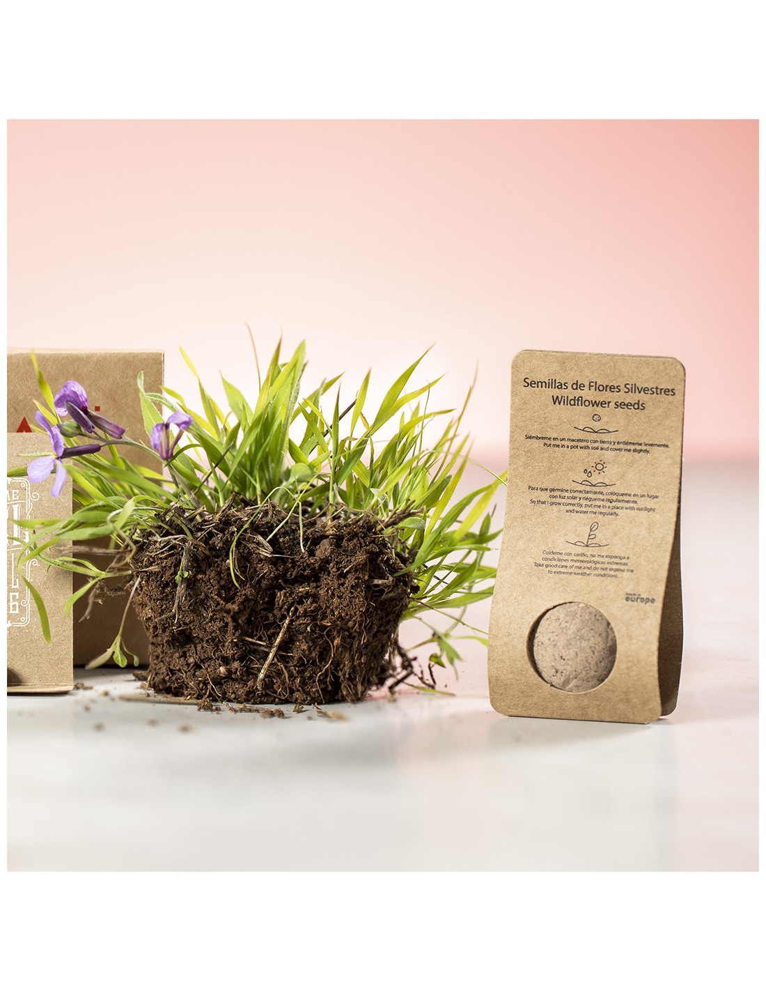 Bombón de semillas, presentado en estuche de cartón reciclado con instrucciones de plantado y distintivo Made in Europe. Flores silvestres en colores surtidos.