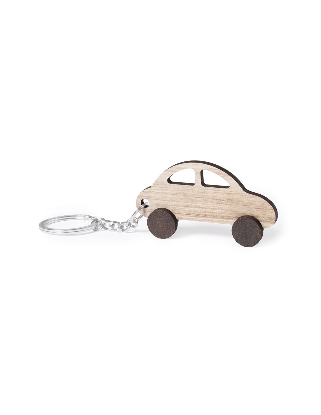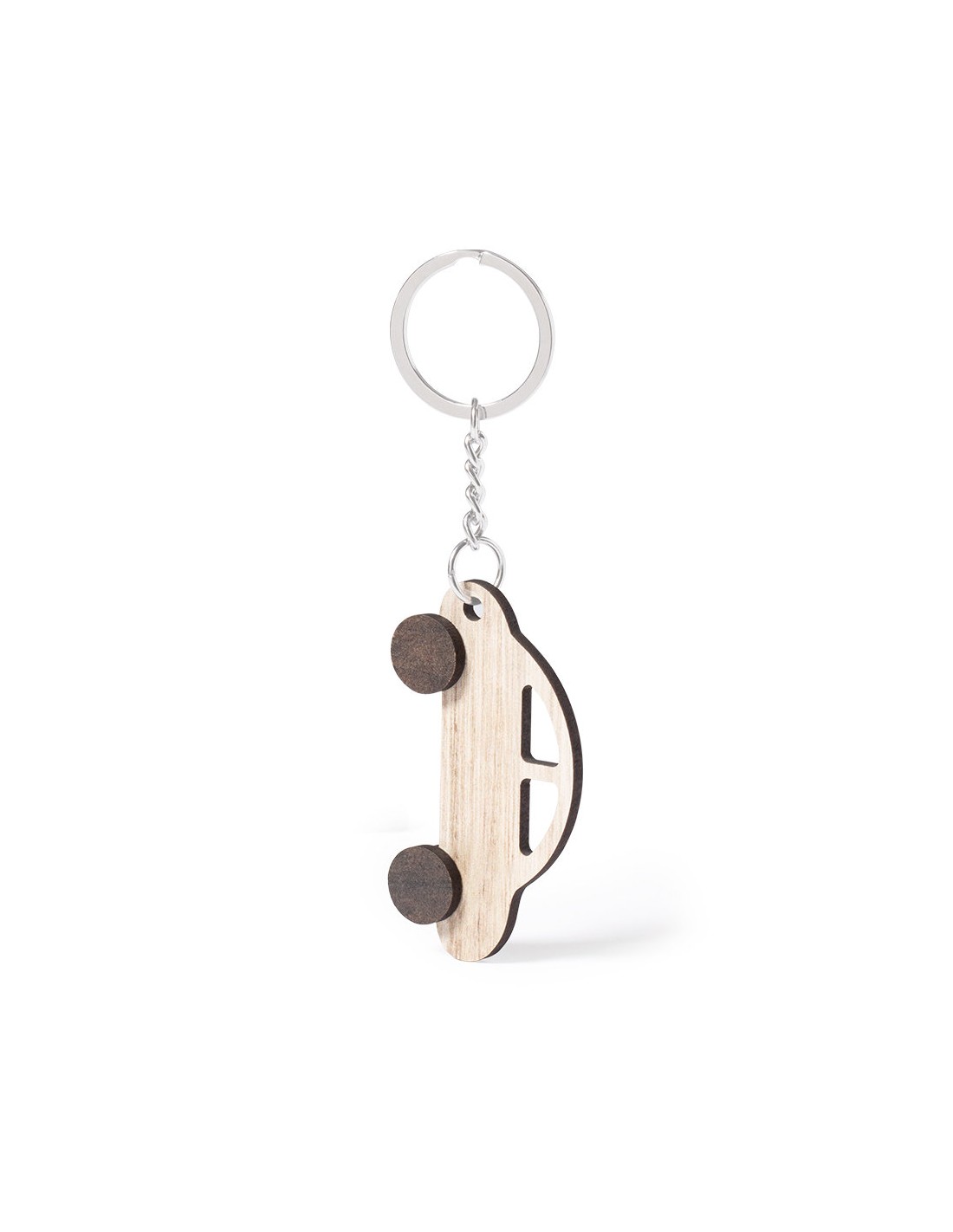 Llavero con diseño coche, fabricado en madera natural y de original acabado bicolor. Amplia superficie de marcaje, con anilla y cadena metálicas y distintivo Made In Europe.