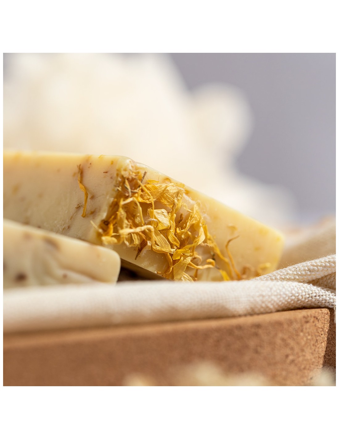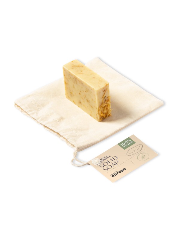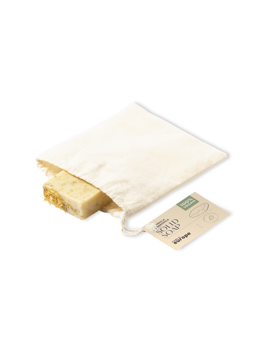 Pastilla de jabón vegano de 100 gr. Aroma de caléndula y manzanilla con propiedades calmantes, hidratantes y reparadoras. Dermatológicamente testado y de fabricación europea. Presentación en bolsa individual de algodón, con cierre de cordón y etiqueta distintiva. Producto sostenible y 100% vegano, sin ingredientes de procedencia animal. Además, no se han realizado pruebas de estos productos en animales, promoviendo el cuidado y respeto de todos ellos.